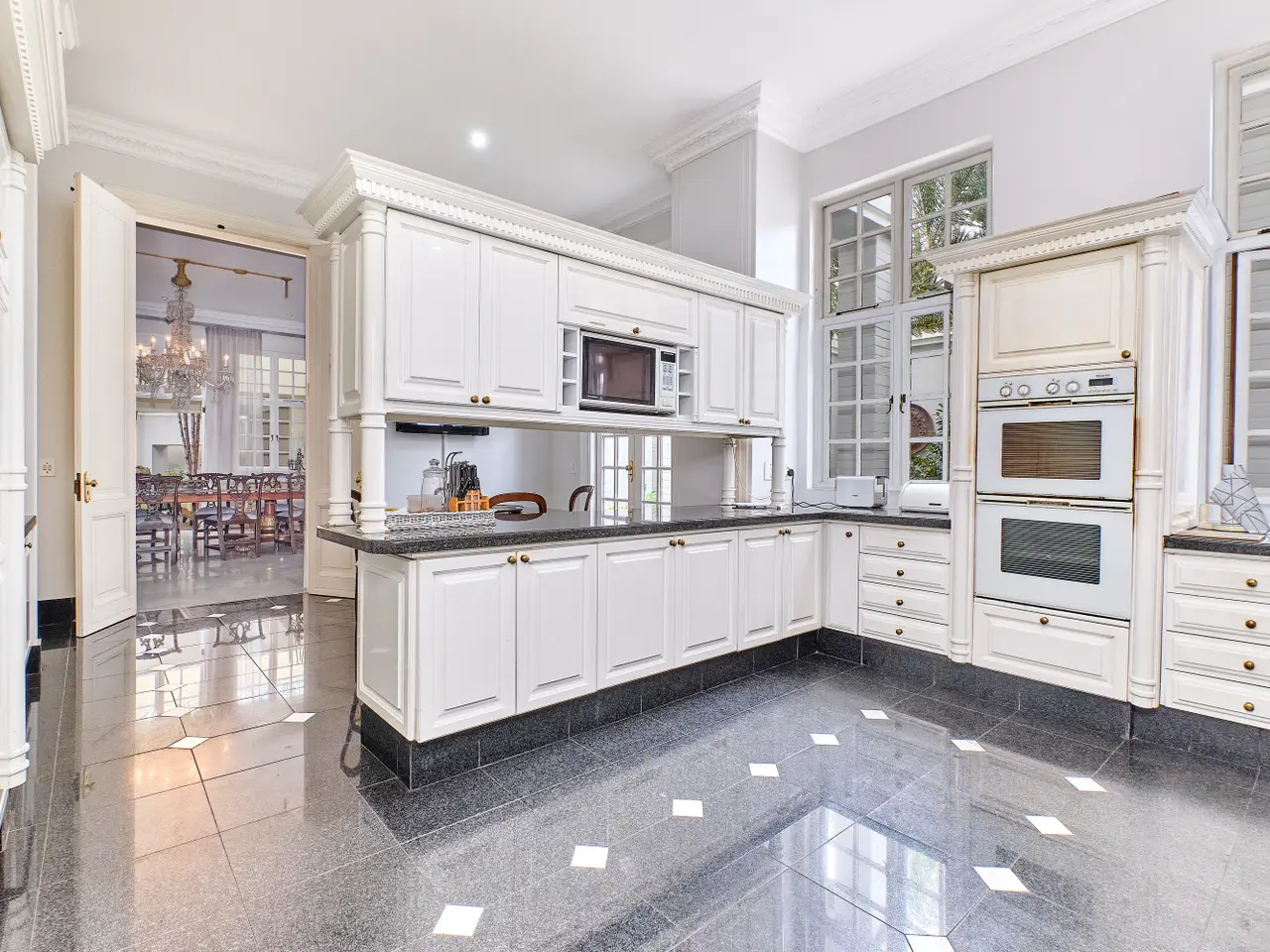 A timeless classic that evokes the graceful style of a London Chelsea townhouses. Situated in an exclusive private gated road with only 2 other homes, the experience is one of total privacy and safety. From the grand entrance hall complete with marble flooring and roman columns, through to the uninterrupted views of pool, patio and gardens, enhances ones first impression. With all the luxuries one would expect of a home of this quality, you will still be impressed with the sizable bedrooms suites, flow of the formal and casual living spaces, entertainers covered patio and pool courtyard. Truly a highlight of the home, is the owners private retreat consisting of a lounge with fireplace, his and her dressing rooms, and gym. The lounge, dining room and family room are all fitted with crystal chandeliers and fireplaces. Boasting 4 bedrooms suites, study, 3 reception rooms plus a breakfast room. Extras include underfloor heating throughout, water tanks, solar panels, battery/inverter, electric fencing plus good alarm system. 3 garages, 2 staff rooms.