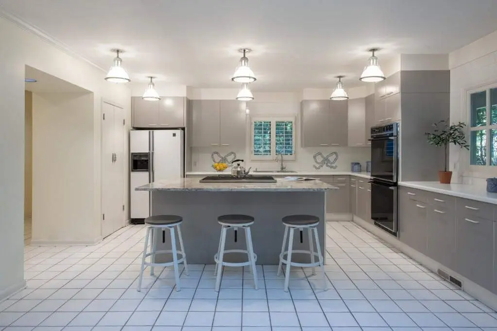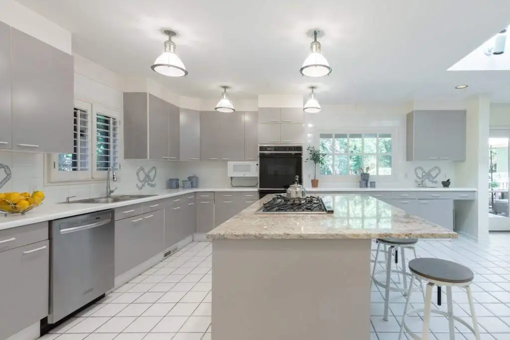 Expansive eat-in kitchen with wide windows overlooking backyard