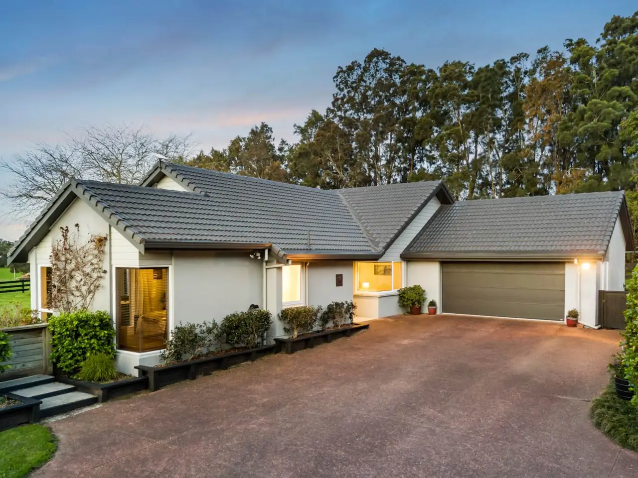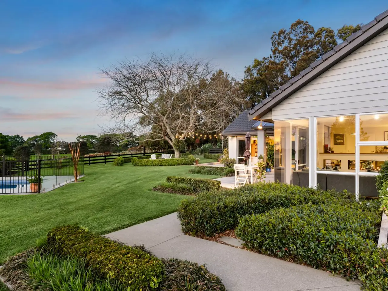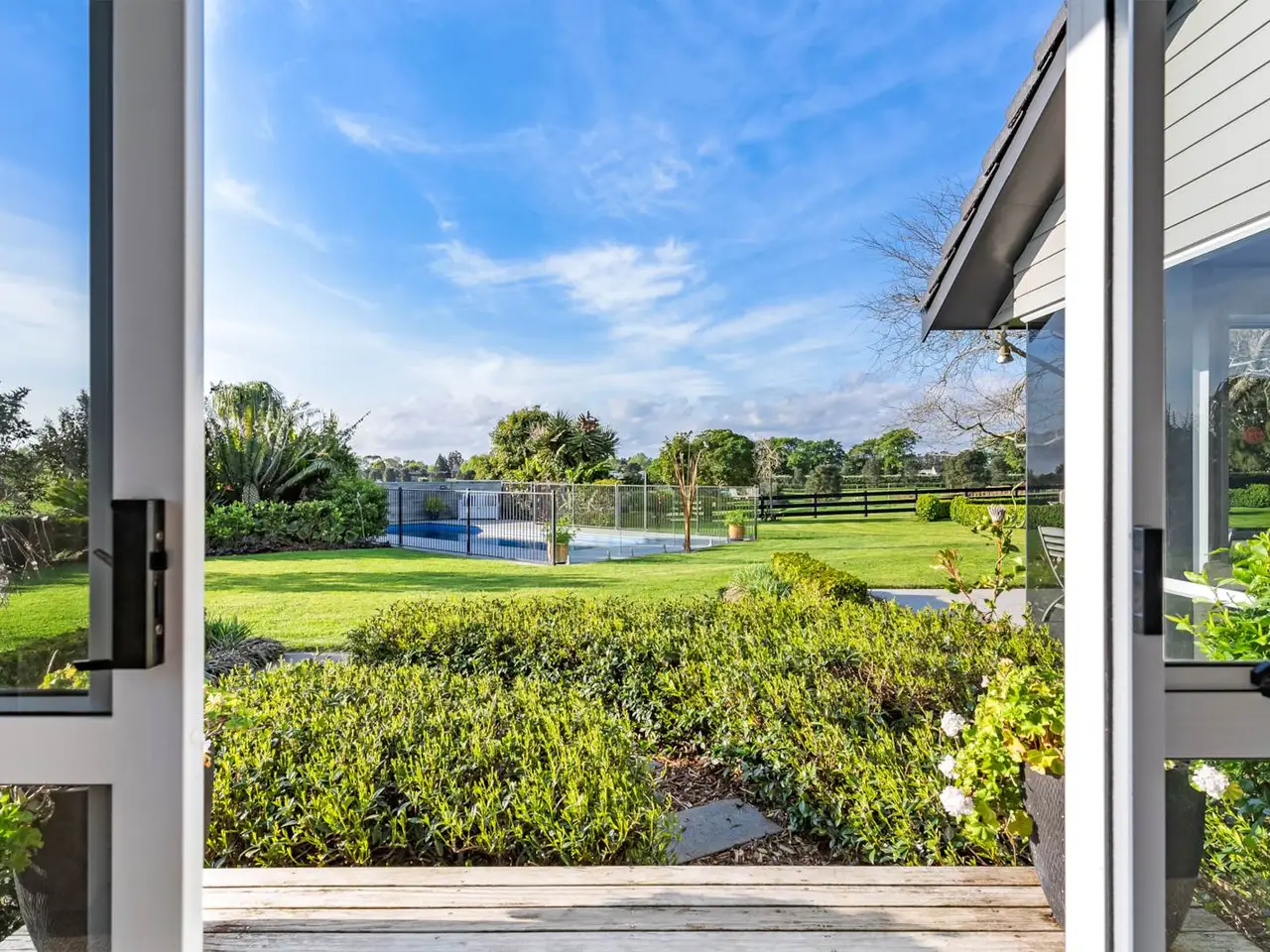 SUPERB GARDENS + COPIOUS SHEDDING & OFFICE The use of large windows with bi-fold and sliding doors throughout the expansive lounge, dining room and casual north-facing family living zones saturates this ultra-chic 240 square metre (approx) home with natural light. Immaculately maintained and occupying an elevated position on 3.57 hectares (8.94 acres) of gently contoured land in a highly desirable locale, this property keeps excellent company with high end neighbours and offers serene vistas of adjoining countryside and breathtaking sunsets. This spacious single-level residence is quality constructed with solid brick, a plaster and paint finish, and a concrete tile roof. Ornamental hedging, winter and spring flowering Magnolias, and Maples providing beautiful autumn colour in the flower borders are complemented by Liquidambar and Ginkgo trees, established native plantings including Kauri by the pond, Pohutukawa in the paddock, and tropical planting around the pool. These all form part of the superb, landscaped gardens, which also feature sweeping lawns and an entry driveway lined with an avenue of Awanui flowering cherry trees. The driveway widens to provide extra parking for vehicles of all sizes, including the marine carpeted double lock-up garage with internal home entry. Comfort assured, there’s a ventilation system throughout the home and heating is via a heat pump, gas fire and underfloor heating in most tiled areas. Practical and attractive floor tiles in the foyer continue throughout high traffic living areas morphing to carpet in the sunken lounge, partially separated by a feature two way gas fire. Adjoining casual dining, the light, bright kitchen features granite benchtops and abundant cabinetry, Bosch double oven, a gas cooktop, stainless steel appliances and breakfast bar. Clever use of colour here showcases several walls accenting the soaring cathedral ceiling and spilling out to sophisticated covered and open air entertaining on the extensive wrap-around paved patio – the perfect venue to relax, admire the gorgeous gardens and maybe watch the kids playing in the fully fenced 10m x 3.5m (approx) salt chlorinated solar heated pool with leisure surrounds – another lazy day location. Privately positioned, the luxurious master bedroom features a sliding door for enjoying outdoor evening breezes, a walk-in robe, and a sleek, recently updated ensuite with a glass tiled shower. Two further large scenic bedrooms also have built-in wardrobes and peaceful views. Generous built-in storage lines the hallway connecting the formal and informal areas, where the fourth bedroom sits alongside a stylish family bathroom featuring underfloor heating, a bath, and a glass-tiled shower. There’s a separate toilet and an excellent full laundry with storage and outdoor drying access just inside the immaculate garage with windows and glass door to the garden. Outside, there’s a spacious 12m x 8m (approx) high-stud shed complete with office, mezzanine storage, 3-phase power, and lighting. A 4.5m x 3.1m (approx) cottage or garden shed with verandah, perfect for a studio or hobbies, plus a lean-to which provides storage for farm equipment and an adjoining lock-up implement shed. A shipping container is also available for hay storage. The property includes five paddocks, a bore with drinking quality water, two orchard areas growing stone fruits, apples, citrus, berries, avocados, bananas, figs and feijoas, several vegetable gardens. These are complemented by native wetlands with a formed walkway throughout. Close to the motorway, shops and amenities and with schools in close proximity, this outstanding property offers a premium lifestyle in an idyllic setting. It’s time for our owners to downsize and we encourage your early inspection of this outstanding property. Contemporary solid brick 240m2 (approx) home on 3.57 hectares Excellent locale alongside elite neighbouring properties Elevated position with far reaching rural vistas & sunsets Scenic sunlit use of large windows, bi-fold & sliding doors Ventilation system, underfloor heating in most tiled areas Heat pump + ornamental 2 sided gas fire in living zone Plush drapes adorning prolific picture windows + views Sophisticated covered & open air entertaining & leisure Stylish lounge & dining rooms both opening to north patio Soaring cathedral ceiling. Appealing coloured feature walls Breakfast nook adjoining kitchen. Sliding door to patio Fully fenced 10m x 3.5m (approx) salt chlorinated solar heated pool +3 scenic bedrooms 2 spacious with built-in robes. Storage Luxe master bedroom/ensuite, walk-in robe & outdoor access Floor heated family bathroom with bath & tiled shower Toilet. Full laundry/storage/outdoor access in garage hall Immaculate sunlit marine carpeted double lock up garage Outside parking for large vehicles – campervan etc. 12m x 8m (approx) high stud shed + office & mezzanine storage 4.5m x 3.1m (approx) cottage, studio or garden shed with verandah Lean-to for farm equipment storage + Lock-up implement shed Shipping container for hay storage. Bore with drinking quality water Feature pond, home to assortment of beautiful birdlife Stunning native wetlands with a formed walkway Post & rail & wire & batten fencing. 5 paddocks. Two orchards/wide variety of fruits + vegetable gardens In zone for Te Hihi & Karaka School + Rosehill College Close to ACG Strathallan bus routes. 6km to Karaka Shops 6.5km to north & south motorway. 25km to Auckland Airport