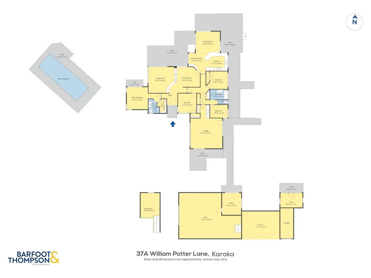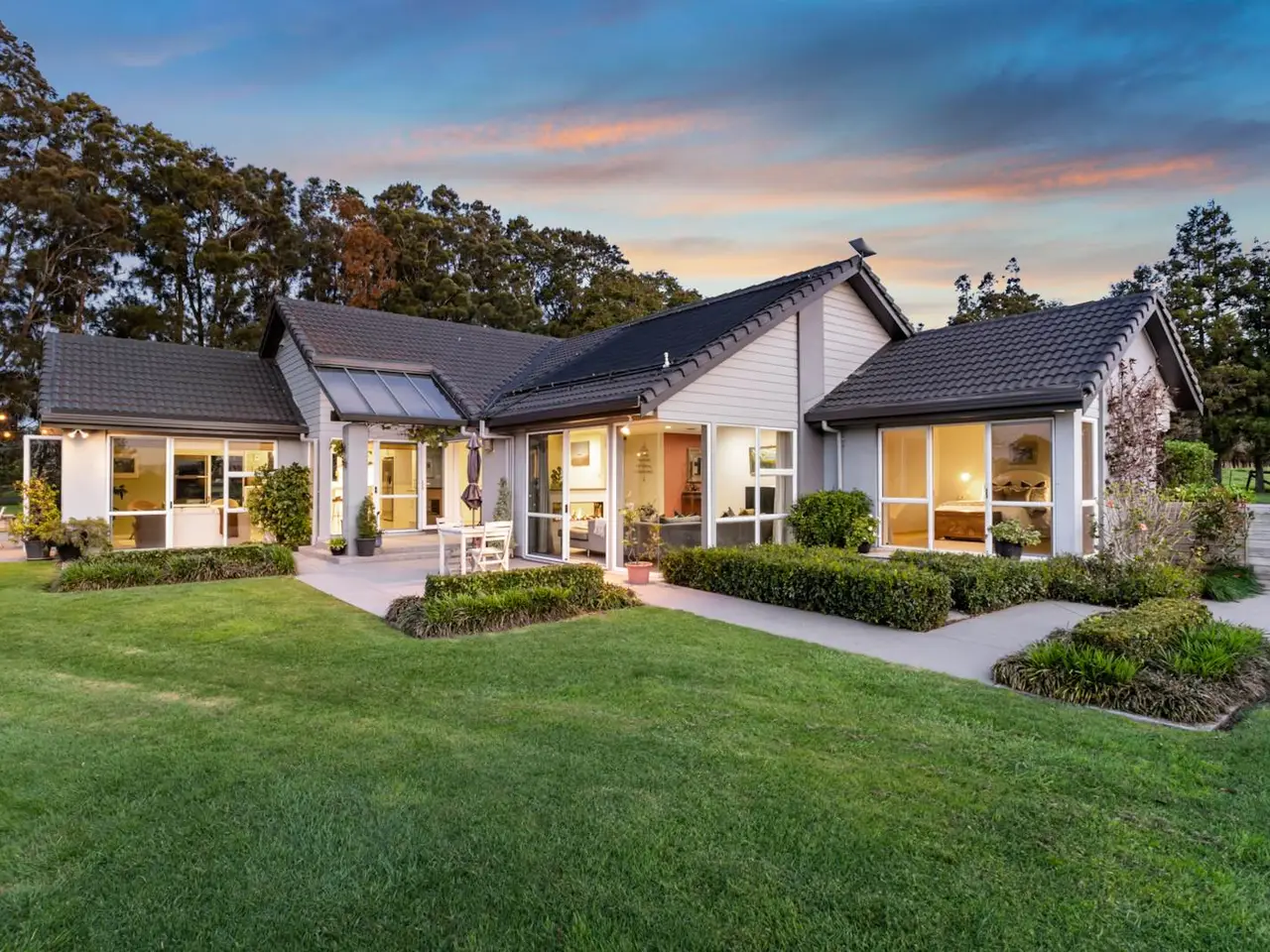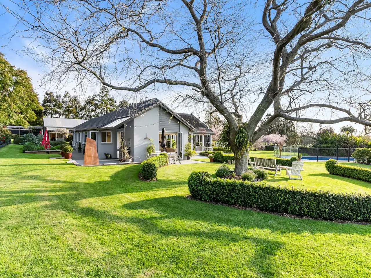 SUPERB GARDENS + COPIOUS SHEDDING & OFFICE The use of large windows with bi-fold and sliding doors throughout the expansive lounge, dining room and casual north-facing family living zones saturates this ultra-chic 240 square metre (approx) home with natural light. Immaculately maintained and occupying an elevated position on 3.57 hectares (8.94 acres) of gently contoured land in a highly desirable locale, this property keeps excellent company with high end neighbours and offers serene vistas of adjoining countryside and breathtaking sunsets. This spacious single-level residence is quality constructed with solid brick, a plaster and paint finish, and a concrete tile roof. Ornamental hedging, winter and spring flowering Magnolias, and Maples providing beautiful autumn colour in the flower borders are complemented by Liquidambar and Ginkgo trees, established native plantings including Kauri by the pond, Pohutukawa in the paddock, and tropical planting around the pool. These all form part of the superb, landscaped gardens, which also feature sweeping lawns and an entry driveway lined with an avenue of Awanui flowering cherry trees. The driveway widens to provide extra parking for vehicles of all sizes, including the marine carpeted double lock-up garage with internal home entry. Comfort assured, there’s a ventilation system throughout the home and heating is via a heat pump, gas fire and underfloor heating in most tiled areas. Practical and attractive floor tiles in the foyer continue throughout high traffic living areas morphing to carpet in the sunken lounge, partially separated by a feature two way gas fire. Adjoining casual dining, the light, bright kitchen features granite benchtops and abundant cabinetry, Bosch double oven, a gas cooktop, stainless steel appliances and breakfast bar. Clever use of colour here showcases several walls accenting the soaring cathedral ceiling and spilling out to sophisticated covered and open air entertaining on the extensive wrap-around paved patio – the perfect venue to relax, admire the gorgeous gardens and maybe watch the kids playing in the fully fenced 10m x 3.5m (approx) salt chlorinated solar heated pool with leisure surrounds – another lazy day location. Privately positioned, the luxurious master bedroom features a sliding door for enjoying outdoor evening breezes, a walk-in robe, and a sleek, recently updated ensuite with a glass tiled shower. Two further large scenic bedrooms also have built-in wardrobes and peaceful views. Generous built-in storage lines the hallway connecting the formal and informal areas, where the fourth bedroom sits alongside a stylish family bathroom featuring underfloor heating, a bath, and a glass-tiled shower. There’s a separate toilet and an excellent full laundry with storage and outdoor drying access just inside the immaculate garage with windows and glass door to the garden. Outside, there’s a spacious 12m x 8m (approx) high-stud shed complete with office, mezzanine storage, 3-phase power, and lighting. A 4.5m x 3.1m (approx) cottage or garden shed with verandah, perfect for a studio or hobbies, plus a lean-to which provides storage for farm equipment and an adjoining lock-up implement shed. A shipping container is also available for hay storage. The property includes five paddocks, a bore with drinking quality water, two orchard areas growing stone fruits, apples, citrus, berries, avocados, bananas, figs and feijoas, several vegetable gardens. These are complemented by native wetlands with a formed walkway throughout. Close to the motorway, shops and amenities and with schools in close proximity, this outstanding property offers a premium lifestyle in an idyllic setting. It’s time for our owners to downsize and we encourage your early inspection of this outstanding property. Contemporary solid brick 240m2 (approx) home on 3.57 hectares Excellent locale alongside elite neighbouring properties Elevated position with far reaching rural vistas & sunsets Scenic sunlit use of large windows, bi-fold & sliding doors Ventilation system, underfloor heating in most tiled areas Heat pump + ornamental 2 sided gas fire in living zone Plush drapes adorning prolific picture windows + views Sophisticated covered & open air entertaining & leisure Stylish lounge & dining rooms both opening to north patio Soaring cathedral ceiling. Appealing coloured feature walls Breakfast nook adjoining kitchen. Sliding door to patio Fully fenced 10m x 3.5m (approx) salt chlorinated solar heated pool +3 scenic bedrooms 2 spacious with built-in robes. Storage Luxe master bedroom/ensuite, walk-in robe & outdoor access Floor heated family bathroom with bath & tiled shower Toilet. Full laundry/storage/outdoor access in garage hall Immaculate sunlit marine carpeted double lock up garage Outside parking for large vehicles – campervan etc. 12m x 8m (approx) high stud shed + office & mezzanine storage 4.5m x 3.1m (approx) cottage, studio or garden shed with verandah Lean-to for farm equipment storage + Lock-up implement shed Shipping container for hay storage. Bore with drinking quality water Feature pond, home to assortment of beautiful birdlife Stunning native wetlands with a formed walkway Post & rail & wire & batten fencing. 5 paddocks. Two orchards/wide variety of fruits + vegetable gardens In zone for Te Hihi & Karaka School + Rosehill College Close to ACG Strathallan bus routes. 6km to Karaka Shops 6.5km to north & south motorway. 25km to Auckland Airport