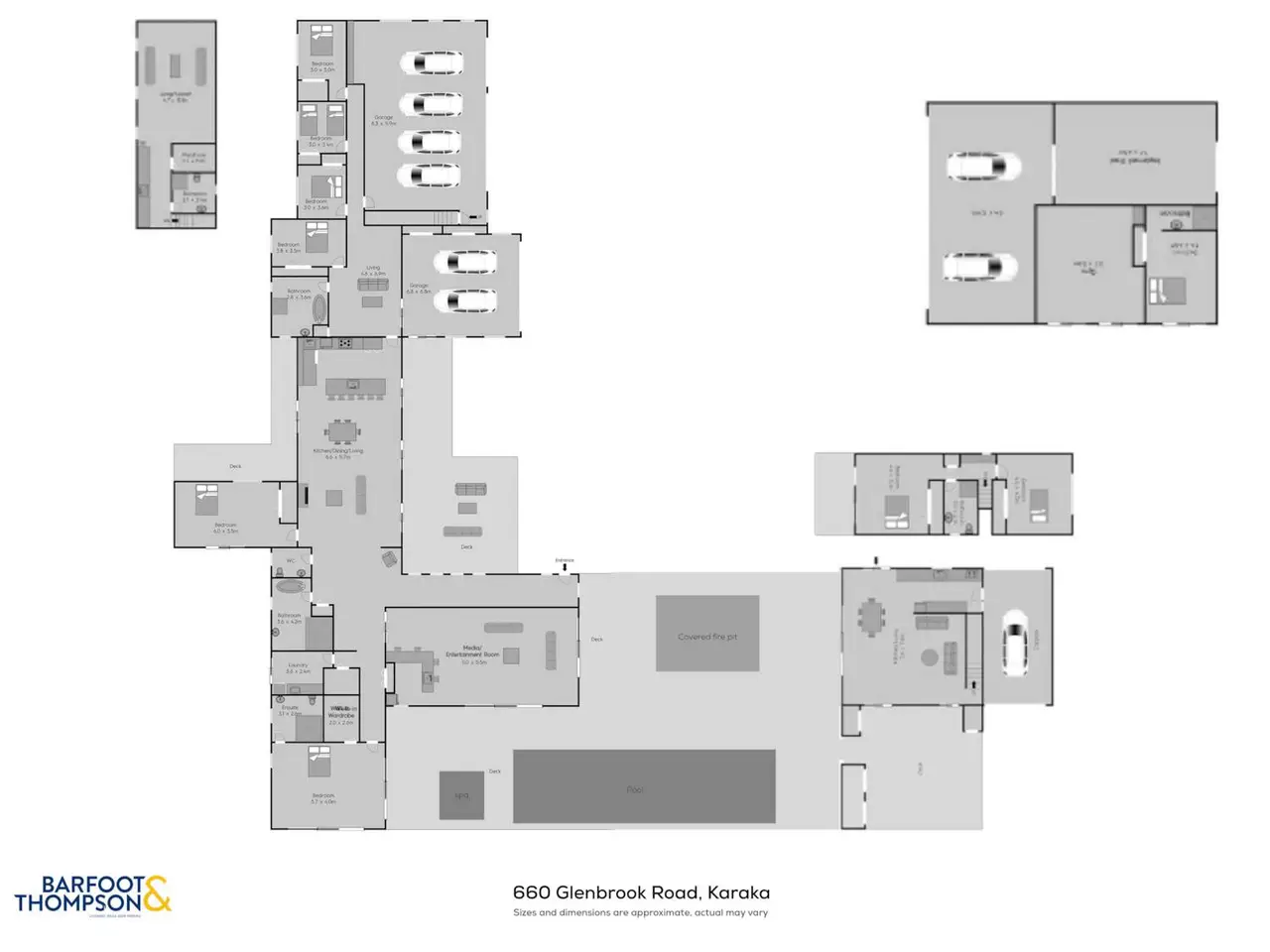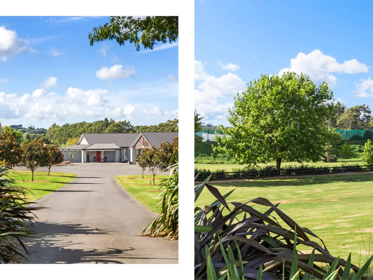 Located in the quiet Franklin community of Kingseat, neighbouring Karaka & Patumahoe village, no detail has been overlooked or expense spared in the creation of this magnificent north-facing solid masonry home of grand proportions and its additional independent living facilities. Set on 3.48 hectares/8.6 acres in a sought after locale and boasting fine fittings and fixtures, this huge premium quality 596 square metre (approx) residence incorporates six bedrooms comprising the sumptuous, privately positioned master bedroom with large walk-in robe, chic ensuite and access to two decks, scenic vistas and gentle evening breezes. The further five sunlit bedrooms, all with built-in wardrobes and tranquil views, share a bathroom with free-standing bath and shower. Thoughtful design is evident with one living room strategically placed in the dormitory wing for use as a study/rumpus room for the youngsters. There’s a separate powder room, a large well-appointed laundry with outdoor access and excellent storage provision. Centrally located, the modern kitchen basks in light-filled reflective surfaces with glossy tiled floors, granite benchtops, expansive cabinetry and quality stainless steel appliances. Super-spacious sophisticated family living and dining adjoin unsurpassed entertaining facilities with a massive media/entertainment room spilling out to ultra-large louvre-covered pergola and Kwila decks wrapping around idyllic leisure in the heated mineral swimming pool and spa and around the covered fire-pit. There’s a carport plus internal entry garaging for six cars with a man cave plus bar and bathroom above and, on the opposite side of the pool, an impeccable 155 square metre (approx) fully equipped two bedroom pool house stands ready to lavishly accommodate visitors. Further along the property there’s also a 130 square metre (approx) barn with a gym room, a living room with shower and an implement shed and still so much space for further development if desired. Ducted air conditioning, security system, water tanks etc. There’s absolutely nothing to need in this super-sized, superbly equipped modern mansion.• Massive north-facing 596m2 (approx) mansion set on 3.48 ha/8.6 acre• Impressive gated entry. Security system. Prestige locale• Ducted air con. Fine fittings & fixtures throughout• Rumpus/study/ lounge room adjoining dormitory zone• Sunlit open plan living & dining spilling out to Kwila decks• Chic quality modern kitchen with granite benchtops• Huge entertainment room opening to Kwila decks• Lavish master bedroom, walk-in robe, ensuite & deck access• + 5 scenic spacious bedrooms, some flowing outdoors• Sleek family bathroom with free-standing bath & shower• Powder room. Large laundry + outdoor access. Storage• Vast expanse of Kwila decks. Motorised louvred pergolas• Stunning heated mineral pool & spa + covered fire pit• 6 car garaging. Internal entry. Man cave with bathroom• Impeccable fully self-contained 2 bedroom pool house• 130m2 (approx) shed. Gym room & bathroom. Storage room• 4 carports. Extra parking. 3 phase power. 84,000L tanks• 13 km to Southern motorway on-ramp• Just 12 km to Pukekohe township & community facilities• Close proximity to Patumahoe School & Strathallan bus route Auction: 177 King Street, Pukekohe (Branch Office) on Thursday 20 November 2025 at 2:00PM (unless sold prior)