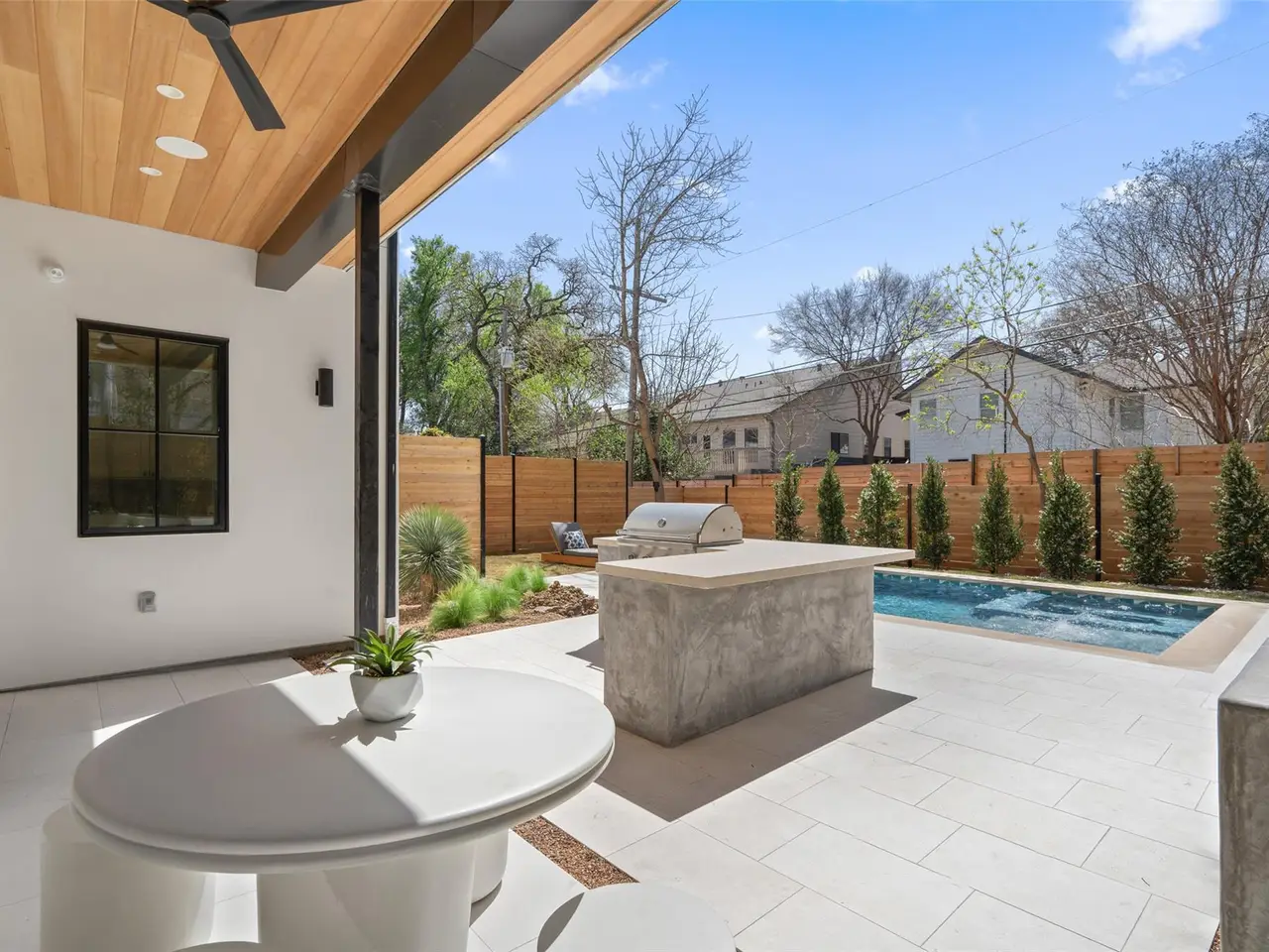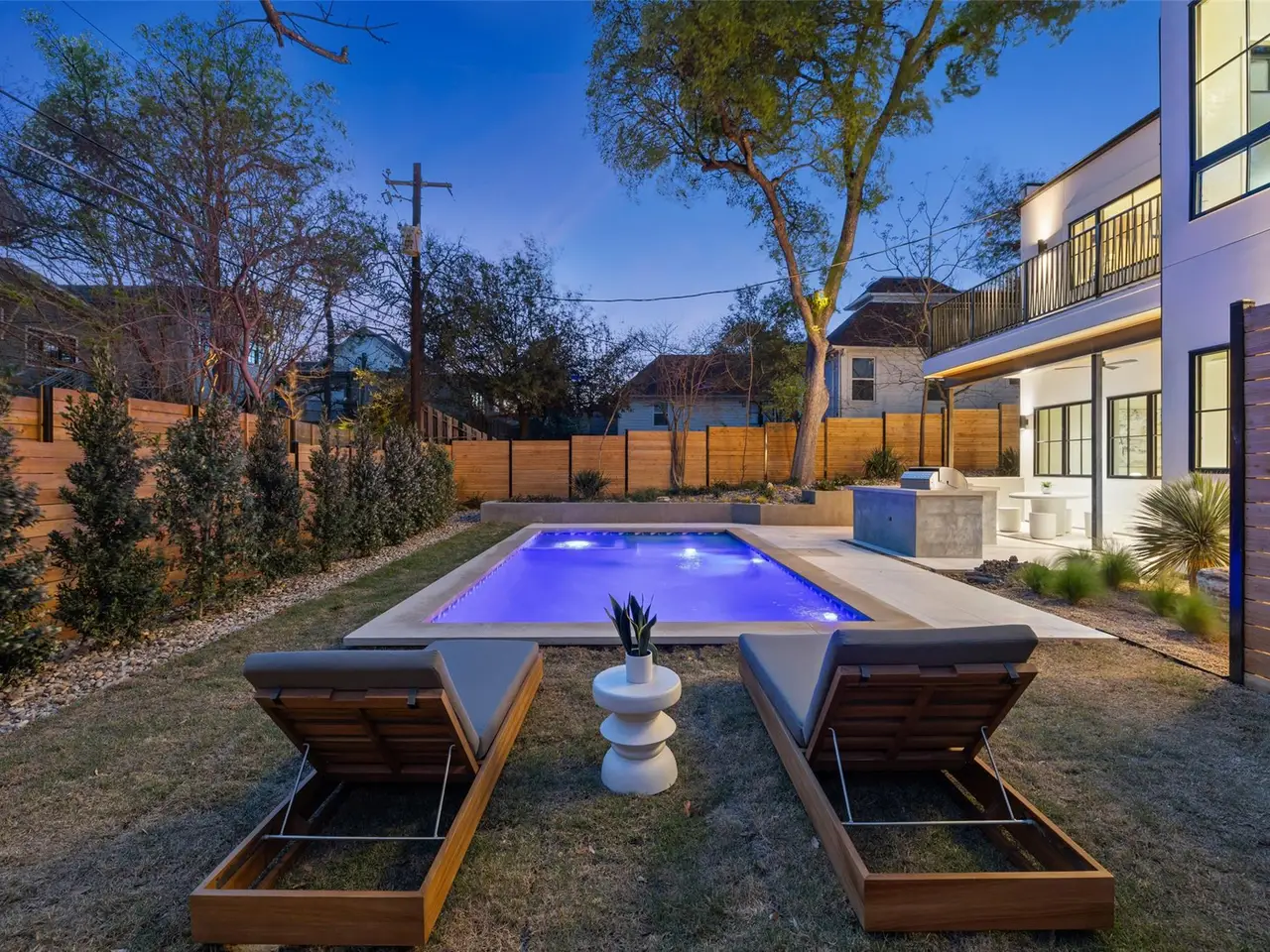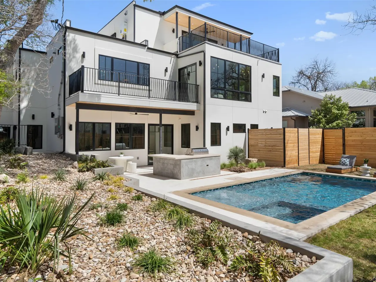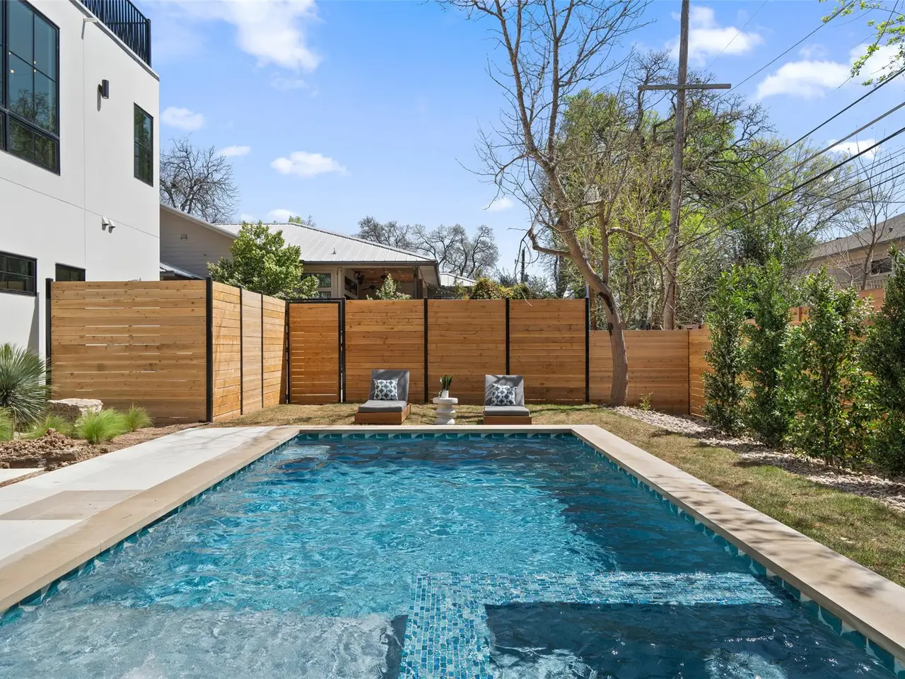 An architectural masterpiece by the Kalantari Group that redefines modern luxury in the heart of Tarrytown. With striking curb appeal and impeccable craftsmanship, this thoughtfully designed home exudes sophistication in every detail. The open-concept layout is bathed in natural light, enhanced by floor-to-ceiling windows that create a seamless connection between indoor and outdoor living. Elegance radiates throughout the home, from the European white oak hardwood floors to the custom rift-cut white oak cabinetry. The chef's kitchen is a work of art, featuring Taj Mahal quartzite countertops, a fully paneled JennAir Signature appliance package, and a butler's pantry with an additional Bosch refrigerator. The bar area offers another built-in Bosch fridge & seamless access to the outdoor living area, perfect for entertaining. A stunning floating staircase with European oak risers adds to the home's modern aesthetic, while hand-plastered walls provide an artisan touch. The primary suite is a private retreat, boasting a spa-inspired bath adorned with Miraval full granite, a Mr. Steam iTempo unit, and a custom-built walk-in closet. Two laundry areas, including one conveniently located in the primary suite, offer effortless functionality. Outdoors, a shell beige limestone patio extends to the rear pool deck, where a Cascade custom pool and heated spa create a resort-like atmosphere. Two expansive balconies, along with a 500-square-foot usable flat roof, provide additional space to relax and take in the surroundings. An outdoor kitchen, complete with a built-in Coyote high-performance grill, makes alfresco dining a breeze. Located just off Loop 1 and only 10 minutes from downtown Austin, this home offers both tranquility and convenience. Enjoy being within walking distance of Littlefield's Tacos + Coffee and Tarrytown Neighborhood Park while having effortless access to the best that Austin has to offer.