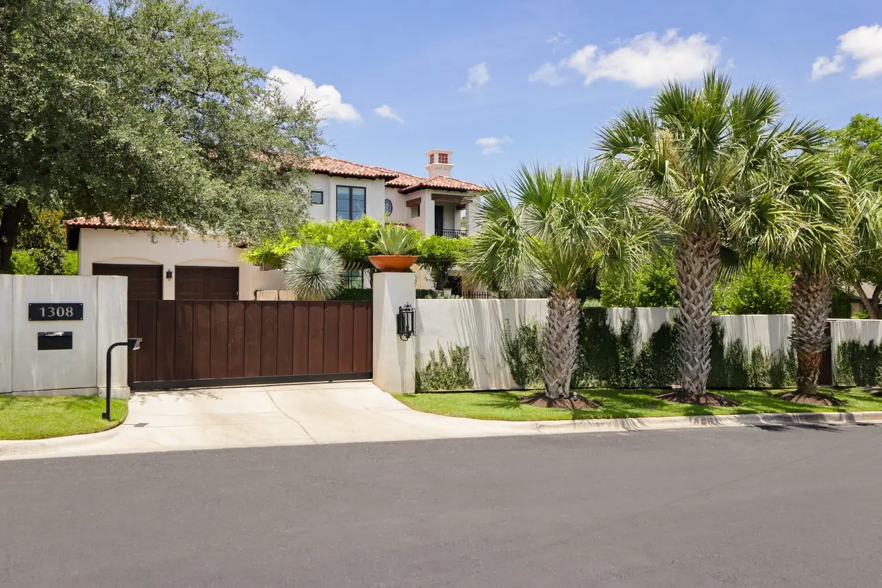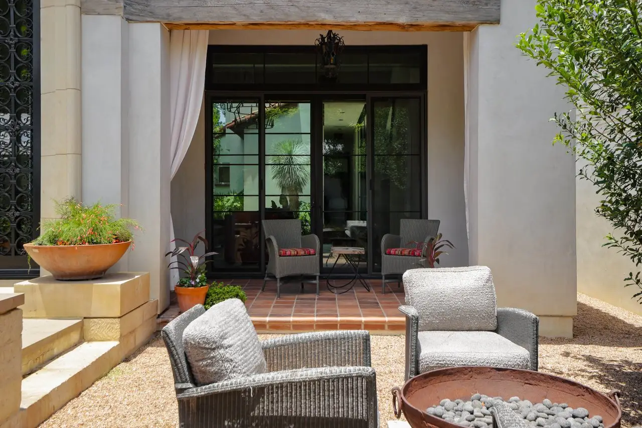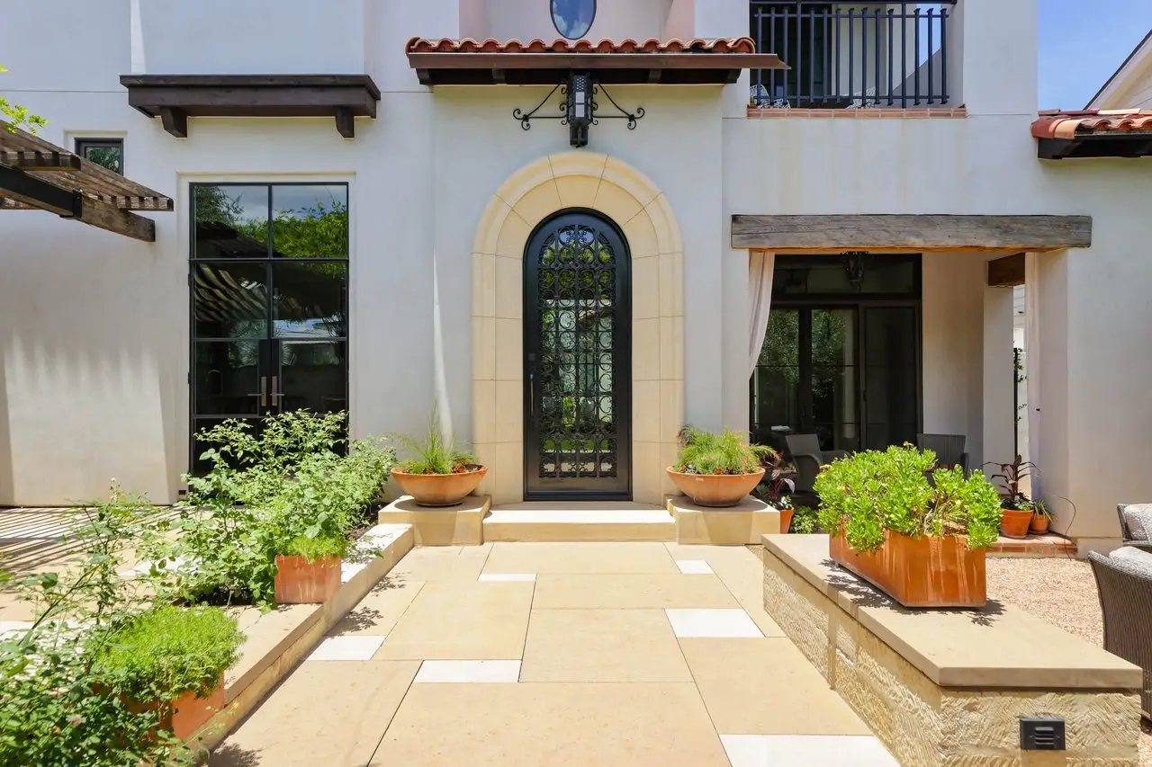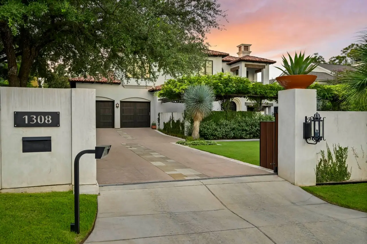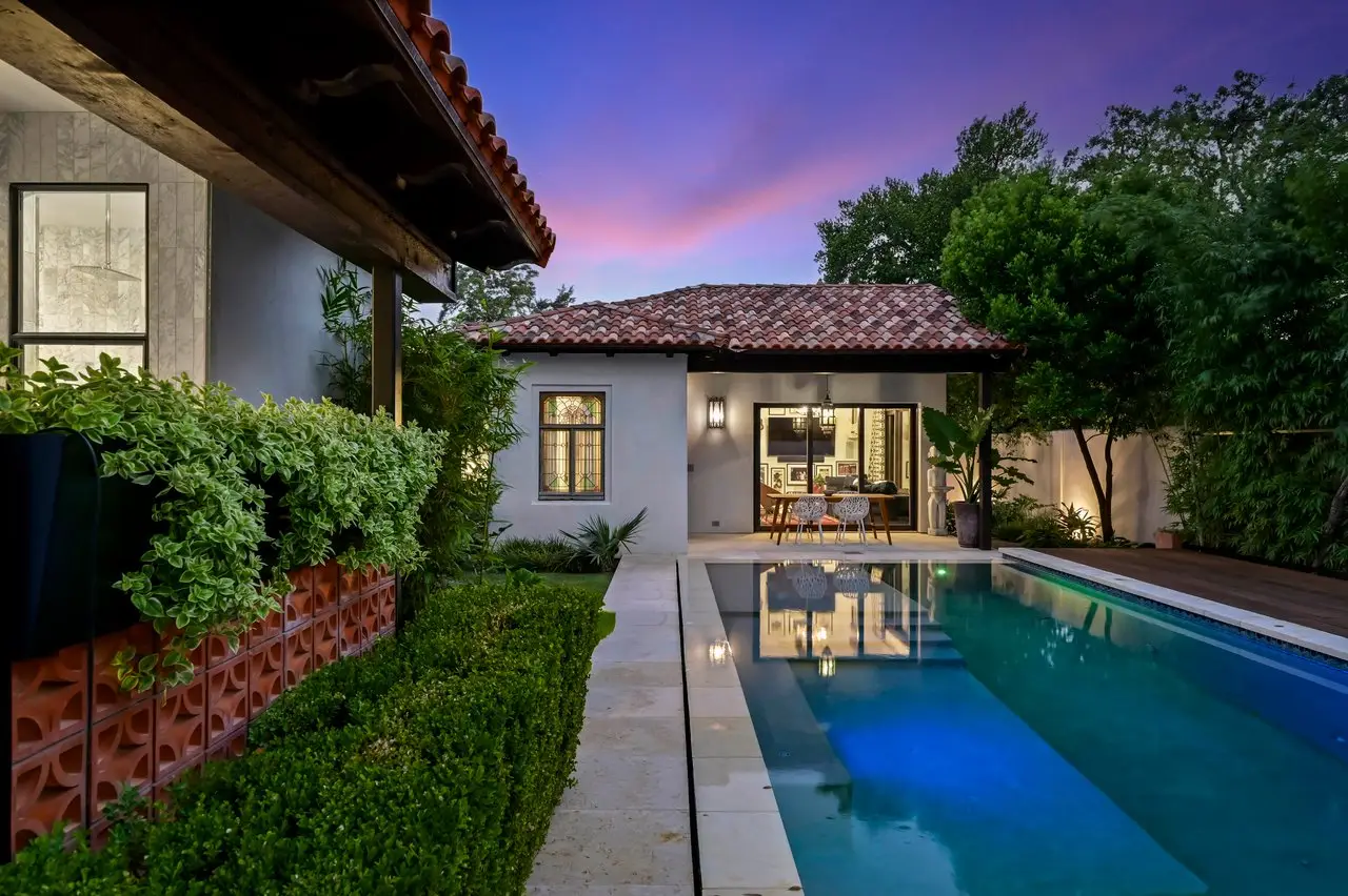 Magnificent Spanish Colonial Revival-Style Estate in West Enfield Tucked behind a private gate on a third of an acre in the historic West Enfield Neighborhood, 1308 Meriden Lane is a striking example of Spanish Colonial Revival architecture blended with contemporary elements in one of Austin’s most iconic neighborhoods. With its LaHabra stucco exterior, clay tile roof by Claymex, and multiple landscaped courtyards, this five-bedroom, five-and-a-half-bath estate offers timeless design and resort-style living just minutes from downtown. A winding entry leads to the heart of the home—an artful J-shaped two-story residence connected by a showstopping glass bridge made of Portella steel. Nearly every room is designed with views and access to the outdoors, offering a seamless transition between indoor elegance and al fresco ease. A dramatic front courtyard invites lounging and dining beneath the gas lanterns, surrounded by two hand-carved Texas Walnut limestone fountains and lush, colorful landscaping. Inside, the home reflects a thoughtful interplay of natural light, texture, and craftsmanship. Historic, reclaimed hand-hewn beams, antique and found lighting, and handcrafted details like the oversized carved stone fireplace and Wendel Brousard's custom primary bedroom door add depth and warmth to every space. The floors are layered with Old Growth Gunstock Walnut and Saltillo tile, with vibrant Mexican tile risers and caustic tile on the primary patio. Five dedicated living areas, including an upper-level lounge wrapped in hand-painted wallpaper, offer flexibility for both retreat and entertaining. In the primary suite, a spa-like bathroom opens to an indoor/outdoor shower, while the cabana pool house features a custom bar and vintage church window over 100 years old, blending history with modern luxury. Additional highlights include a rare glass-enclosed, backlit garage with room for 4–6 vehicles, an auto lift, and custom steel and wood detailing throughout—from the front door to the patio curtain rods (and a subterranean shelter). A whole-house vacuum system runs through both the home and garage, and Thermador appliances, motorized shades, Farrow & Ball paint, and custom decorative windows elevate the finish-out. With its sun-soaked Ipe wood pool deck, hidden storage areas, Rondel-stained glass windows, and sophisticated yet inviting style, 1308 Meriden Lane is a masterclass in curated living, offering the best of Old Austin charm and modern refinement.