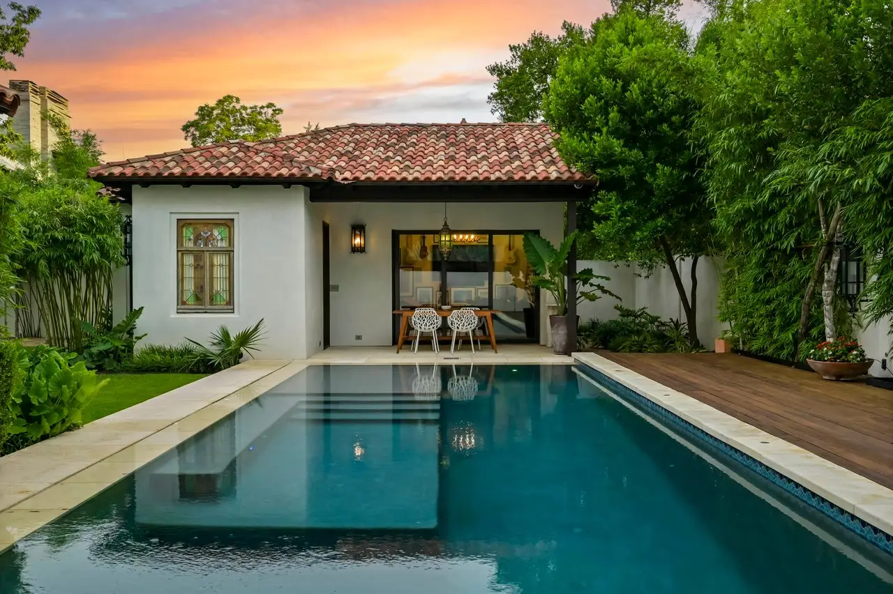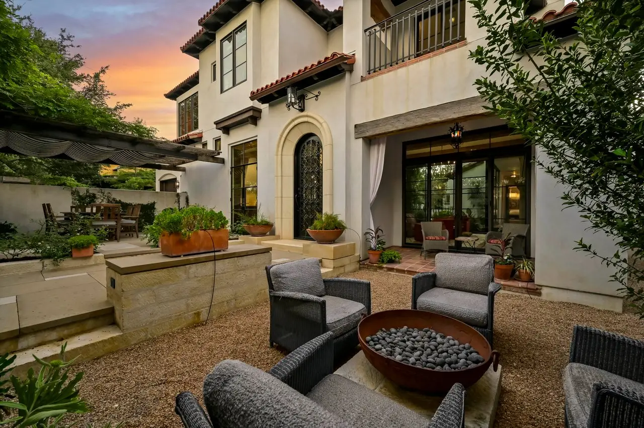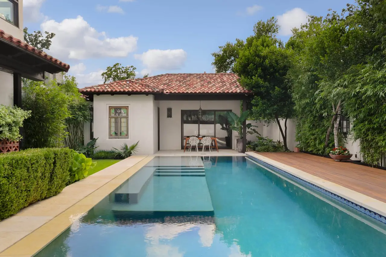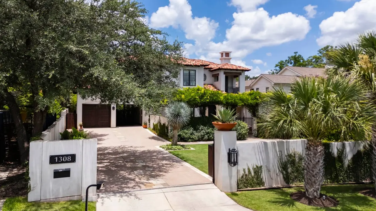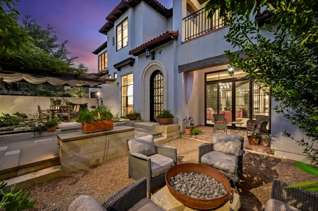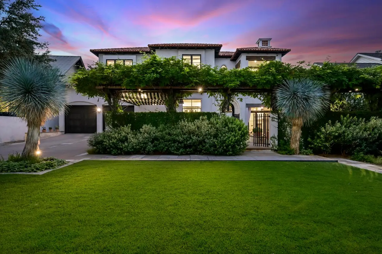 Magnificent Spanish Colonial Revival-Style Estate in West Enfield Tucked behind a private gate on a third of an acre in the historic West Enfield Neighborhood, 1308 Meriden Lane is a striking example of Spanish Colonial Revival architecture blended with contemporary elements in one of Austin’s most iconic neighborhoods. With its LaHabra stucco exterior, clay tile roof by Claymex, and multiple landscaped courtyards, this five-bedroom, five-and-a-half-bath estate offers timeless design and resort-style living just minutes from downtown. A winding entry leads to the heart of the home—an artful J-shaped two-story residence connected by a showstopping glass bridge made of Portella steel. Nearly every room is designed with views and access to the outdoors, offering a seamless transition between indoor elegance and al fresco ease. A dramatic front courtyard invites lounging and dining beneath the gas lanterns, surrounded by two hand-carved Texas Walnut limestone fountains and lush, colorful landscaping. Inside, the home reflects a thoughtful interplay of natural light, texture, and craftsmanship. Historic, reclaimed hand-hewn beams, antique and found lighting, and handcrafted details like the oversized carved stone fireplace and Wendel Brousard's custom primary bedroom door add depth and warmth to every space. The floors are layered with Old Growth Gunstock Walnut and Saltillo tile, with vibrant Mexican tile risers and caustic tile on the primary patio. Five dedicated living areas, including an upper-level lounge wrapped in hand-painted wallpaper, offer flexibility for both retreat and entertaining. In the primary suite, a spa-like bathroom opens to an indoor/outdoor shower, while the cabana pool house features a custom bar and vintage church window over 100 years old, blending history with modern luxury. Additional highlights include a rare glass-enclosed, backlit garage with room for 4–6 vehicles, an auto lift, and custom steel and wood detailing throughout—from the front door to the patio curtain rods (and a subterranean shelter). A whole-house vacuum system runs through both the home and garage, and Thermador appliances, motorized shades, Farrow & Ball paint, and custom decorative windows elevate the finish-out. With its sun-soaked Ipe wood pool deck, hidden storage areas, Rondel-stained glass windows, and sophisticated yet inviting style, 1308 Meriden Lane is a masterclass in curated living, offering the best of Old Austin charm and modern refinement.