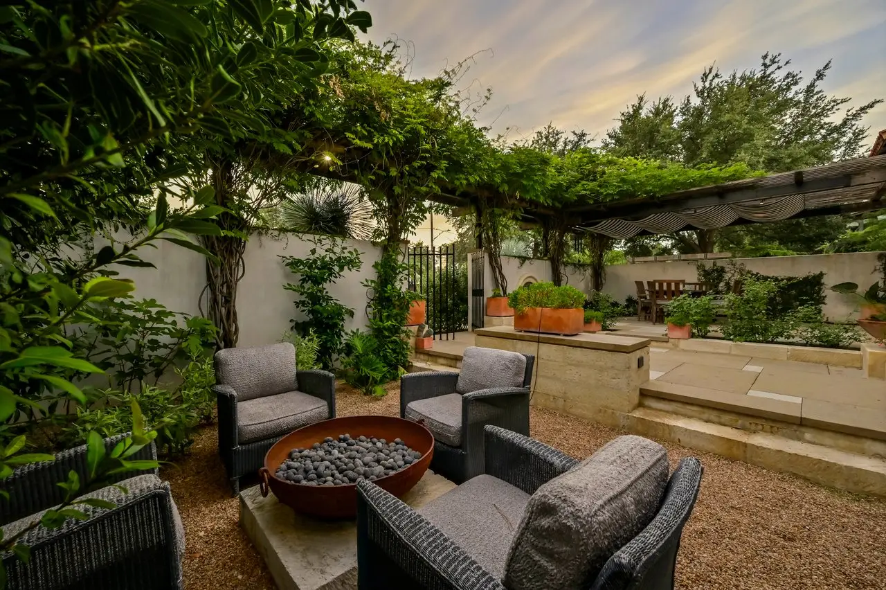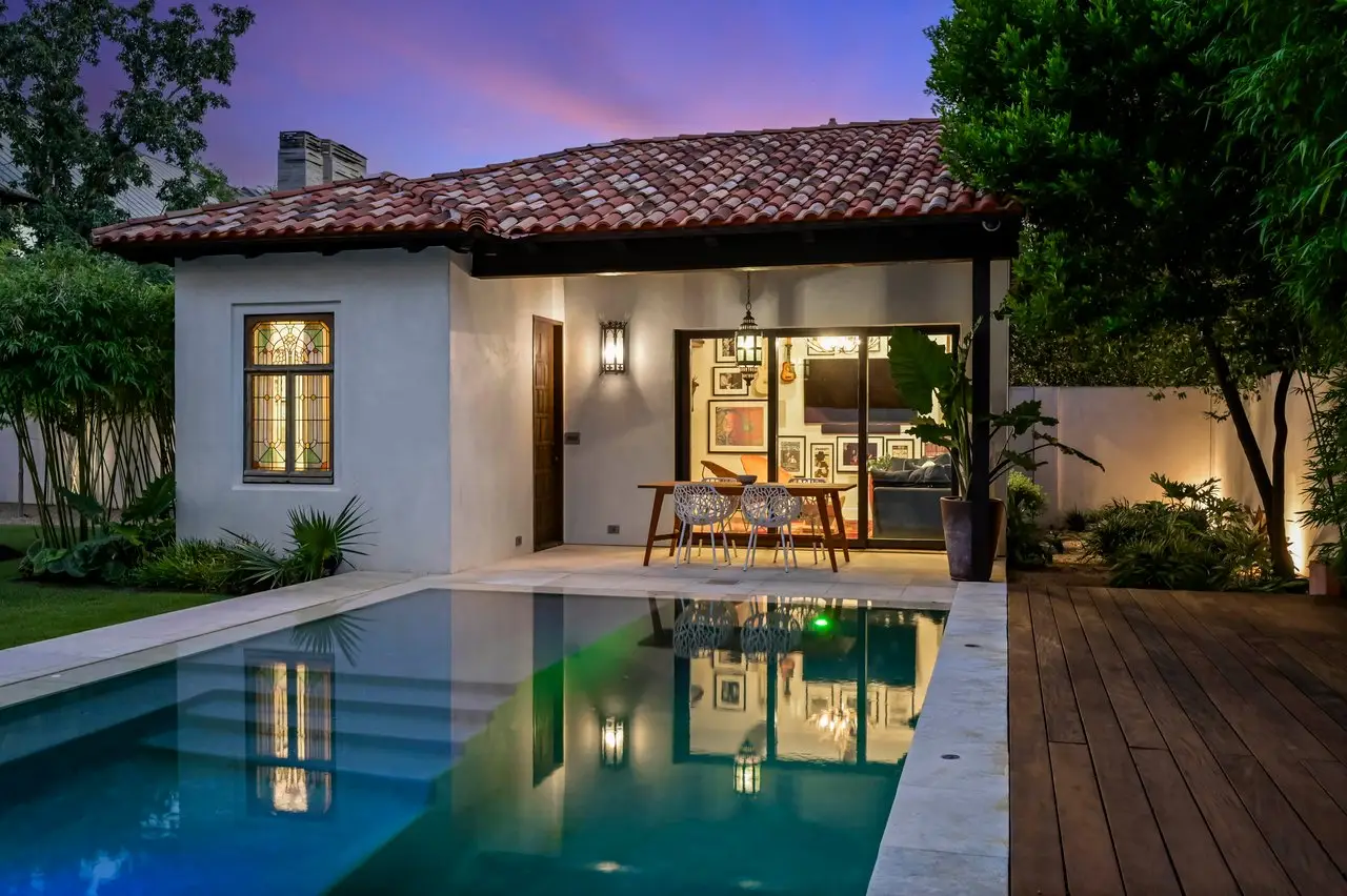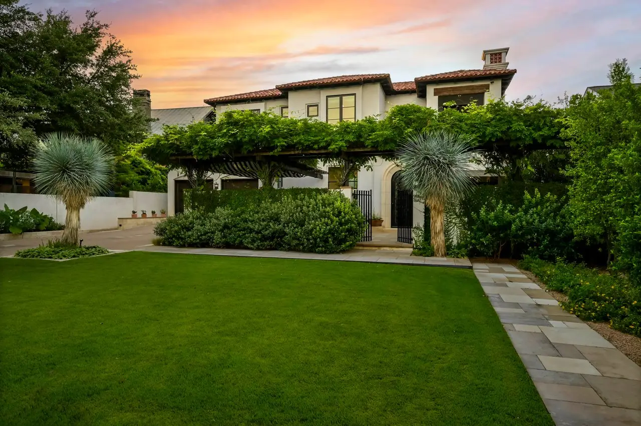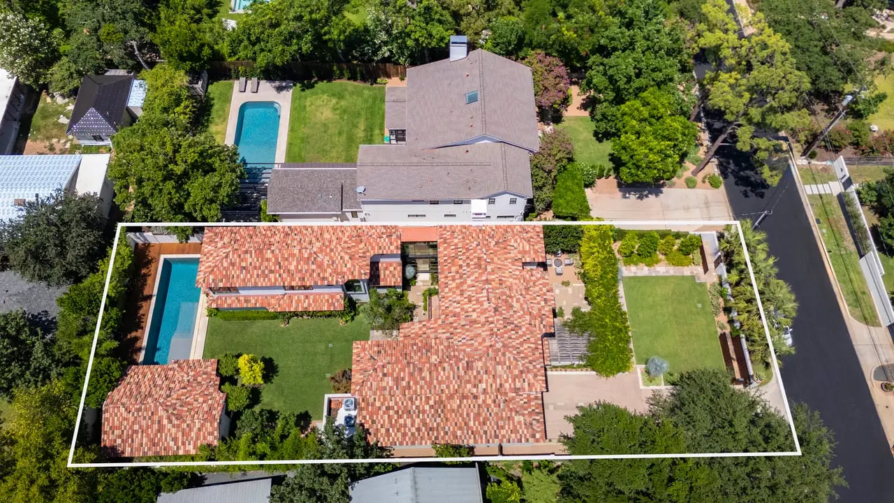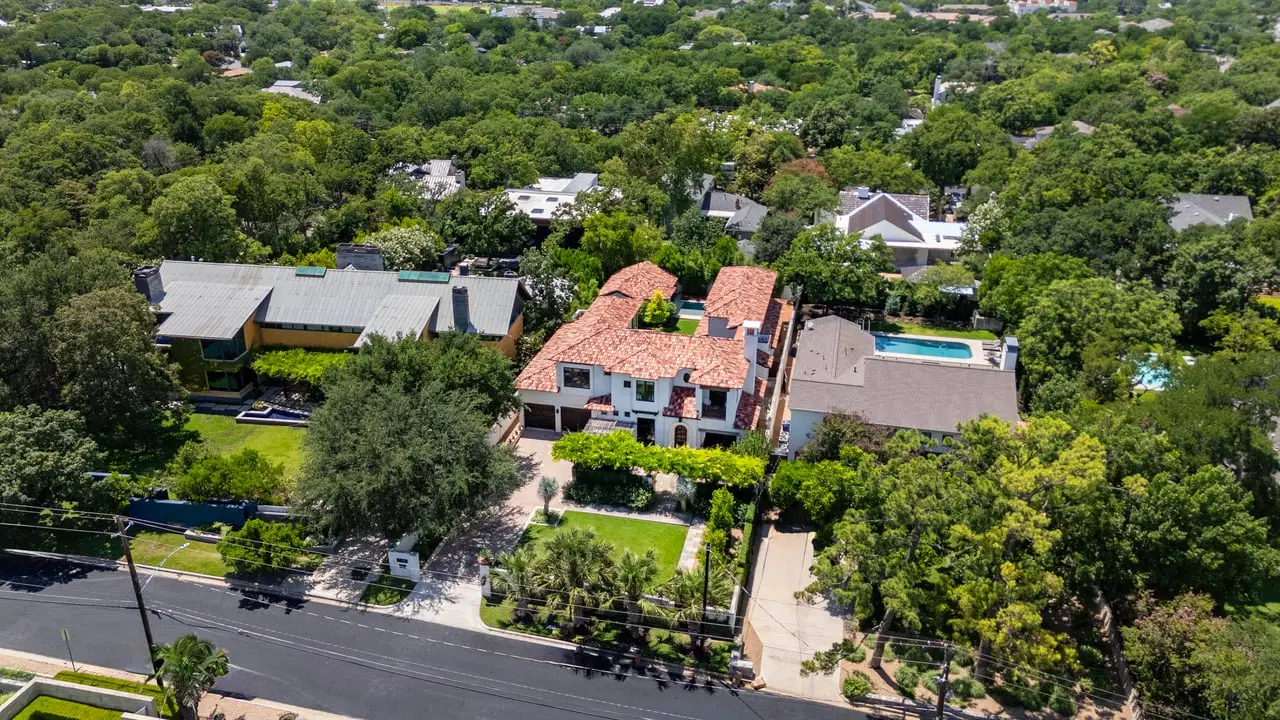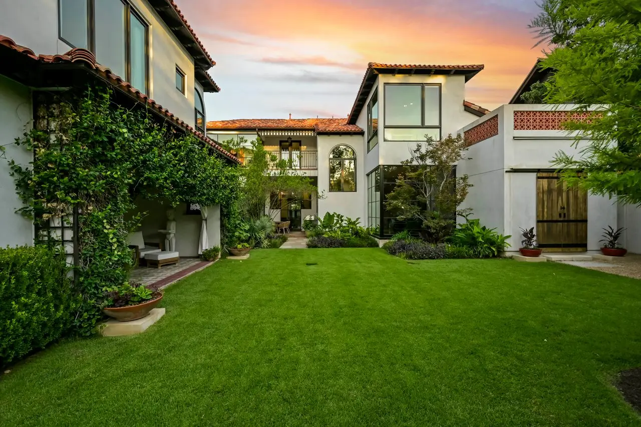 Magnificent Spanish Colonial Revival-Style Estate in West Enfield Tucked behind a private gate on a third of an acre in the historic West Enfield Neighborhood, 1308 Meriden Lane is a striking example of Spanish Colonial Revival architecture blended with contemporary elements in one of Austin’s most iconic neighborhoods. With its LaHabra stucco exterior, clay tile roof by Claymex, and multiple landscaped courtyards, this five-bedroom, five-and-a-half-bath estate offers timeless design and resort-style living just minutes from downtown. A winding entry leads to the heart of the home—an artful J-shaped two-story residence connected by a showstopping glass bridge made of Portella steel. Nearly every room is designed with views and access to the outdoors, offering a seamless transition between indoor elegance and al fresco ease. A dramatic front courtyard invites lounging and dining beneath the gas lanterns, surrounded by two hand-carved Texas Walnut limestone fountains and lush, colorful landscaping. Inside, the home reflects a thoughtful interplay of natural light, texture, and craftsmanship. Historic, reclaimed hand-hewn beams, antique and found lighting, and handcrafted details like the oversized carved stone fireplace and Wendel Brousard's custom primary bedroom door add depth and warmth to every space. The floors are layered with Old Growth Gunstock Walnut and Saltillo tile, with vibrant Mexican tile risers and caustic tile on the primary patio. Five dedicated living areas, including an upper-level lounge wrapped in hand-painted wallpaper, offer flexibility for both retreat and entertaining. In the primary suite, a spa-like bathroom opens to an indoor/outdoor shower, while the cabana pool house features a custom bar and vintage church window over 100 years old, blending history with modern luxury. Additional highlights include a rare glass-enclosed, backlit garage with room for 4–6 vehicles, an auto lift, and custom steel and wood detailing throughout—from the front door to the patio curtain rods (and a subterranean shelter). A whole-house vacuum system runs through both the home and garage, and Thermador appliances, motorized shades, Farrow & Ball paint, and custom decorative windows elevate the finish-out. With its sun-soaked Ipe wood pool deck, hidden storage areas, Rondel-stained glass windows, and sophisticated yet inviting style, 1308 Meriden Lane is a masterclass in curated living, offering the best of Old Austin charm and modern refinement.