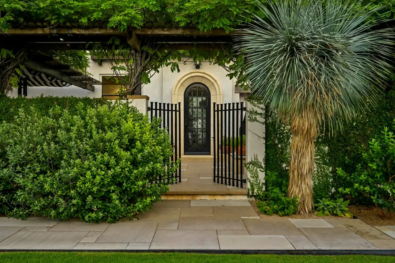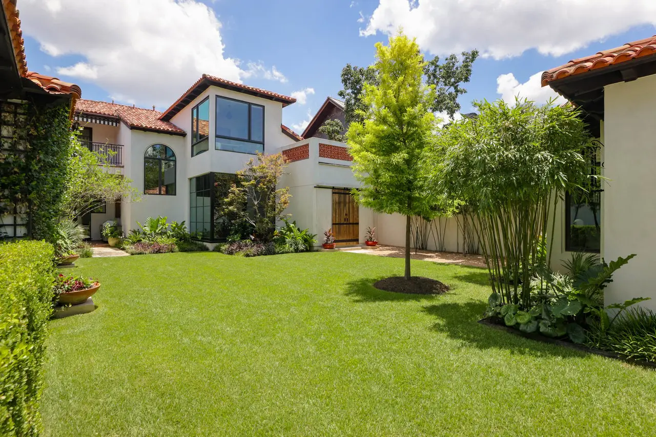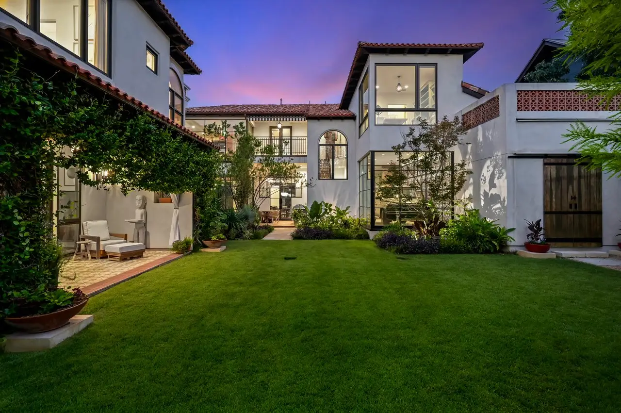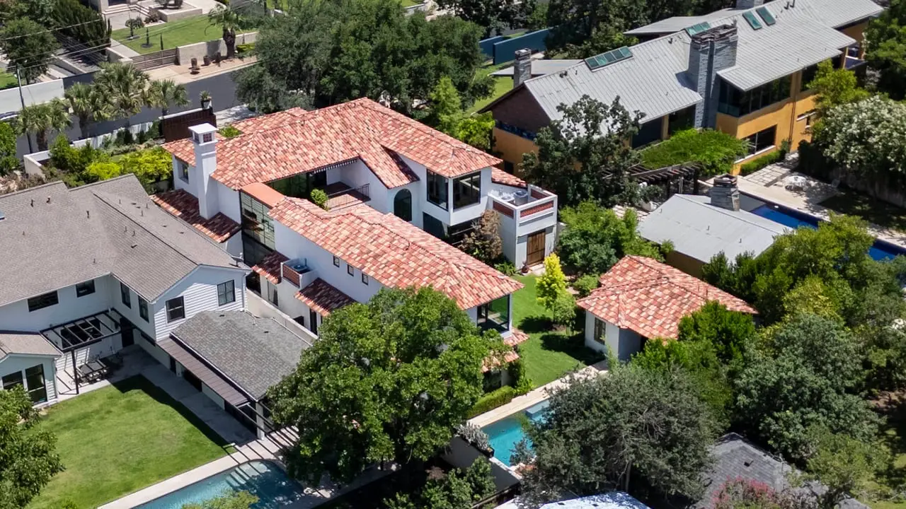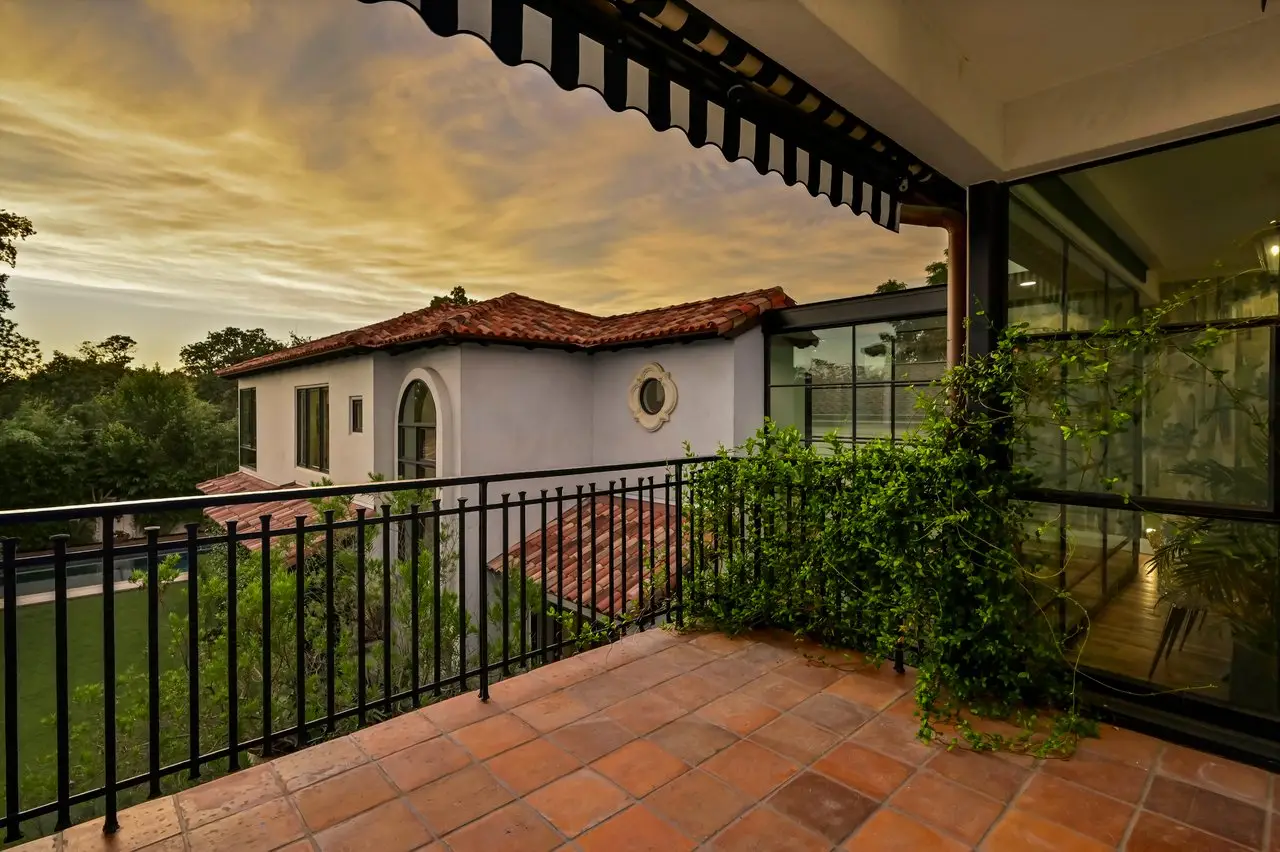 Magnificent Spanish Colonial Revival-Style Estate in West Enfield Tucked behind a private gate on a third of an acre in the historic West Enfield Neighborhood, 1308 Meriden Lane is a striking example of Spanish Colonial Revival architecture blended with contemporary elements in one of Austin’s most iconic neighborhoods. With its LaHabra stucco exterior, clay tile roof by Claymex, and multiple landscaped courtyards, this five-bedroom, five-and-a-half-bath estate offers timeless design and resort-style living just minutes from downtown. A winding entry leads to the heart of the home—an artful J-shaped two-story residence connected by a showstopping glass bridge made of Portella steel. Nearly every room is designed with views and access to the outdoors, offering a seamless transition between indoor elegance and al fresco ease. A dramatic front courtyard invites lounging and dining beneath the gas lanterns, surrounded by two hand-carved Texas Walnut limestone fountains and lush, colorful landscaping. Inside, the home reflects a thoughtful interplay of natural light, texture, and craftsmanship. Historic, reclaimed hand-hewn beams, antique and found lighting, and handcrafted details like the oversized carved stone fireplace and Wendel Brousard's custom primary bedroom door add depth and warmth to every space. The floors are layered with Old Growth Gunstock Walnut and Saltillo tile, with vibrant Mexican tile risers and caustic tile on the primary patio. Five dedicated living areas, including an upper-level lounge wrapped in hand-painted wallpaper, offer flexibility for both retreat and entertaining. In the primary suite, a spa-like bathroom opens to an indoor/outdoor shower, while the cabana pool house features a custom bar and vintage church window over 100 years old, blending history with modern luxury. Additional highlights include a rare glass-enclosed, backlit garage with room for 4–6 vehicles, an auto lift, and custom steel and wood detailing throughout—from the front door to the patio curtain rods (and a subterranean shelter). A whole-house vacuum system runs through both the home and garage, and Thermador appliances, motorized shades, Farrow & Ball paint, and custom decorative windows elevate the finish-out. With its sun-soaked Ipe wood pool deck, hidden storage areas, Rondel-stained glass windows, and sophisticated yet inviting style, 1308 Meriden Lane is a masterclass in curated living, offering the best of Old Austin charm and modern refinement.