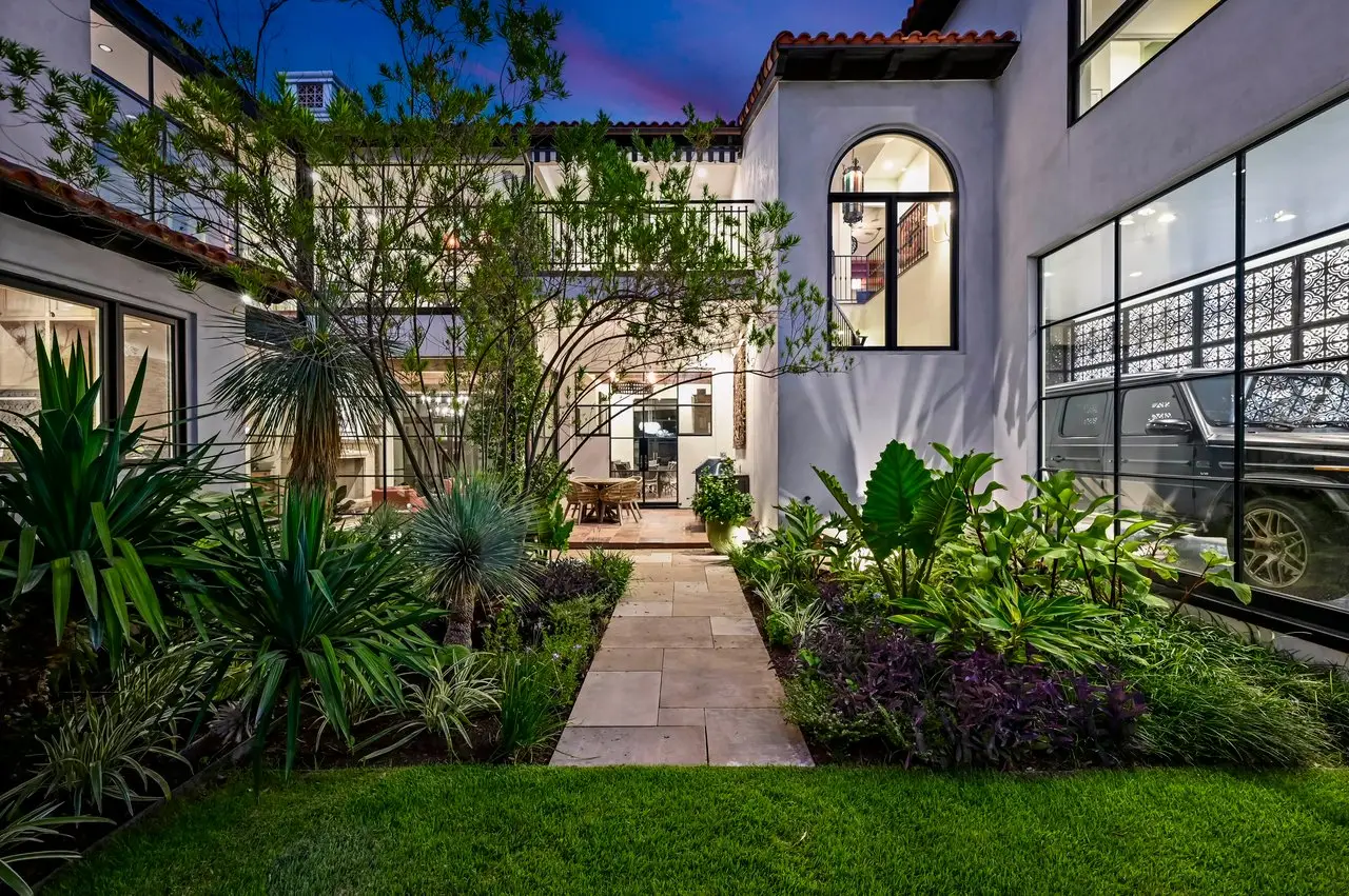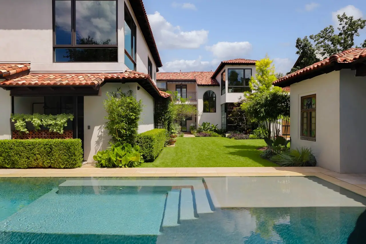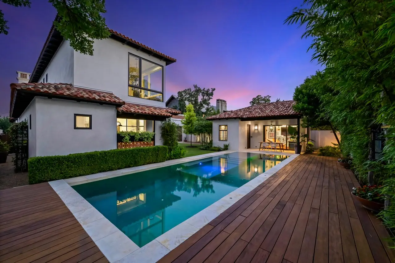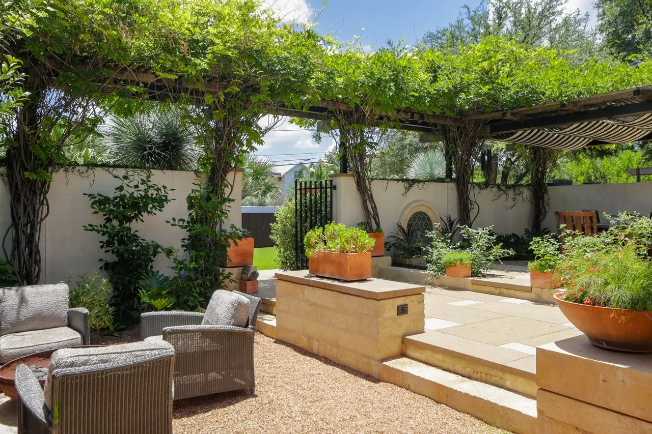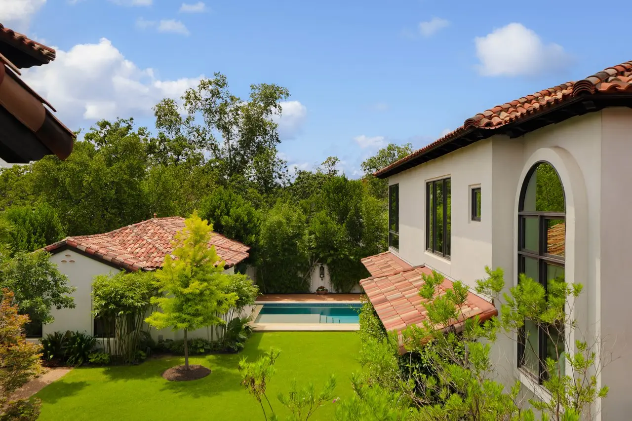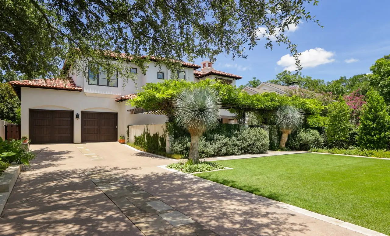 Magnificent Spanish Colonial Revival-Style Estate in West Enfield Tucked behind a private gate on a third of an acre in the historic West Enfield Neighborhood, 1308 Meriden Lane is a striking example of Spanish Colonial Revival architecture blended with contemporary elements in one of Austin’s most iconic neighborhoods. With its LaHabra stucco exterior, clay tile roof by Claymex, and multiple landscaped courtyards, this five-bedroom, five-and-a-half-bath estate offers timeless design and resort-style living just minutes from downtown. A winding entry leads to the heart of the home—an artful J-shaped two-story residence connected by a showstopping glass bridge made of Portella steel. Nearly every room is designed with views and access to the outdoors, offering a seamless transition between indoor elegance and al fresco ease. A dramatic front courtyard invites lounging and dining beneath the gas lanterns, surrounded by two hand-carved Texas Walnut limestone fountains and lush, colorful landscaping. Inside, the home reflects a thoughtful interplay of natural light, texture, and craftsmanship. Historic, reclaimed hand-hewn beams, antique and found lighting, and handcrafted details like the oversized carved stone fireplace and Wendel Brousard's custom primary bedroom door add depth and warmth to every space. The floors are layered with Old Growth Gunstock Walnut and Saltillo tile, with vibrant Mexican tile risers and caustic tile on the primary patio. Five dedicated living areas, including an upper-level lounge wrapped in hand-painted wallpaper, offer flexibility for both retreat and entertaining. In the primary suite, a spa-like bathroom opens to an indoor/outdoor shower, while the cabana pool house features a custom bar and vintage church window over 100 years old, blending history with modern luxury. Additional highlights include a rare glass-enclosed, backlit garage with room for 4–6 vehicles, an auto lift, and custom steel and wood detailing throughout—from the front door to the patio curtain rods (and a subterranean shelter). A whole-house vacuum system runs through both the home and garage, and Thermador appliances, motorized shades, Farrow & Ball paint, and custom decorative windows elevate the finish-out. With its sun-soaked Ipe wood pool deck, hidden storage areas, Rondel-stained glass windows, and sophisticated yet inviting style, 1308 Meriden Lane is a masterclass in curated living, offering the best of Old Austin charm and modern refinement.