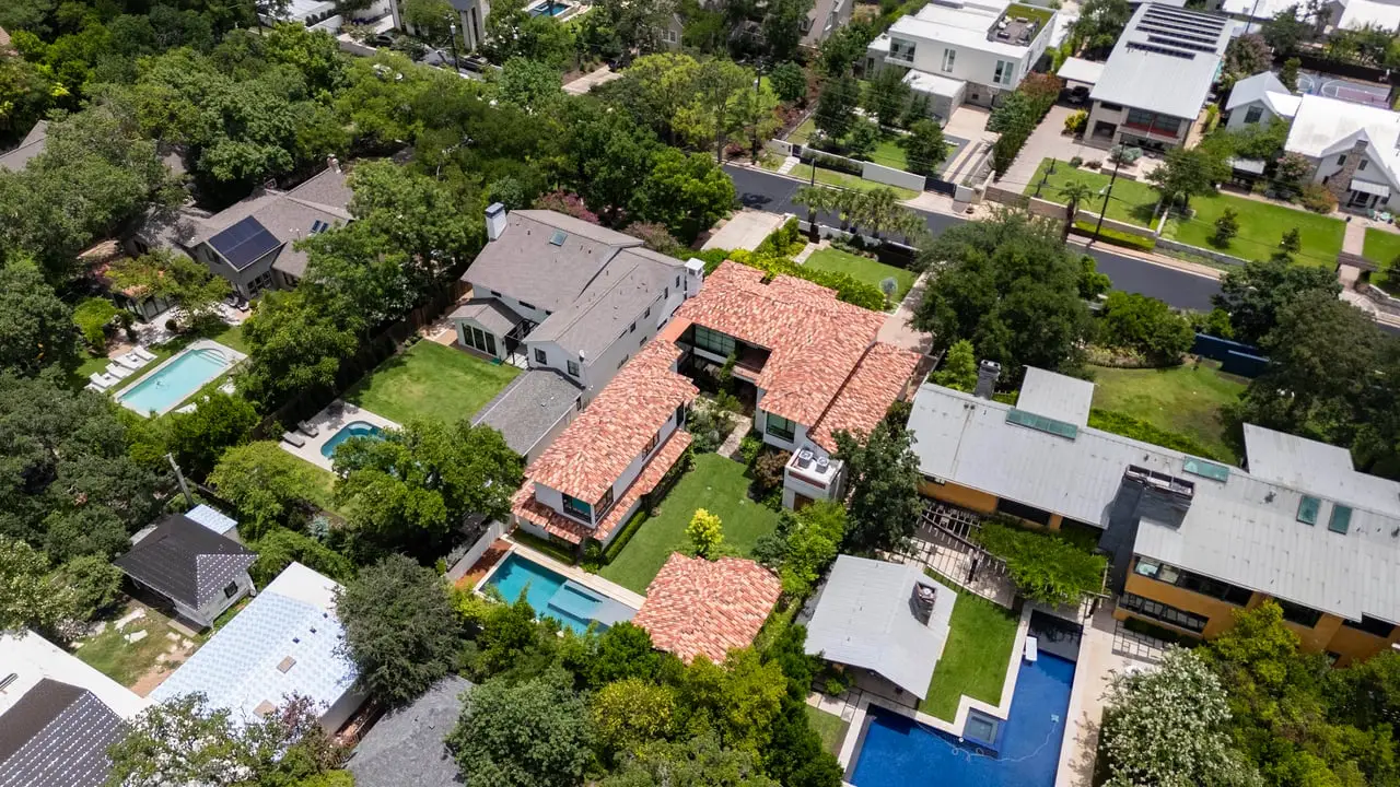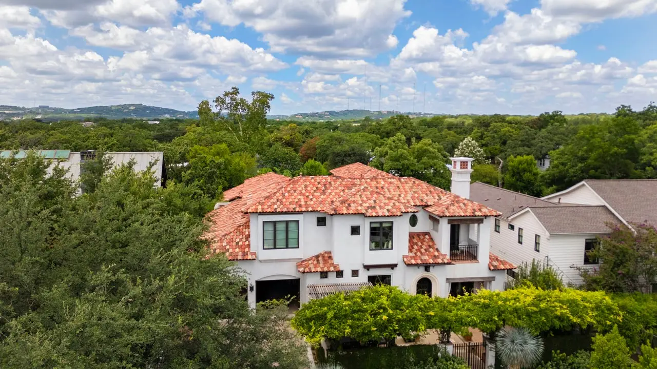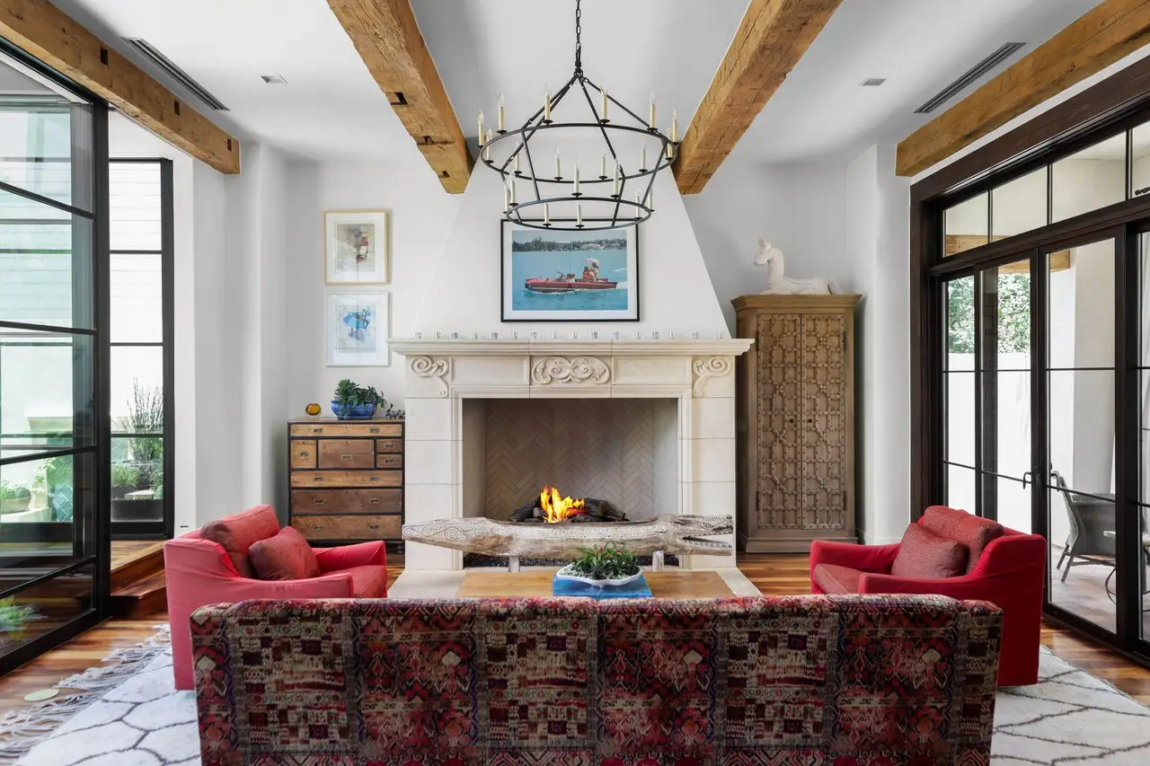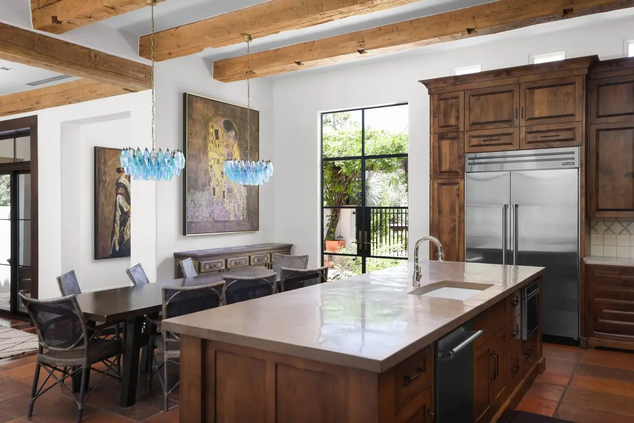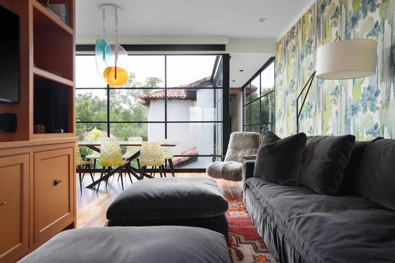 Magnificent Spanish Colonial Revival-Style Estate in West Enfield Tucked behind a private gate on a third of an acre in the historic West Enfield Neighborhood, 1308 Meriden Lane is a striking example of Spanish Colonial Revival architecture blended with contemporary elements in one of Austin’s most iconic neighborhoods. With its LaHabra stucco exterior, clay tile roof by Claymex, and multiple landscaped courtyards, this five-bedroom, five-and-a-half-bath estate offers timeless design and resort-style living just minutes from downtown. A winding entry leads to the heart of the home—an artful J-shaped two-story residence connected by a showstopping glass bridge made of Portella steel. Nearly every room is designed with views and access to the outdoors, offering a seamless transition between indoor elegance and al fresco ease. A dramatic front courtyard invites lounging and dining beneath the gas lanterns, surrounded by two hand-carved Texas Walnut limestone fountains and lush, colorful landscaping. Inside, the home reflects a thoughtful interplay of natural light, texture, and craftsmanship. Historic, reclaimed hand-hewn beams, antique and found lighting, and handcrafted details like the oversized carved stone fireplace and Wendel Brousard's custom primary bedroom door add depth and warmth to every space. The floors are layered with Old Growth Gunstock Walnut and Saltillo tile, with vibrant Mexican tile risers and caustic tile on the primary patio. Five dedicated living areas, including an upper-level lounge wrapped in hand-painted wallpaper, offer flexibility for both retreat and entertaining. In the primary suite, a spa-like bathroom opens to an indoor/outdoor shower, while the cabana pool house features a custom bar and vintage church window over 100 years old, blending history with modern luxury. Additional highlights include a rare glass-enclosed, backlit garage with room for 4–6 vehicles, an auto lift, and custom steel and wood detailing throughout—from the front door to the patio curtain rods (and a subterranean shelter). A whole-house vacuum system runs through both the home and garage, and Thermador appliances, motorized shades, Farrow & Ball paint, and custom decorative windows elevate the finish-out. With its sun-soaked Ipe wood pool deck, hidden storage areas, Rondel-stained glass windows, and sophisticated yet inviting style, 1308 Meriden Lane is a masterclass in curated living, offering the best of Old Austin charm and modern refinement.