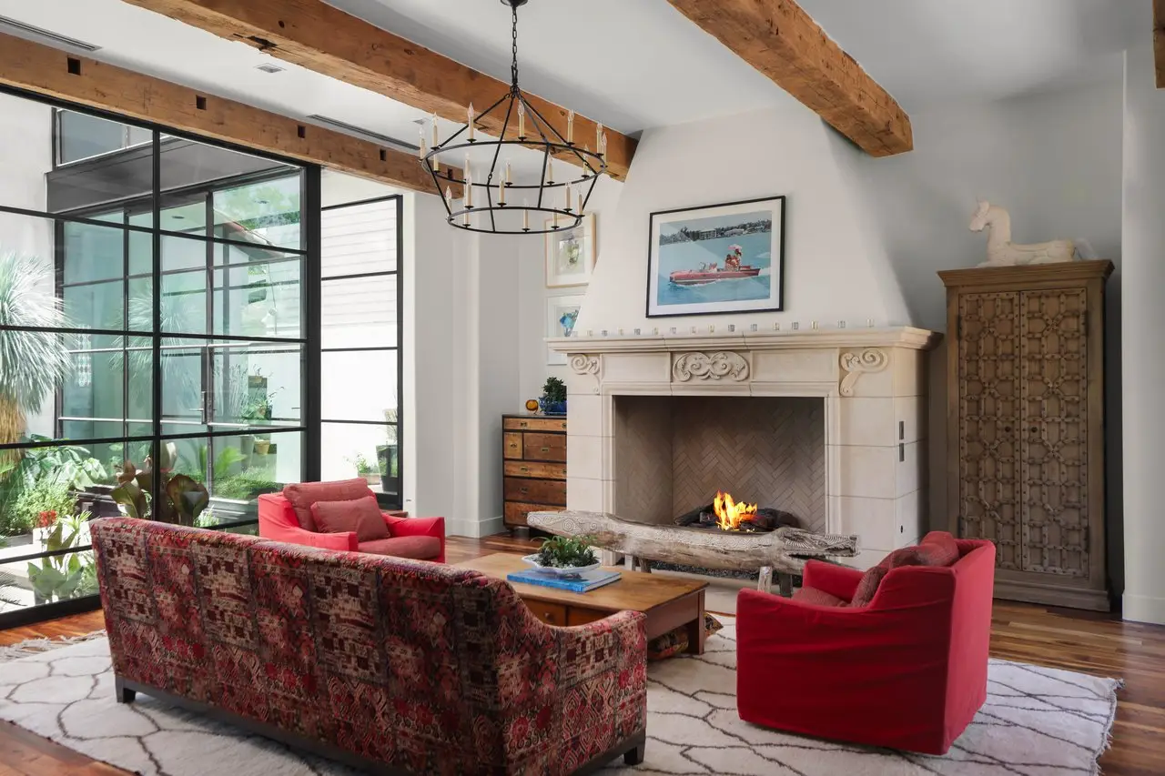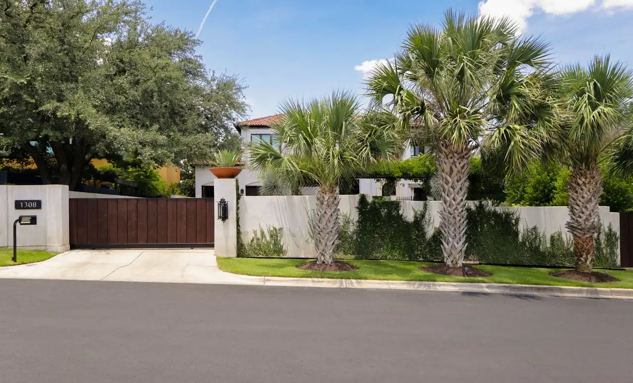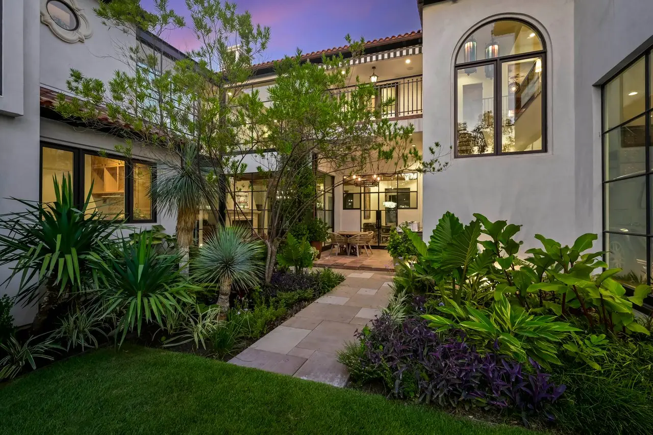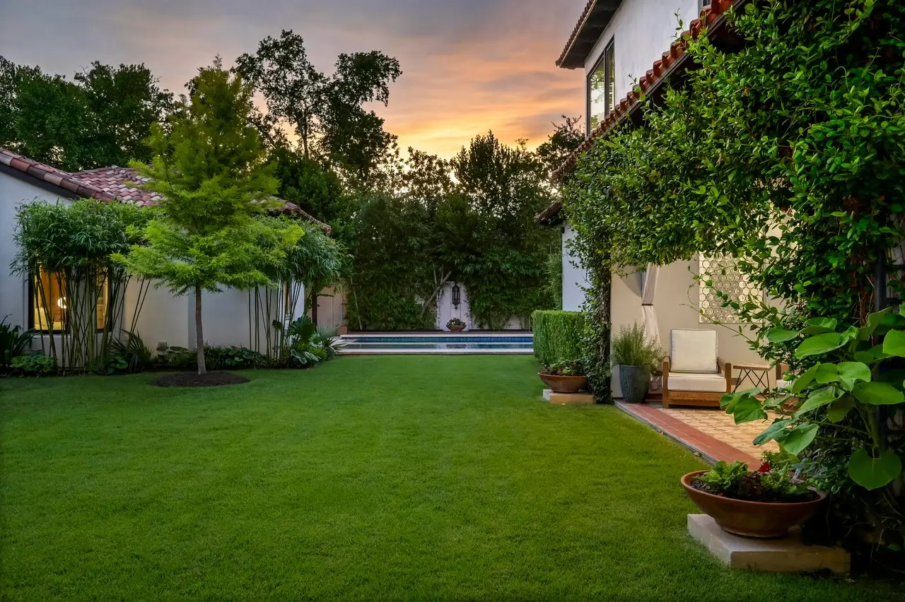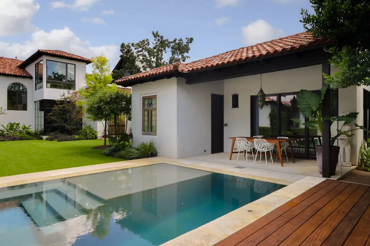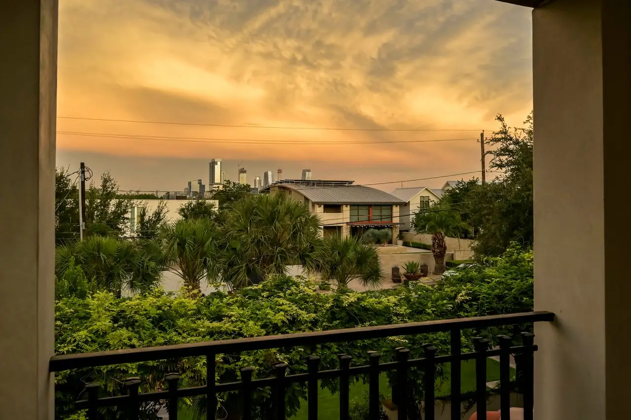 Magnificent Spanish Colonial Revival-Style Estate in West Enfield Tucked behind a private gate on a third of an acre in the historic West Enfield Neighborhood, 1308 Meriden Lane is a striking example of Spanish Colonial Revival architecture blended with contemporary elements in one of Austin’s most iconic neighborhoods. With its LaHabra stucco exterior, clay tile roof by Claymex, and multiple landscaped courtyards, this five-bedroom, five-and-a-half-bath estate offers timeless design and resort-style living just minutes from downtown. A winding entry leads to the heart of the home—an artful J-shaped two-story residence connected by a showstopping glass bridge made of Portella steel. Nearly every room is designed with views and access to the outdoors, offering a seamless transition between indoor elegance and al fresco ease. A dramatic front courtyard invites lounging and dining beneath the gas lanterns, surrounded by two hand-carved Texas Walnut limestone fountains and lush, colorful landscaping. Inside, the home reflects a thoughtful interplay of natural light, texture, and craftsmanship. Historic, reclaimed hand-hewn beams, antique and found lighting, and handcrafted details like the oversized carved stone fireplace and Wendel Brousard's custom primary bedroom door add depth and warmth to every space. The floors are layered with Old Growth Gunstock Walnut and Saltillo tile, with vibrant Mexican tile risers and caustic tile on the primary patio. Five dedicated living areas, including an upper-level lounge wrapped in hand-painted wallpaper, offer flexibility for both retreat and entertaining. In the primary suite, a spa-like bathroom opens to an indoor/outdoor shower, while the cabana pool house features a custom bar and vintage church window over 100 years old, blending history with modern luxury. Additional highlights include a rare glass-enclosed, backlit garage with room for 4–6 vehicles, an auto lift, and custom steel and wood detailing throughout—from the front door to the patio curtain rods (and a subterranean shelter). A whole-house vacuum system runs through both the home and garage, and Thermador appliances, motorized shades, Farrow & Ball paint, and custom decorative windows elevate the finish-out. With its sun-soaked Ipe wood pool deck, hidden storage areas, Rondel-stained glass windows, and sophisticated yet inviting style, 1308 Meriden Lane is a masterclass in curated living, offering the best of Old Austin charm and modern refinement.