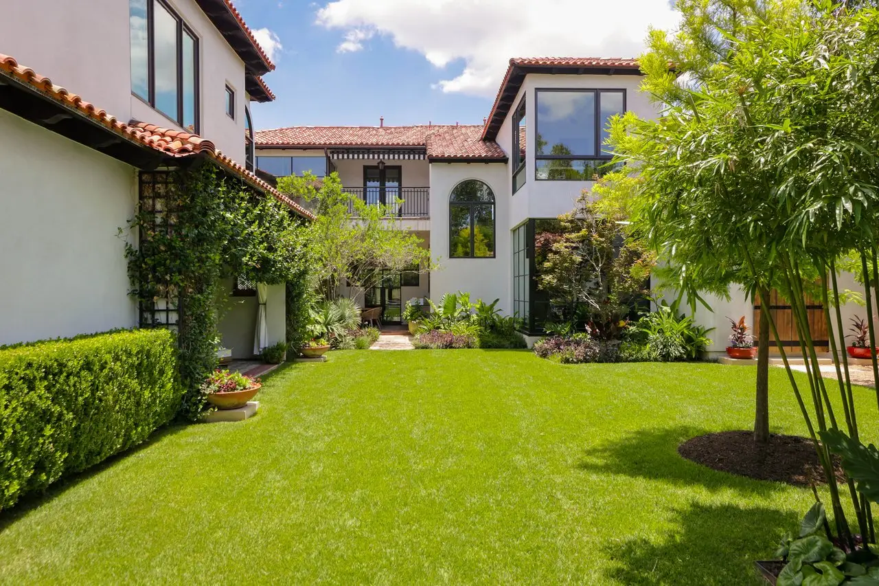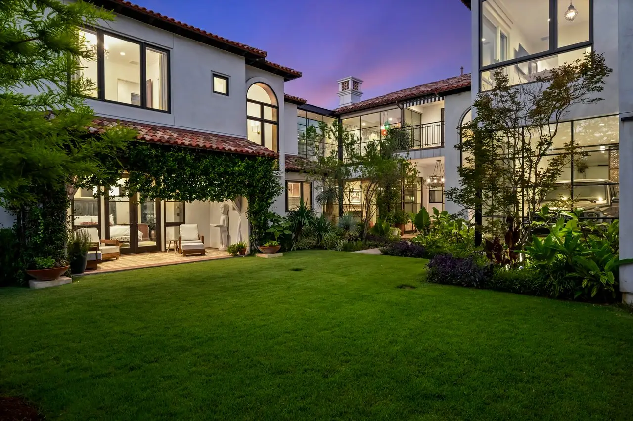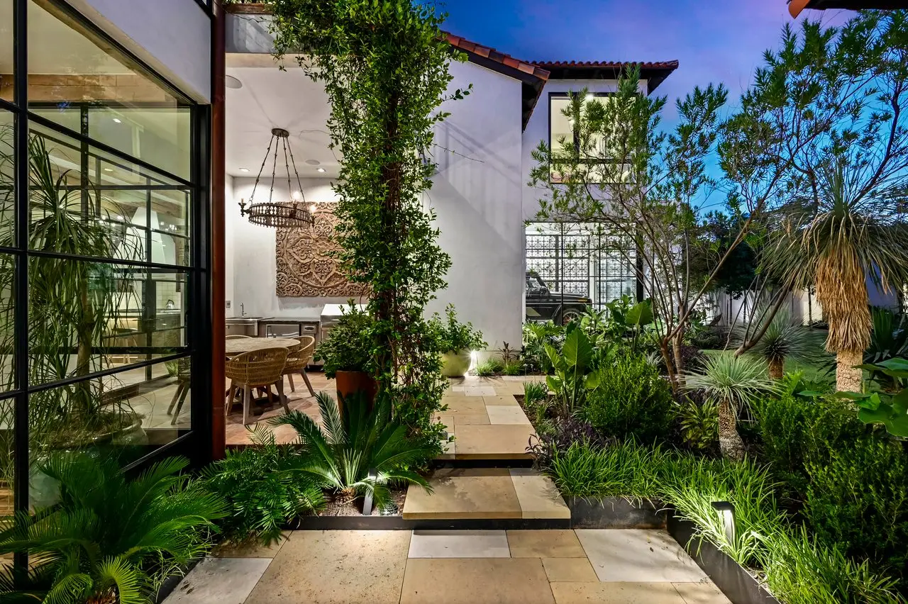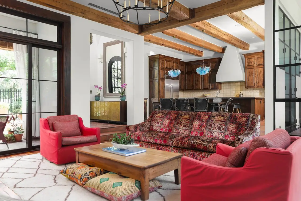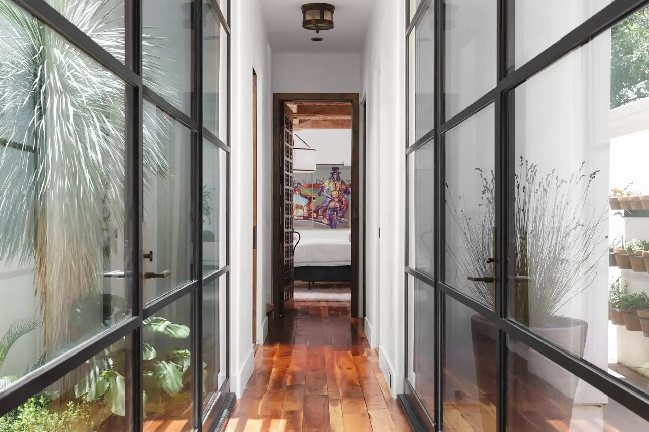 Magnificent Spanish Colonial Revival-Style Estate in West Enfield Tucked behind a private gate on a third of an acre in the historic West Enfield Neighborhood, 1308 Meriden Lane is a striking example of Spanish Colonial Revival architecture blended with contemporary elements in one of Austin’s most iconic neighborhoods. With its LaHabra stucco exterior, clay tile roof by Claymex, and multiple landscaped courtyards, this five-bedroom, five-and-a-half-bath estate offers timeless design and resort-style living just minutes from downtown. A winding entry leads to the heart of the home—an artful J-shaped two-story residence connected by a showstopping glass bridge made of Portella steel. Nearly every room is designed with views and access to the outdoors, offering a seamless transition between indoor elegance and al fresco ease. A dramatic front courtyard invites lounging and dining beneath the gas lanterns, surrounded by two hand-carved Texas Walnut limestone fountains and lush, colorful landscaping. Inside, the home reflects a thoughtful interplay of natural light, texture, and craftsmanship. Historic, reclaimed hand-hewn beams, antique and found lighting, and handcrafted details like the oversized carved stone fireplace and Wendel Brousard's custom primary bedroom door add depth and warmth to every space. The floors are layered with Old Growth Gunstock Walnut and Saltillo tile, with vibrant Mexican tile risers and caustic tile on the primary patio. Five dedicated living areas, including an upper-level lounge wrapped in hand-painted wallpaper, offer flexibility for both retreat and entertaining. In the primary suite, a spa-like bathroom opens to an indoor/outdoor shower, while the cabana pool house features a custom bar and vintage church window over 100 years old, blending history with modern luxury. Additional highlights include a rare glass-enclosed, backlit garage with room for 4–6 vehicles, an auto lift, and custom steel and wood detailing throughout—from the front door to the patio curtain rods (and a subterranean shelter). A whole-house vacuum system runs through both the home and garage, and Thermador appliances, motorized shades, Farrow & Ball paint, and custom decorative windows elevate the finish-out. With its sun-soaked Ipe wood pool deck, hidden storage areas, Rondel-stained glass windows, and sophisticated yet inviting style, 1308 Meriden Lane is a masterclass in curated living, offering the best of Old Austin charm and modern refinement.