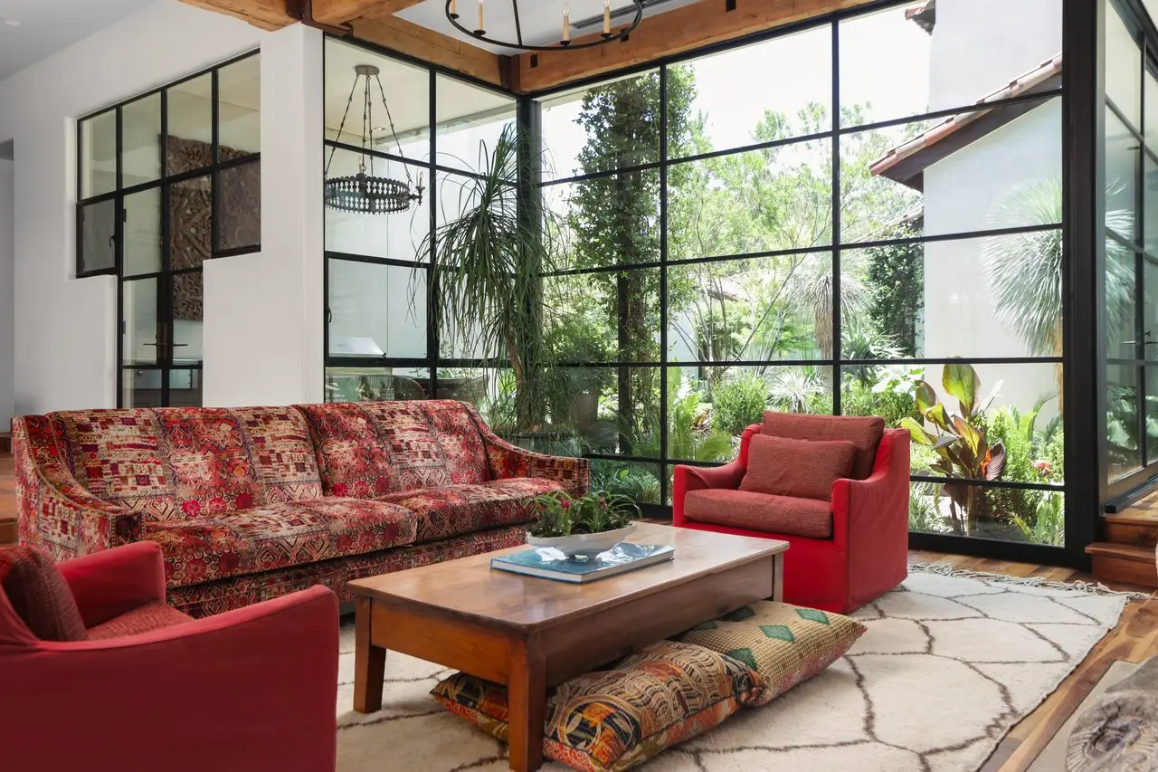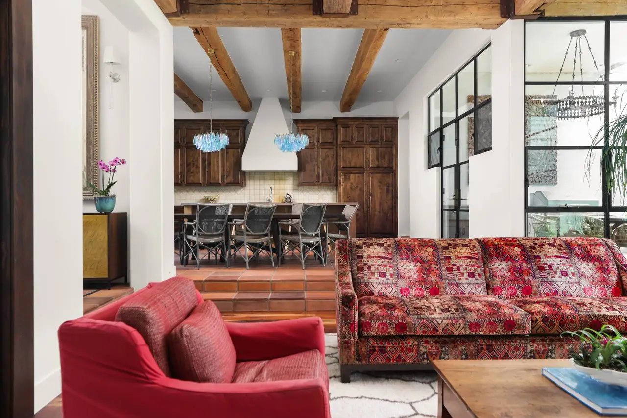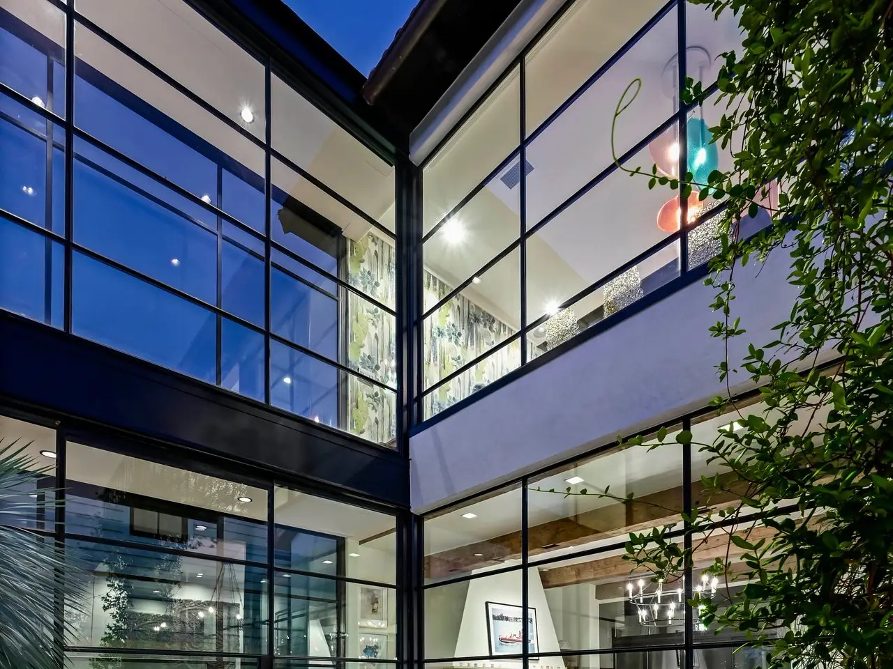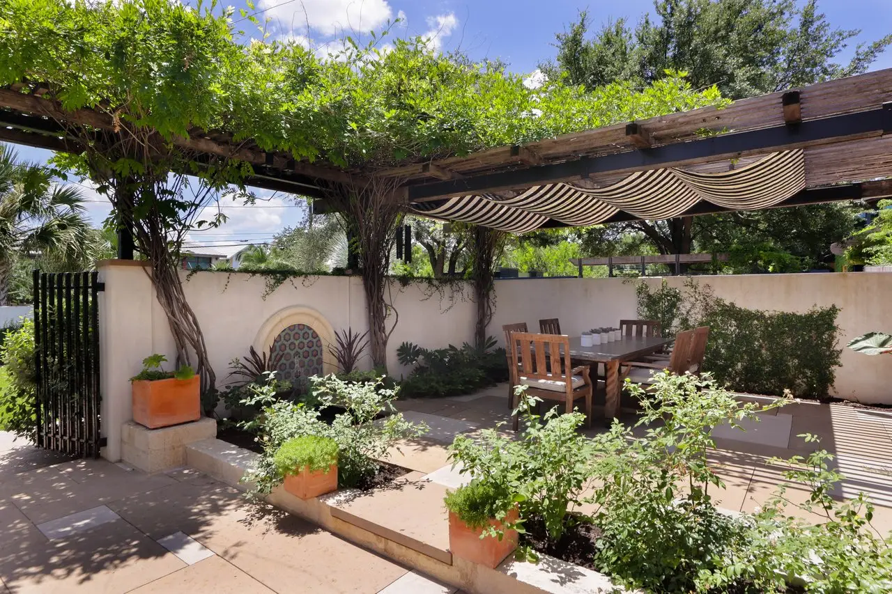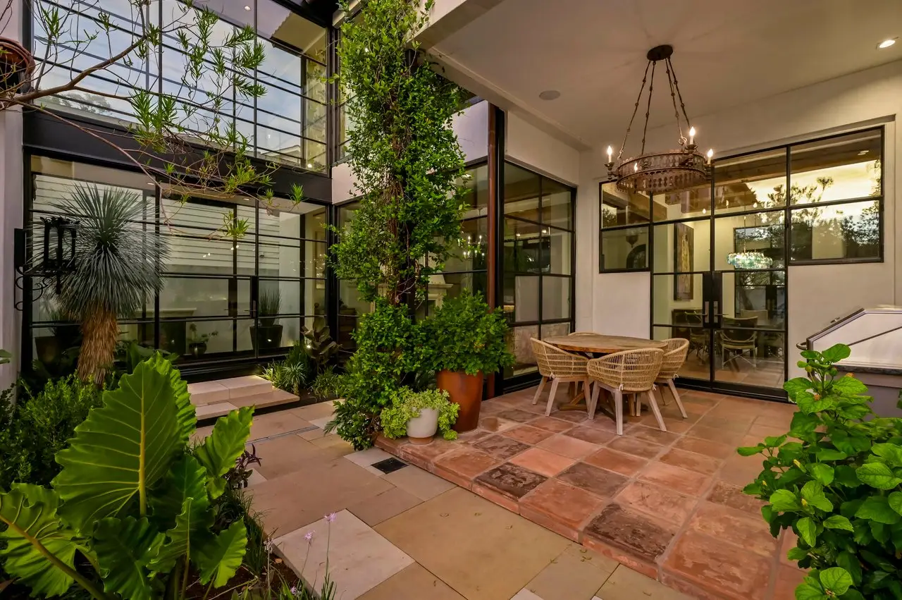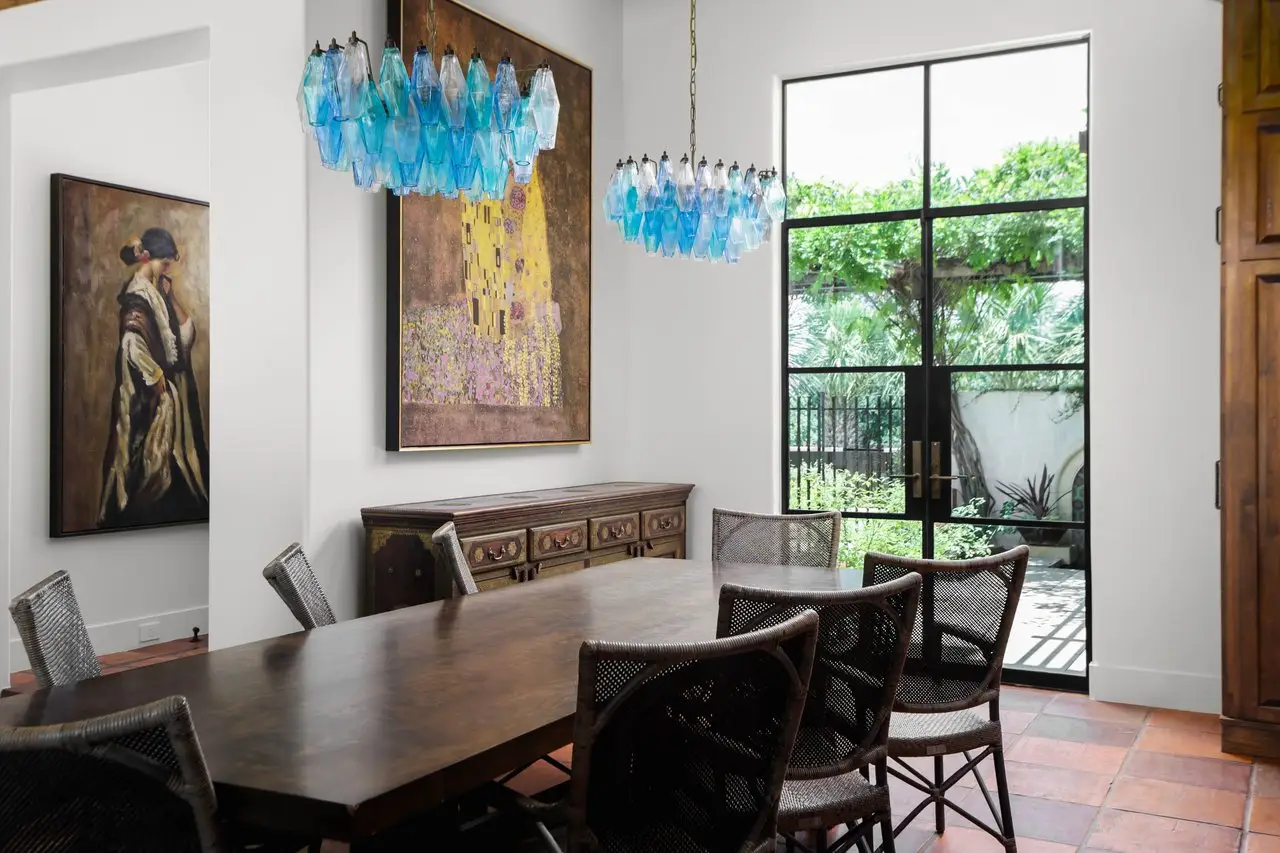 Magnificent Spanish Colonial Revival-Style Estate in West Enfield Tucked behind a private gate on a third of an acre in the historic West Enfield Neighborhood, 1308 Meriden Lane is a striking example of Spanish Colonial Revival architecture blended with contemporary elements in one of Austin’s most iconic neighborhoods. With its LaHabra stucco exterior, clay tile roof by Claymex, and multiple landscaped courtyards, this five-bedroom, five-and-a-half-bath estate offers timeless design and resort-style living just minutes from downtown. A winding entry leads to the heart of the home—an artful J-shaped two-story residence connected by a showstopping glass bridge made of Portella steel. Nearly every room is designed with views and access to the outdoors, offering a seamless transition between indoor elegance and al fresco ease. A dramatic front courtyard invites lounging and dining beneath the gas lanterns, surrounded by two hand-carved Texas Walnut limestone fountains and lush, colorful landscaping. Inside, the home reflects a thoughtful interplay of natural light, texture, and craftsmanship. Historic, reclaimed hand-hewn beams, antique and found lighting, and handcrafted details like the oversized carved stone fireplace and Wendel Brousard's custom primary bedroom door add depth and warmth to every space. The floors are layered with Old Growth Gunstock Walnut and Saltillo tile, with vibrant Mexican tile risers and caustic tile on the primary patio. Five dedicated living areas, including an upper-level lounge wrapped in hand-painted wallpaper, offer flexibility for both retreat and entertaining. In the primary suite, a spa-like bathroom opens to an indoor/outdoor shower, while the cabana pool house features a custom bar and vintage church window over 100 years old, blending history with modern luxury. Additional highlights include a rare glass-enclosed, backlit garage with room for 4–6 vehicles, an auto lift, and custom steel and wood detailing throughout—from the front door to the patio curtain rods (and a subterranean shelter). A whole-house vacuum system runs through both the home and garage, and Thermador appliances, motorized shades, Farrow & Ball paint, and custom decorative windows elevate the finish-out. With its sun-soaked Ipe wood pool deck, hidden storage areas, Rondel-stained glass windows, and sophisticated yet inviting style, 1308 Meriden Lane is a masterclass in curated living, offering the best of Old Austin charm and modern refinement.