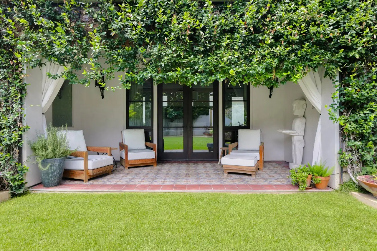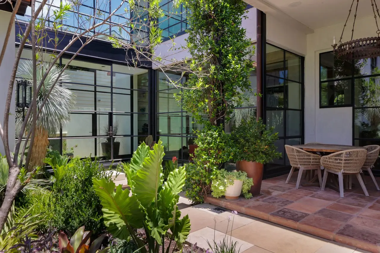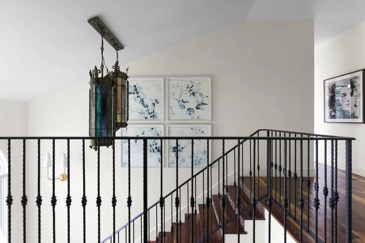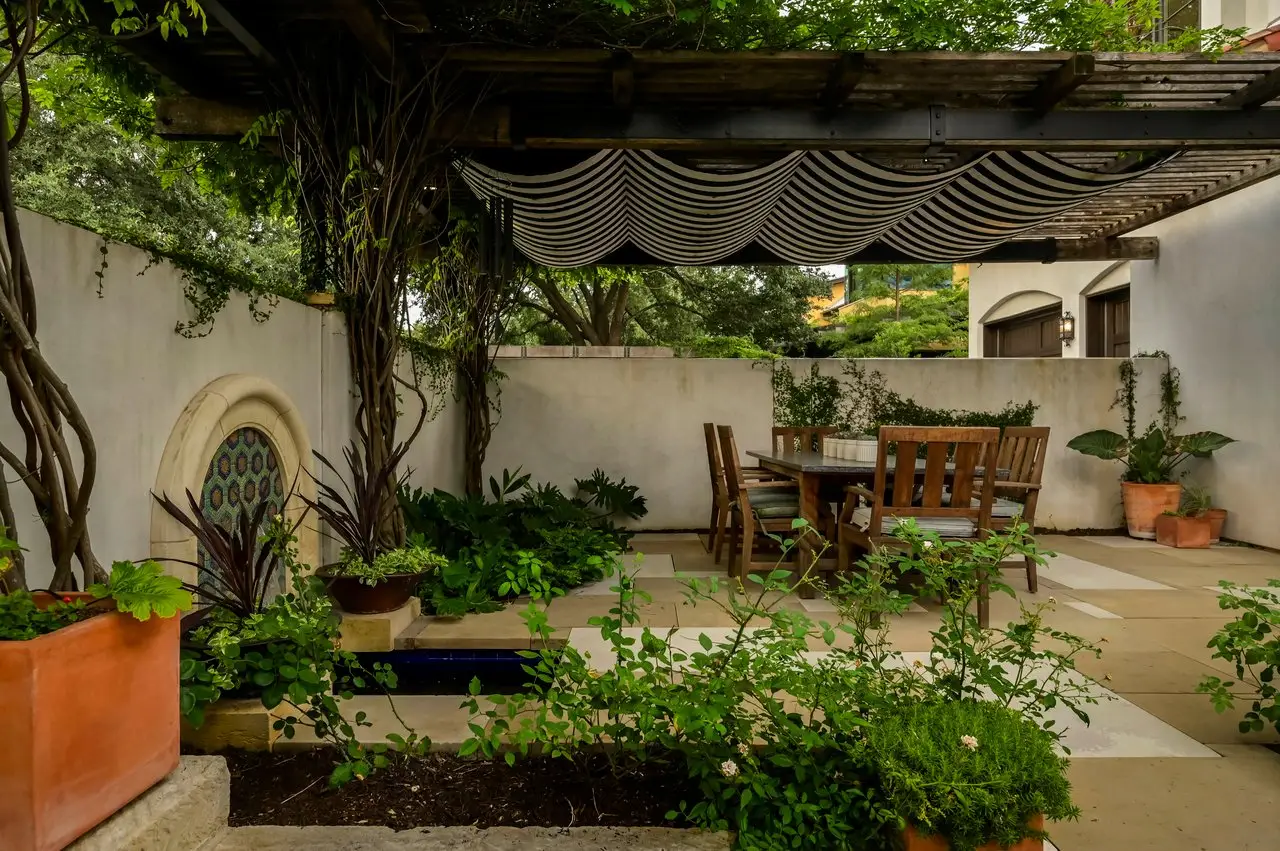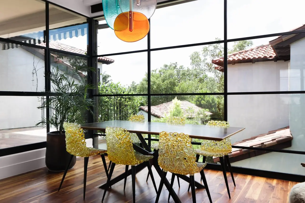 Magnificent Spanish Colonial Revival-Style Estate in West Enfield Tucked behind a private gate on a third of an acre in the historic West Enfield Neighborhood, 1308 Meriden Lane is a striking example of Spanish Colonial Revival architecture blended with contemporary elements in one of Austin’s most iconic neighborhoods. With its LaHabra stucco exterior, clay tile roof by Claymex, and multiple landscaped courtyards, this five-bedroom, five-and-a-half-bath estate offers timeless design and resort-style living just minutes from downtown. A winding entry leads to the heart of the home—an artful J-shaped two-story residence connected by a showstopping glass bridge made of Portella steel. Nearly every room is designed with views and access to the outdoors, offering a seamless transition between indoor elegance and al fresco ease. A dramatic front courtyard invites lounging and dining beneath the gas lanterns, surrounded by two hand-carved Texas Walnut limestone fountains and lush, colorful landscaping. Inside, the home reflects a thoughtful interplay of natural light, texture, and craftsmanship. Historic, reclaimed hand-hewn beams, antique and found lighting, and handcrafted details like the oversized carved stone fireplace and Wendel Brousard's custom primary bedroom door add depth and warmth to every space. The floors are layered with Old Growth Gunstock Walnut and Saltillo tile, with vibrant Mexican tile risers and caustic tile on the primary patio. Five dedicated living areas, including an upper-level lounge wrapped in hand-painted wallpaper, offer flexibility for both retreat and entertaining. In the primary suite, a spa-like bathroom opens to an indoor/outdoor shower, while the cabana pool house features a custom bar and vintage church window over 100 years old, blending history with modern luxury. Additional highlights include a rare glass-enclosed, backlit garage with room for 4–6 vehicles, an auto lift, and custom steel and wood detailing throughout—from the front door to the patio curtain rods (and a subterranean shelter). A whole-house vacuum system runs through both the home and garage, and Thermador appliances, motorized shades, Farrow & Ball paint, and custom decorative windows elevate the finish-out. With its sun-soaked Ipe wood pool deck, hidden storage areas, Rondel-stained glass windows, and sophisticated yet inviting style, 1308 Meriden Lane is a masterclass in curated living, offering the best of Old Austin charm and modern refinement.