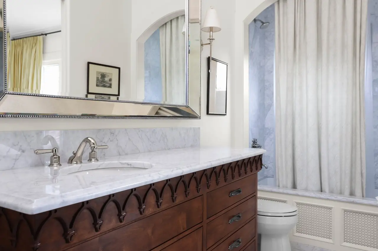 - Oversized carved stone fireplace