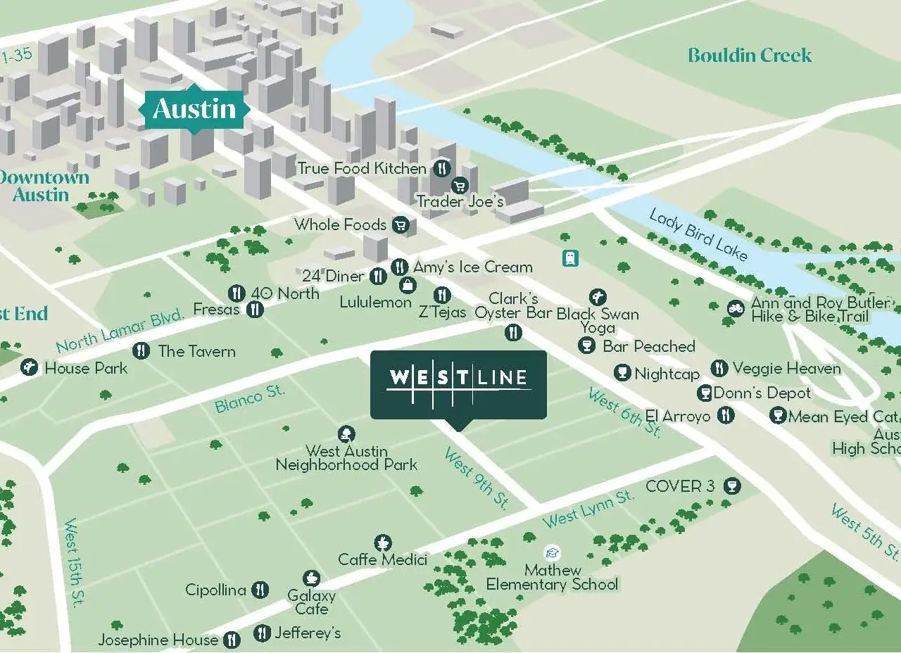 Set to debut Summer / Fall 2025! Construction photos take March 2025. Westline is a collection of 16 modern and historic residences in the heart of Clarksville with four luxurious design scheme options. They range from 2-4 bedrooms, and all offer a private two-car garage. Westline boasts classic peaked rooflines adorned with chimney frames, modern windows and doors, and rich exterior stone features on the lower levels. Grass lawns and white picket fences are a timeless semblance to a simpler time when the West Line Historic District featured expansive estates. The community is conveniently connected to Downtown Austin while honoring the historic suburban roots of the Clarksville area. Residence's #801 (Floorplan G) main level offers twp en suite guest bedrooms and spacious laundry room. The open floorplan on the second level is equipped with a gourmet kitchen that is anchored by a center island with a breakfast bar and luxurious GE appliance package. Enjoy light and bright interior selections including White Patina European Oak hardwood floors, Calacutta gold marble countertops, and white Herringbone backsplash. Just off the living area is the primary suite that is outfitted with an expansive walk-in closet and dual vanity. Clarksville is a pedestrian friendly district known for its historic bungalows, public parks and popular cafes and shops. Located a mile from downtown Austin and surrounded by a variety of restaurants, the Westline community offers an accessible lifestyle to West Austin Neighborhood Park, the Hike & Bike Trail, Lady Bird Lake, Whole Foods, Trader Joe's and convenient highway access. Tax and assessed values are estimates for illustration purposes only. All figures should be independently verified.