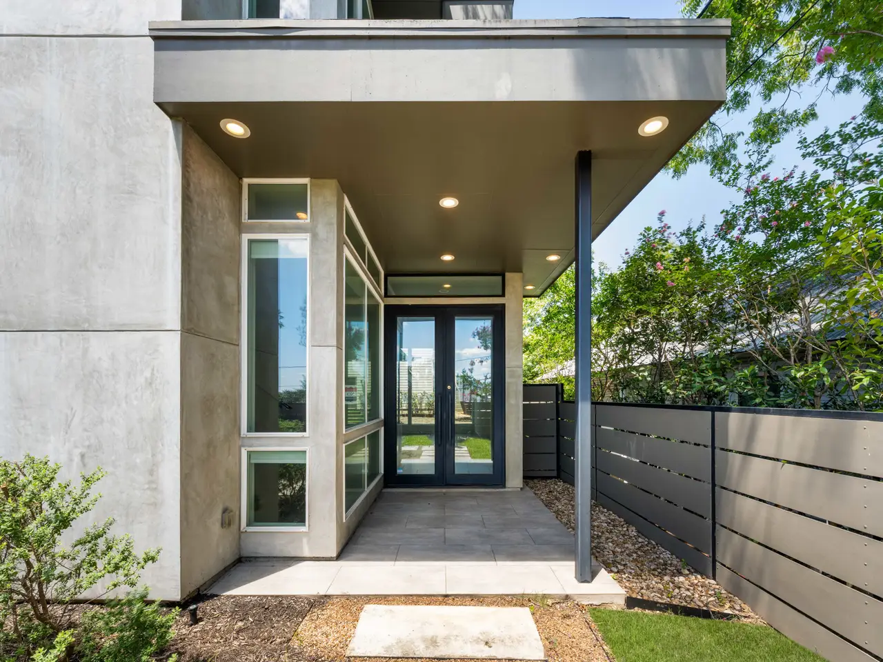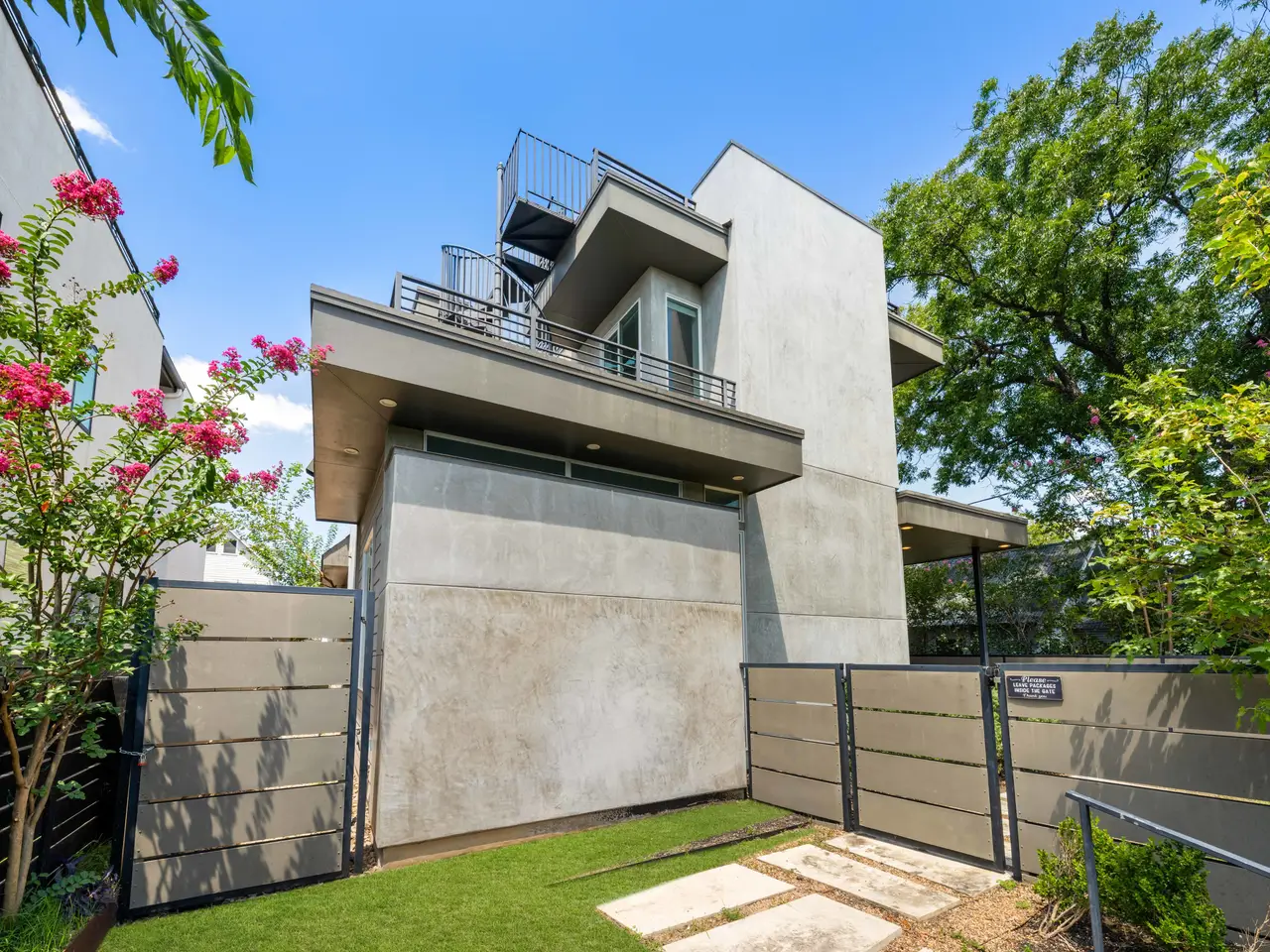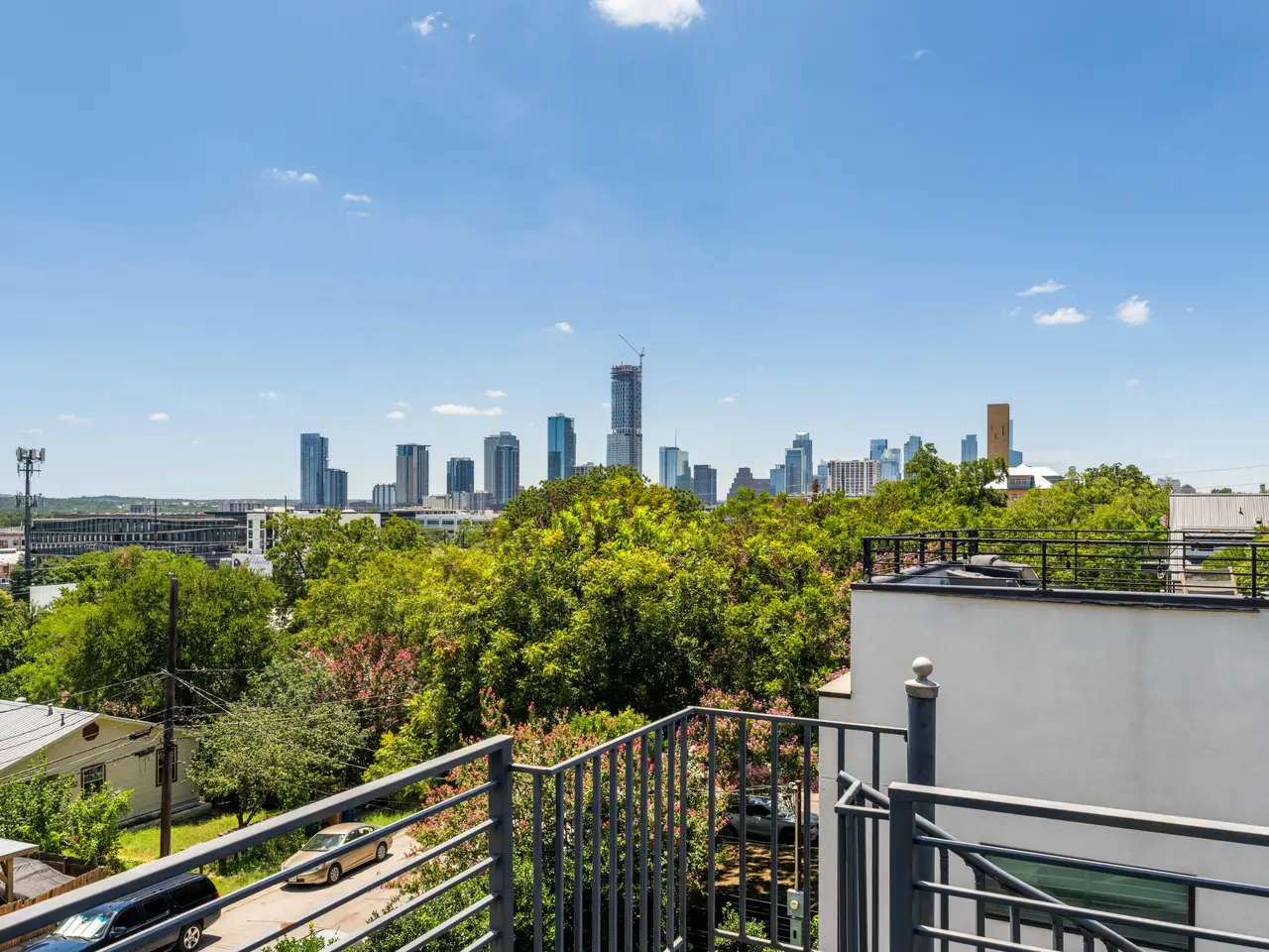 Modern luxury in the heart of East Austin! This 3 bed, 2.5 bath architectural gem offers 2,096 square feet of stylish living space, high ceilings, floor to ceiling windows, and an open-concept design. The gourmet kitchen features a waterfall island, custom cabinetry and premium appliances. A designer glass tile backsplash and sophisticated lighting solutions create an atmosphere of refined modernity, while the adjoining dining area, crowned with a crystal pendant chandelier, offers the perfect setting for elegant entertaining. The primary suite stuns with a spa-style wet room, marble double vanity, and oversized walk-in closet. Upstairs there are 2 bedrooms with views of downtown, a full bathroom, plus additional flex area that can be used as office space or additional living area. This home has multiple outdoor living spaces where you can unwind privately in the lush courtyard, under the covered patios, or take the spiral staircase up to the third story terrace for the beautiful panoramic views of the Austin skyline. The detached climate-controlled garage includes a full guest suite above (an additional 711 sqft) that is perfect for rental income, multigenerational living, or a private home office. This vibrant East Austin address sits in an educational hub, just moments away from the historical Houston-Tilloston University and minutes from the University of Texas at Austin campus. Walkable to highly rated shops, restaurants, coffee, and parks. A rare blend of elegance, flexibility, and location - don't miss this one! Property sold “As-is.” Buyer and/or buyer’s agent responsible for verifying all pertinent information deemed relevant by the prospective buyer, including but not limited to square footage, acreage, utilities, taxes, zoning, permitting, condition, school zones, HOAs, etc.