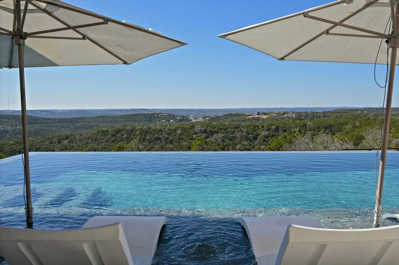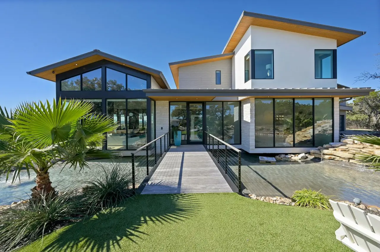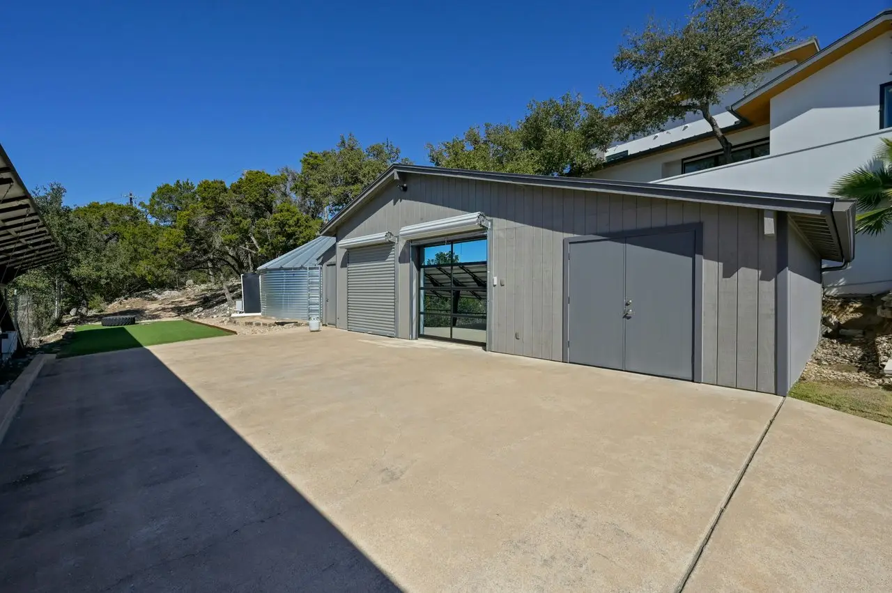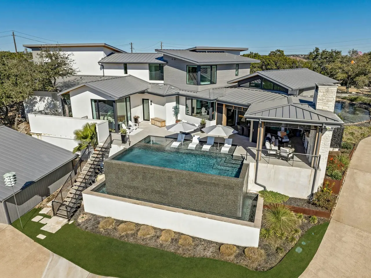 Perched atop the rolling hills just off City Park Road, 8209 Two Coves Drive is a newly constructed contemporary masterpiece that seamlessly blends striking architectural elements with the natural beauty of the Texas Hill Country. Plus, with a 2024 tax rate of just 1.53% (buyer to verify), this estate represents a rare opportunity to own a state-of-the-art home in a coveted location with some of the lowest property taxes in Austin. A privately gated driveway winds through the lush landscape, leading to a dramatic front entry defined by an expansive mote and waterfall. A modern bridge guides visitors over the tranquil waters toward the residence, setting the stage for the home's contemporary yet serene ambiance. Every detail of the front yard has been meticulously designed with low-maintenance plantings, allowing the home to harmonize effortlessly with its surroundings. Once inside, walls of glass frame breathtaking views, creating an immersive indoor-outdoor living experience. This 4-bedroom, 4-bathroom residence, with two additional powder rooms, offers luxurious living spaces, including a dedicated office overlooking the treetop views maximizing natural light and flow. The resort-style amenities continue outside, where ample covered patios, an outdoor kitchen, a waterfall-edge pool, and a hot tub provide the ultimate setting for entertaining against the backdrop of epic Texas sunsets. Designed with both luxury and functionality in mind, this home is equipped with cutting-edge technology and sustainability features that set it apart. A Generac whole house generator ensures uninterrupted power, while a solar panel system adds an eco-conscious touch to energy consumption. The property benefits from its own well for both potable water and irrigation, paired with a 26,000-gallon rainwater collection system that supports sustainable living. A whole-house reverse osmosis system with water softening and UV light sterilization ensures the highest water quality throughout the home. The exterior construction is as refined as the interiors, boasting a mix of stucco, stone, and metal cladding, complemented by Nichiha architectural siding accents that replicate the warmth of weathered wood while offering superior durability. A standing-seam metal roof enhances the home's sleek aesthetic while providing long-lasting protection against the elements. Beyond the main residence, the property extends its offerings with a casita that currently serves as an office, plus an impressive, detached flex space, complete with a golf simulator and gym, making it an oasis for both relaxation and recreation. Car enthusiasts will appreciate the 3-car garage, providing ample space for vehicles and storage. Integrated Control4 home automation manages the lighting and AV systems in key living areas, while six strategically placed security cameras offer peace of mind. Whether enjoying the panoramic Hill Country views from the outdoor living spaces, indulging in the luxury amenities, or embracing the home's eco-friendly innovations, 8209 Two Coves Drive is a one-of-a-kind modern retreat designed for the most discerning homeowner.
