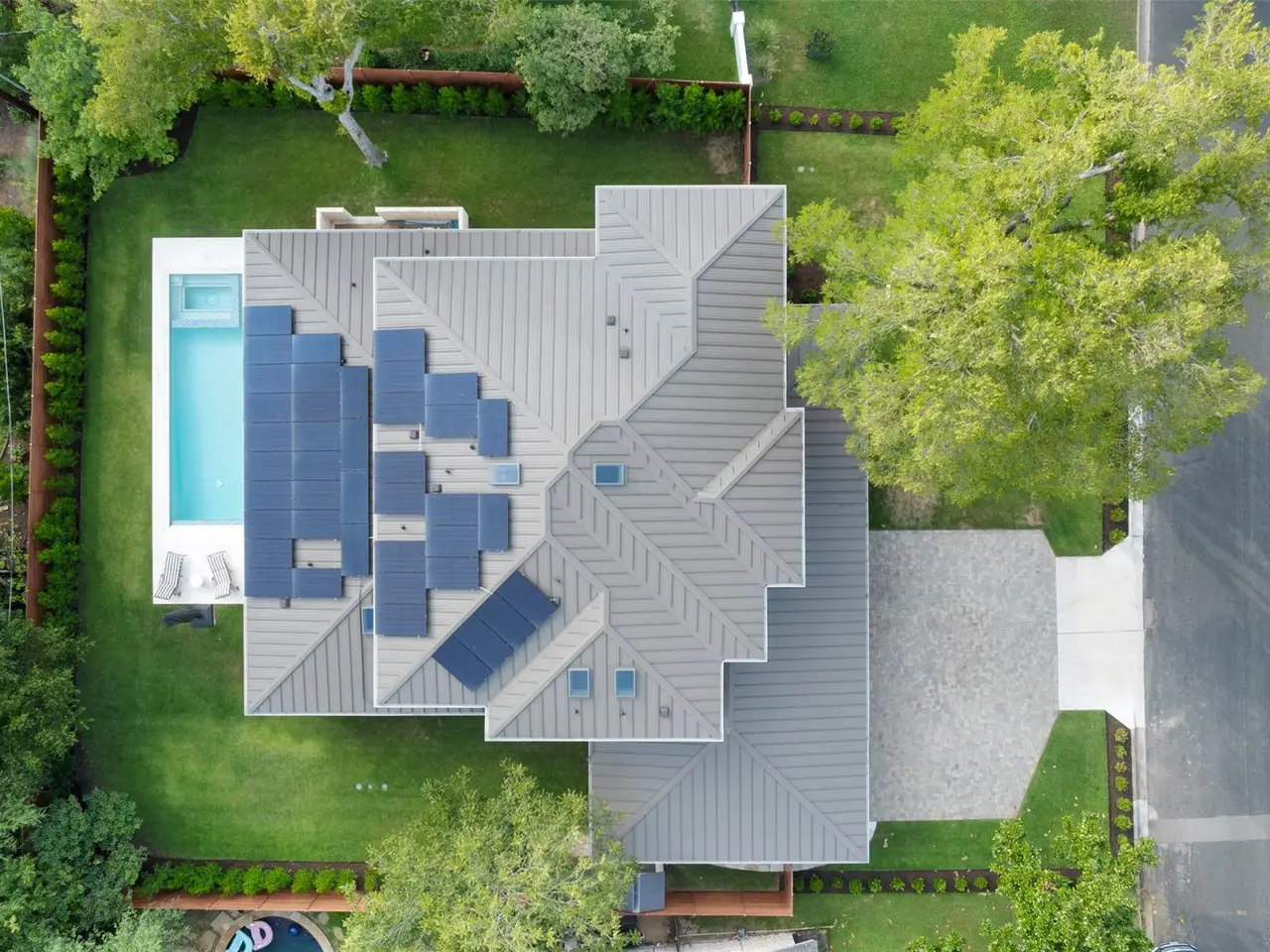 Welcome to 4107 N Hills Drive, a rare find in Northwest Hills. The front facade blends natural materials w/ Hill Country contemporary design, instantly setting it apart & contributing to the neighborhood's evolving character. Thoughtfully designed & completed in 2024 as the owners' forever home, this true custom build pairs timeless craftsmanship w/ modern design & smart technology. With the future in mind, the home is equipped w/ solar panels, multiple EV chargers, & audio visual, lighting, & security--all from your phone or tablet. The open-concept layout features 3 living areas & 2 dedicated offices, creating flexibility for work, play, & entertaining. At the heart of the home, the chef's kitchen showcases an oversized island, Thermador appliances, a 24-bottle wine column, & details like an appliance garage & hidden mixer cabinet. Floor-to-ceiling windows & sliding glass doors in the living room flood the space w/ natural light & connect to the outdoors. Downstairs offers 2 bedrooms, a private office, & open gathering areas anchored by a striking glass-lined staircase. Upstairs, the primary suite is a true retreat w/ dual custom closets & a spa-inspired bath featuring a soaking tub & oversized shower. 2 additional ensuite bedrooms, a teen lounge, & 2nd office complete the upstairs. The backyard is designed as a private oasis w/ a covered porch, outdoor kitchen, sparkling pool, & hot tub. A 3 car air-conditioned garage w/ epoxy floors, custom storage, & multiple EV chargers adds convenience. Solar panels, Tesla Powerwalls, & a full smart-home system enhance efficiency & security. Located in the coveted Northwest Hills neighborhood & walking distance to Doss Elementary & Murchison Middle School, & just minutes from Anderson High. Everyday conveniences, shopping, & dining are nearby, w/ Mopac providing quick access to both Downtown & The Domain. A rare blend of location, lifestyle, and design, 4107 N Hills Drive is truly one of Northwest Hills' finest.
