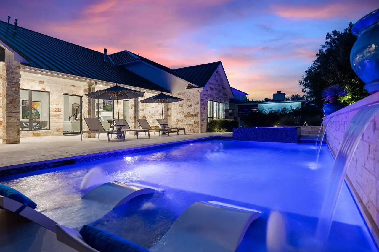 Built in 2019 by the renowned Westin Homes, this 4,494-square-foot masterpiece offers a harmonious blend of style and functionality. Featuring 4 spacious bedrooms, 3.5 luxurious bathrooms, a dedicated office, and an inviting media room, every detail of this home is designed with thoughtful precision. Step into the chef-inspired kitchen, complete with a Sub-Zero refrigerator, a five-burner Wolf stove, and high-end custom finishes. The open-concept layout seamlessly flows into the living and dining areas, where coffered ceilings and expansive windows frame views of the lush backyard oasis. Each bedroom boasts a private en suite bath and walk-in closet, making it perfect for both family and guests. The primary suite is a sanctuary, offering a spa-like bathroom with a soaking tub, dual vanities, and a glass-enclosed shower, all complemented by upscale finishes and natural light. Outside, your private retreat awaits. Situated on 0.327 acres, the backyard features a custom-designed pool and spa with cascading waterfalls, an outdoor kitchen, and a cozy cabana complete with a fireplace. A six-foot privacy wall and carefully curated landscaping create a true sanctuary for relaxation and entertainment. Additional highlights include a three-car garage, a laundry room, and a full wet bar for entertaining. Located just minutes from shopping, dining, and the highly acclaimed Lake Travis Schools, this home offers the perfect balance of convenience and tranquility. This is more than a home—it’s a lifestyle.