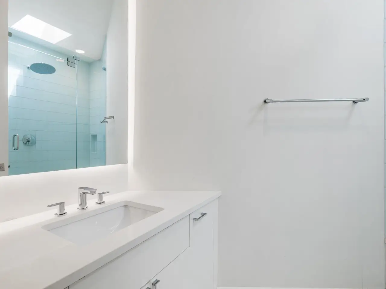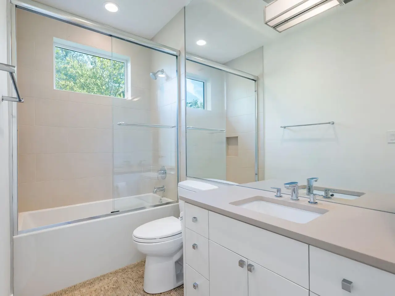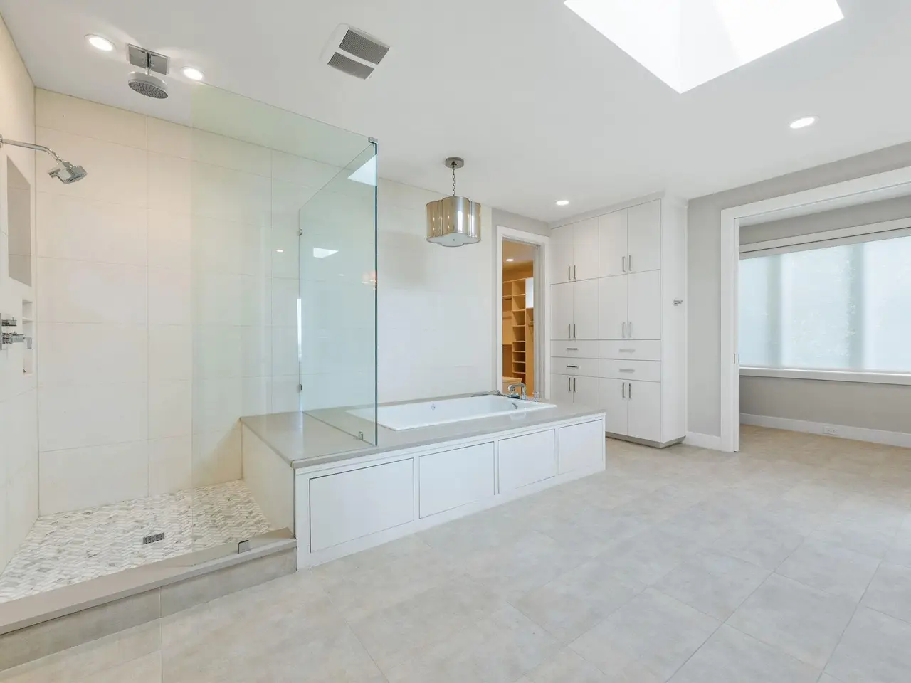 - Soaking tub, glass-enclosed shower, and dual sinks