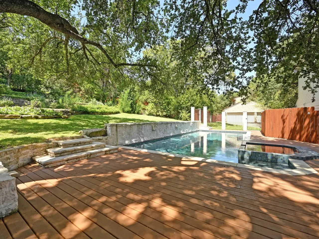 Built in 1982, this beautiful Traditional home has been thoughtfully updated. The slurred stone exterior radiates charm on the fully manicured .67 acre lot. Wood beams encase the front entrance porch and double glass doors. The entrance foyer opens to both the formal and informal living areas, providing easy flow through the downstairs. The formal dining room is adjacent to the formal living room. The newly remodeled kitchen has stainless appliances, a center island and plenty of counter space on the breakfast bar. The kitchen overlooks the covered back patio, pool and backyard. Enjoy an extra dining area off the kitchen. The informal living room has a wet bar with storage, overlooks the front yard, and is open to the kitchen and breakfast area. A delightful mud room adjoins the garage, providing 4 "cubbies", an extra refrigerator, ice maker, extra storage and exterior door to the pool. There is one secondary bedroom on the main level with a full bathroom. A primary suite was added over the garage several years ago with stunning windows overlooking a majestic treaty oak tree. The primary bathroom is a cozy retreat with double vanities, oversized shower and gorgeous walk in closet with built in cabinets. 3 additional bedrooms are located upstairs with one full bathroom. A large game room is also upstairs. The laundry room was added upstairs and is a dream come true! Tons on storage and plenty of counter space make this an ideal craft room as well. The backyard has a newly resurfaced and tiled pool and spa. The lot backs to a hillside, providing privacy and beautiful landscaping. West Rim HOA owns a park on Lake Austin within walking distance of the property. Homeowners enjoy a playscape, tennis court, basketball court, gazebo with grill, picnic area, day dock, kayak & paddle board storage and a 20 boat slip marina.