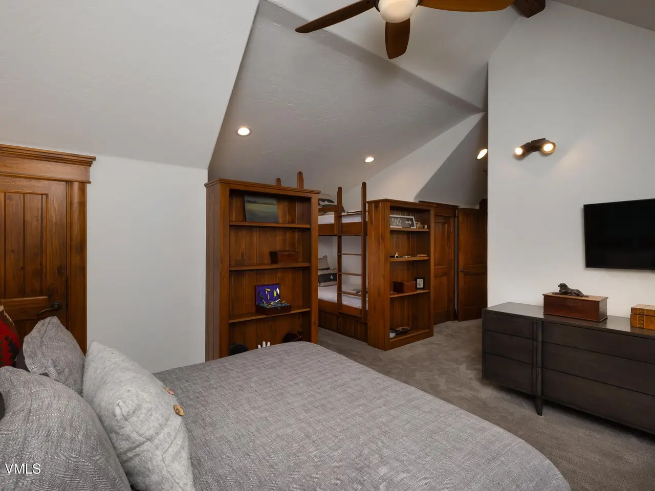- Vaulted ceilings with log beams