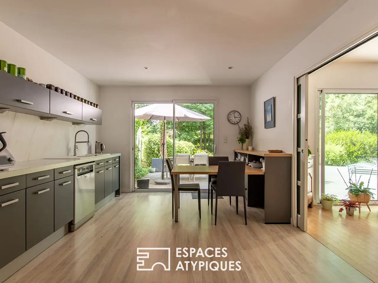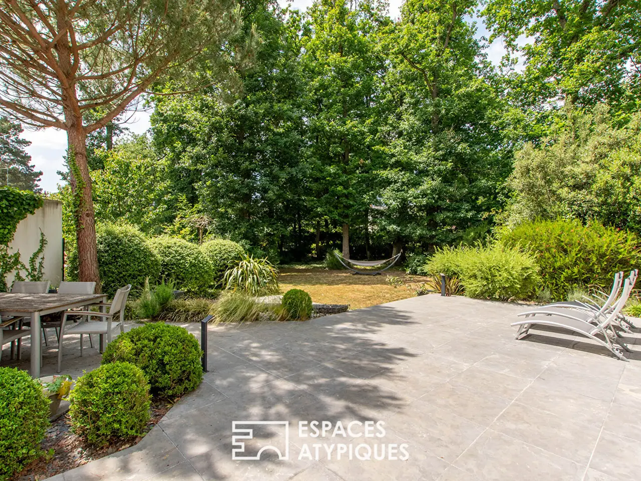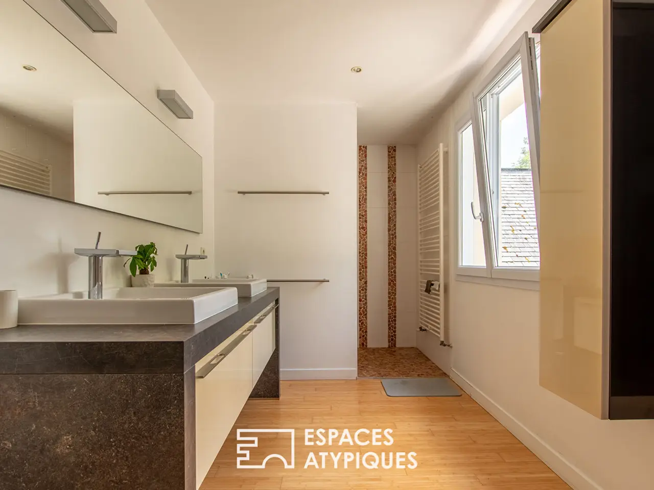 Located just minutes from Angers city center, in the private and verdant setting of Parc de la Haye, this house boasts a resolutely contemporary architecture spanning over 260 sqm.Nestled in the heart of a wooded environment overlooking the Saint-Nicolas pond, it seems to float between nature and modernity. Designed in perfect harmony with its landscaped setting, the house blends seamlessly into the decor.Upon entering, light floods in generously thanks to large bay windows. The view is immediately drawn to the open view of a lush, intimate, and wooded garden. The living room, a true central living space, elegantly unfolds its generous volumes and offers a soothing panorama of the surrounding vegetation. Here, nature literally penetrates the space. The ground floor, designed as a true living space, houses a kitchen with clean lines, extended by a scullery, a discreet linen room, and a pantry providing access to the garage. On this level, a first master bedroom with shower room completes the ensemble, in a logic of single-story living. A beautiful staircase leads to the two upper levels, where one discovers, on each floor, two large bedrooms, a vast bathroom, and a generous landing that can accommodate an office or a recreation room. The volumes are fluid, the circulations natural, always in the same spirit of openness and serenity. Every detail here has been carefully considered: understated materials, impeccable finishes, custom layouts. The whole exudes a rare atmosphere, a subtle alliance between architectural precision and plant-based calm.Less than 500 meters from amenities (transport, local shops) and 5 kilometers from the TGV station, this unique house offers a confidential lifestyle, between city and nature.REF. ARG4551Additional information* 7 rooms* 5 bedrooms* Floor : 2* 2 floors in the building* Outdoor space : 1107 SQM* Property tax : 4 369 €Energy Performance CertificateEPC : 93 kWhEP/m2.year* A 450GHG : 14 kgeqCO2/m2.year* A 80Agency feesThe fees include VAT and are payable by the vendorMediatorMediation Franchise-Consommateurswww.mediation-franchise.com29 Boulevard de Courcelles 75008 ParisInformation on the risks to which this property is exposed is available on the Geohazards website : www.georisques.gouv.fr