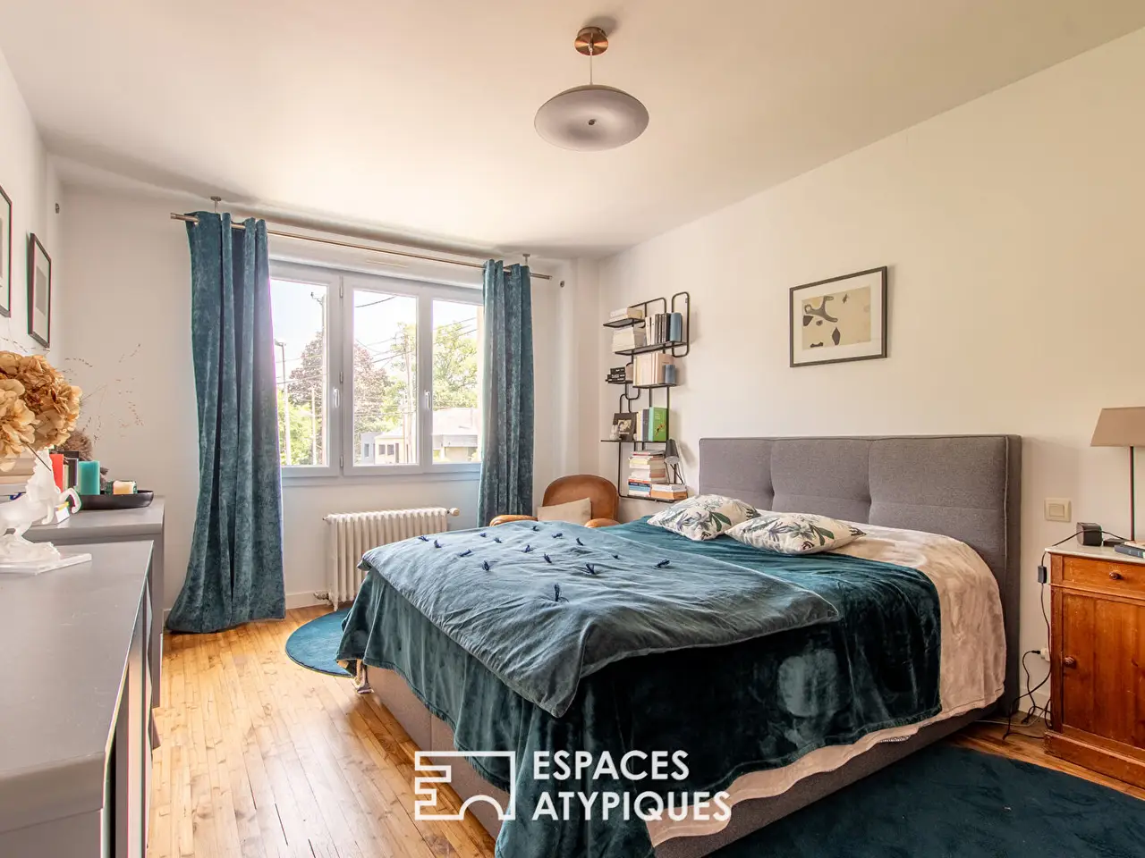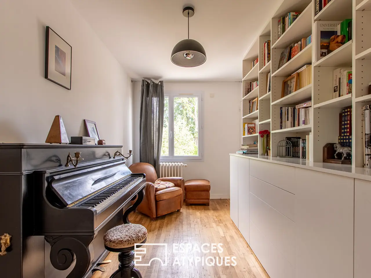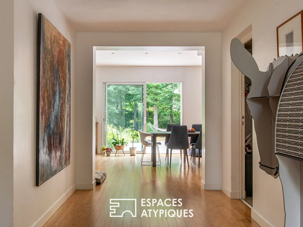 Located just minutes from Angers city center, in the private and verdant setting of Parc de la Haye, this house boasts a resolutely contemporary architecture spanning over 260 sqm.Nestled in the heart of a wooded environment overlooking the Saint-Nicolas pond, it seems to float between nature and modernity. Designed in perfect harmony with its landscaped setting, the house blends seamlessly into the decor.Upon entering, light floods in generously thanks to large bay windows. The view is immediately drawn to the open view of a lush, intimate, and wooded garden. The living room, a true central living space, elegantly unfolds its generous volumes and offers a soothing panorama of the surrounding vegetation. Here, nature literally penetrates the space. The ground floor, designed as a true living space, houses a kitchen with clean lines, extended by a scullery, a discreet linen room, and a pantry providing access to the garage. On this level, a first master bedroom with shower room completes the ensemble, in a logic of single-story living. A beautiful staircase leads to the two upper levels, where one discovers, on each floor, two large bedrooms, a vast bathroom, and a generous landing that can accommodate an office or a recreation room. The volumes are fluid, the circulations natural, always in the same spirit of openness and serenity. Every detail here has been carefully considered: understated materials, impeccable finishes, custom layouts. The whole exudes a rare atmosphere, a subtle alliance between architectural precision and plant-based calm.Less than 500 meters from amenities (transport, local shops) and 5 kilometers from the TGV station, this unique house offers a confidential lifestyle, between city and nature.REF. ARG4551Additional information* 7 rooms* 5 bedrooms* Floor : 2* 2 floors in the building* Outdoor space : 1107 SQM* Property tax : 4 369 €Energy Performance CertificateEPC : 93 kWhEP/m2.year* A 450GHG : 14 kgeqCO2/m2.year* A 80Agency feesThe fees include VAT and are payable by the vendorMediatorMediation Franchise-Consommateurswww.mediation-franchise.com29 Boulevard de Courcelles 75008 ParisInformation on the risks to which this property is exposed is available on the Geohazards website : www.georisques.gouv.fr
