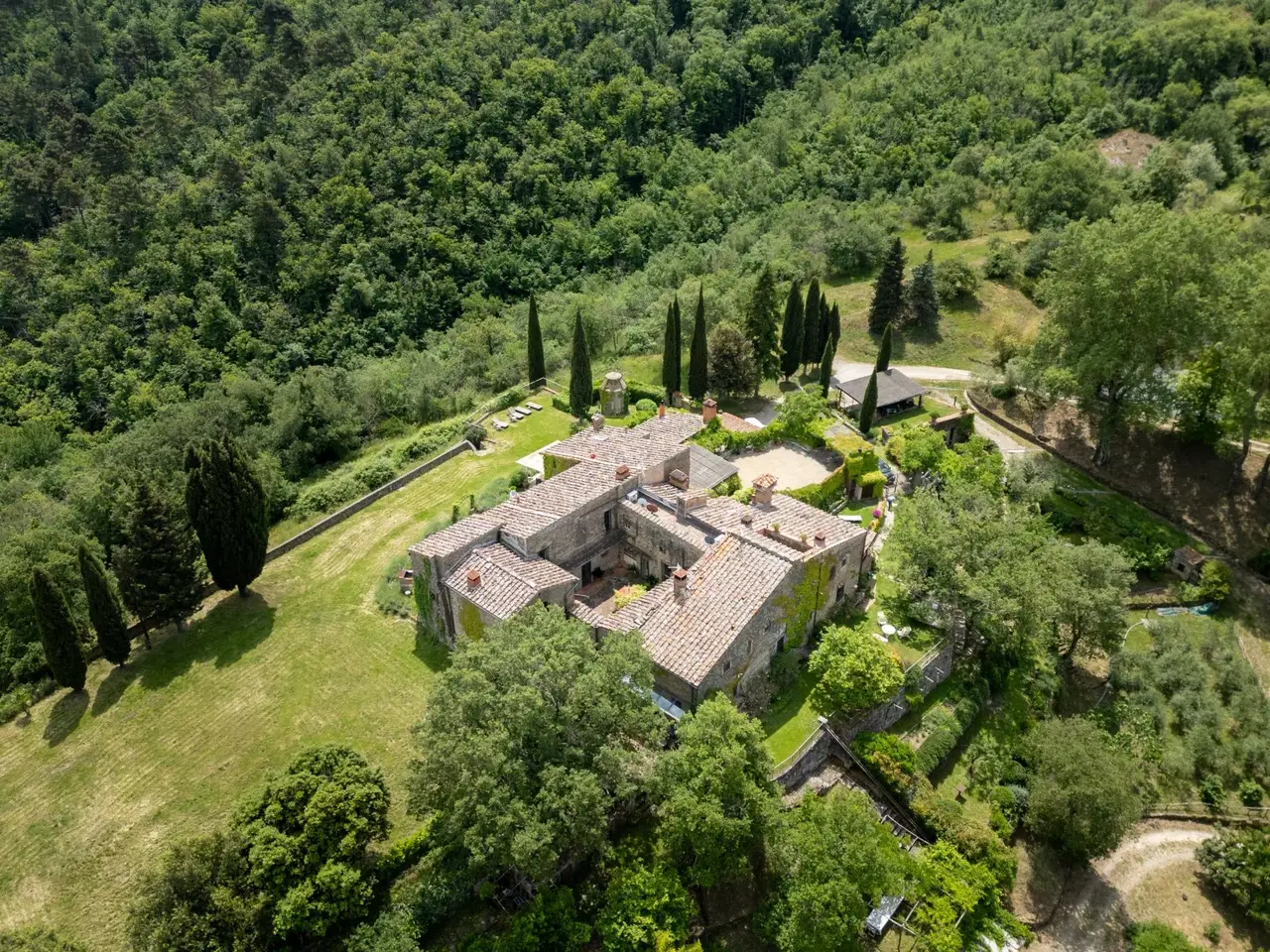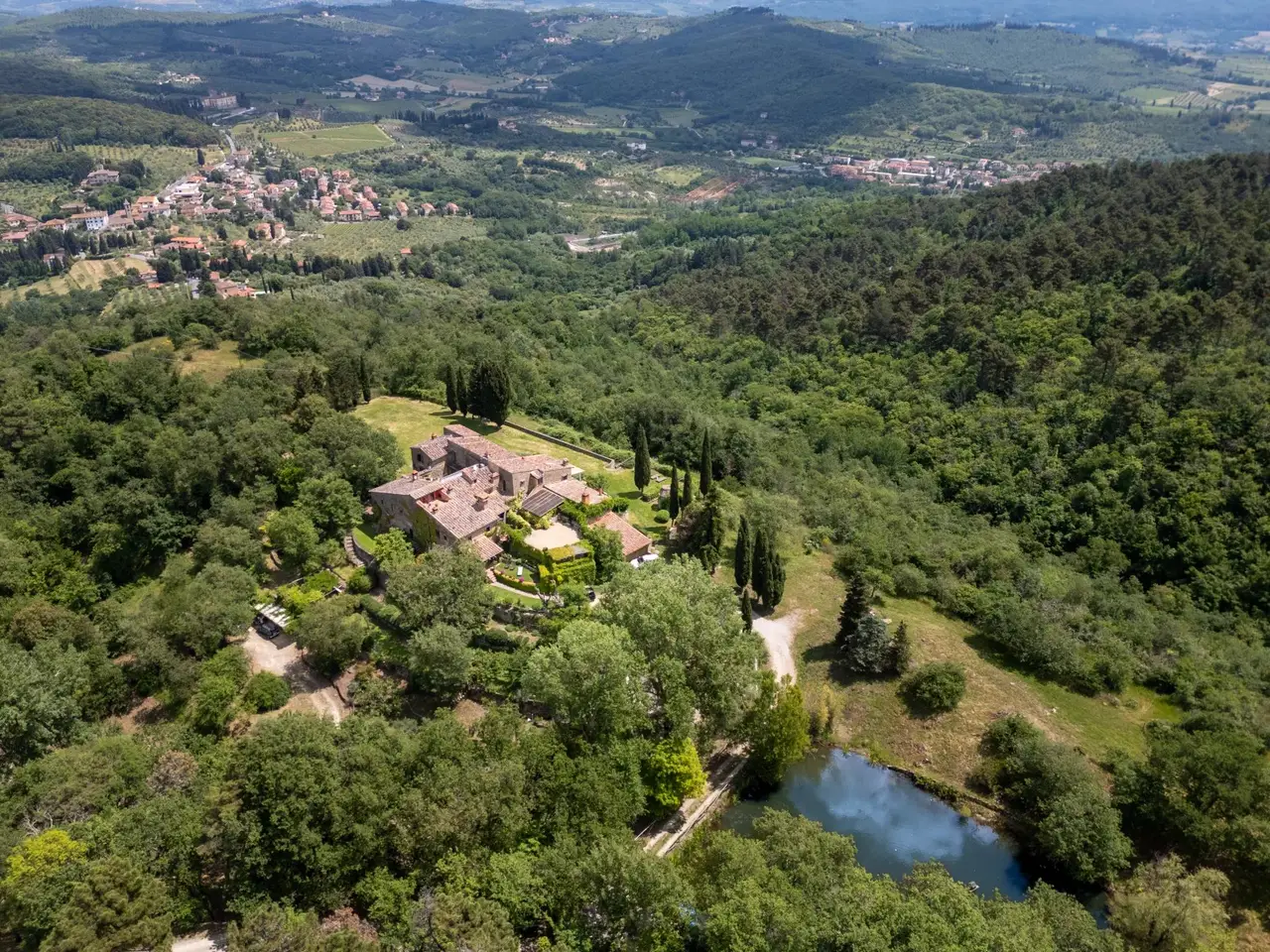 Located on the hills in the south of Florence, in a dominant position, surrounded by a large garden that forms a terrace overlooking the surrounding greenery. Through the entrance gate to the property you get to a clearing with a pond of water lilies from which you can see the stone structure of the farmhouse dating back to 1000. The exterior is enriched by spaces equipped and decorated with various types of herbs typical of the Mediterranean.. The property is distributed on two levels connected by two internal and external stairs.. On the ground floor we find the double living room with fireplace, the kitchen with walls covered in Sicilian majolica and a sink in reclaimed marble, the private dining room, the second dining room, two living rooms, the oven room, a service and a closet.. Upstairs there are four double bedrooms, a large closet, four bathrooms and two terraces. The rooms have handmade terracotta floors and living rooms in recovered terracotta. The ceilings have beams and bricks cleaned and painted in various shades. The walls have been left partly rustic and partly plastered and painted with natural shades of beige, ivory and soft yellow. The stained glass of the portico, constructed to measure by a local craftsman, reminds of a greenhouse.. One of the rooms, formerly a chapel, is characterized by a loft built in the late nineteenth century, which is accessed by a staircase in lacquered wood. The property includes a pergola for summer dinners, a garage of 40 square meters. ca., a technical room and a surrounding land of 36,000 square meters.