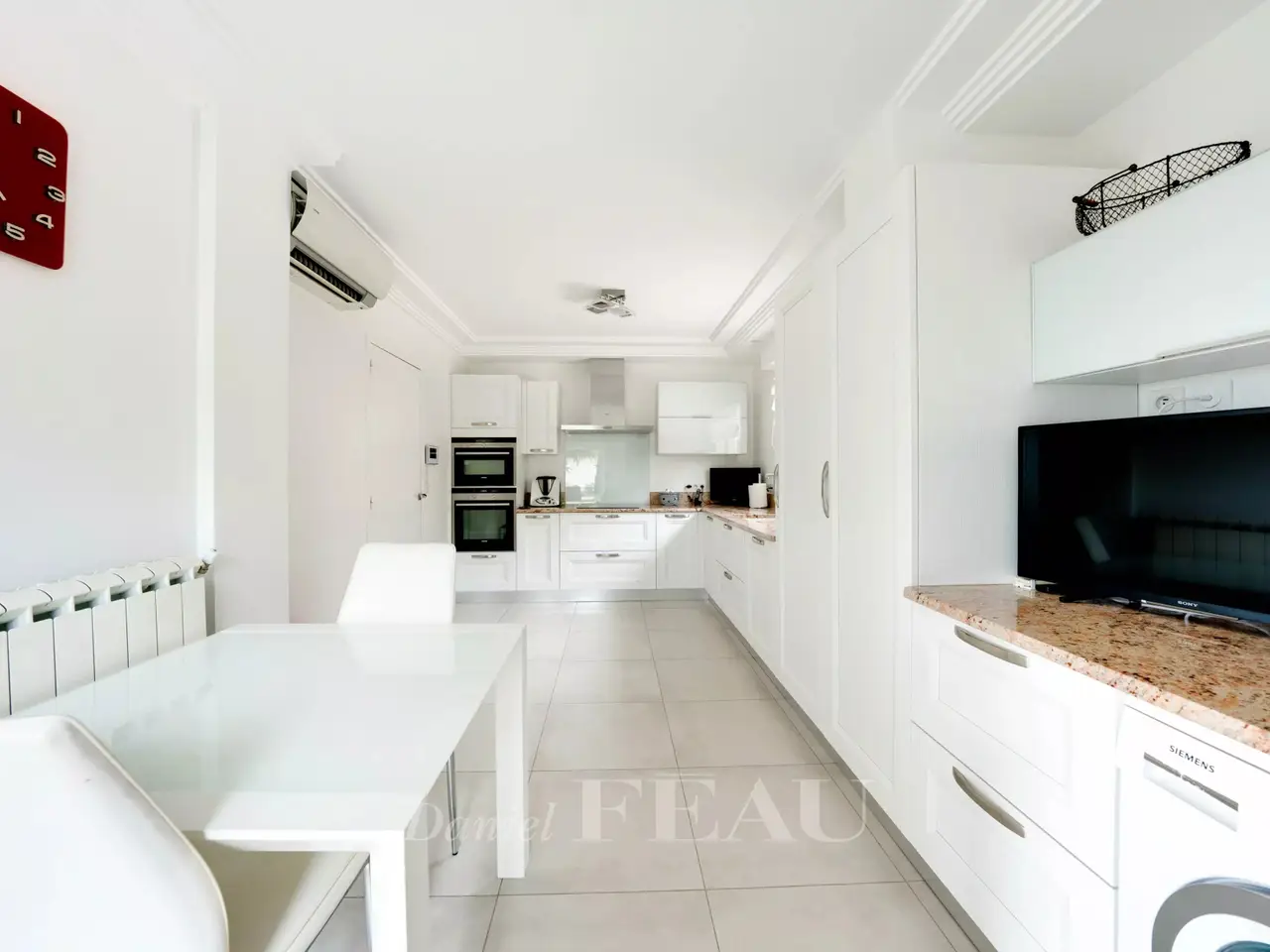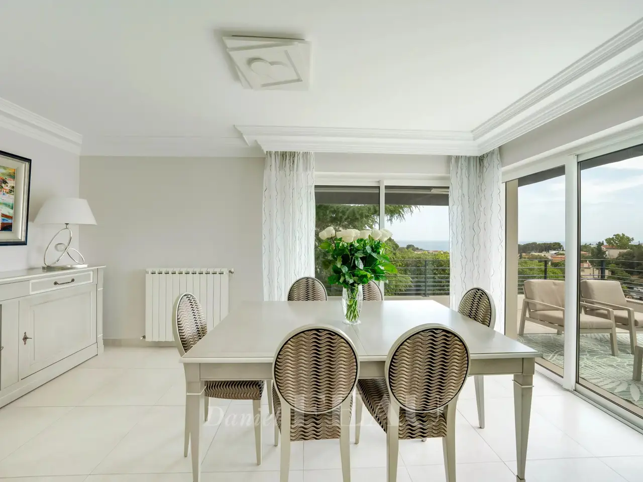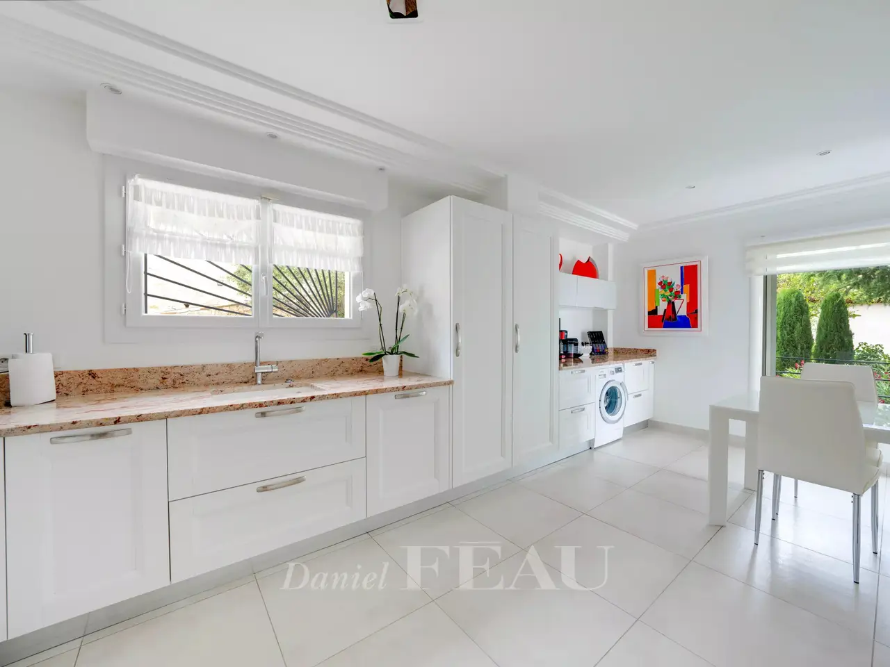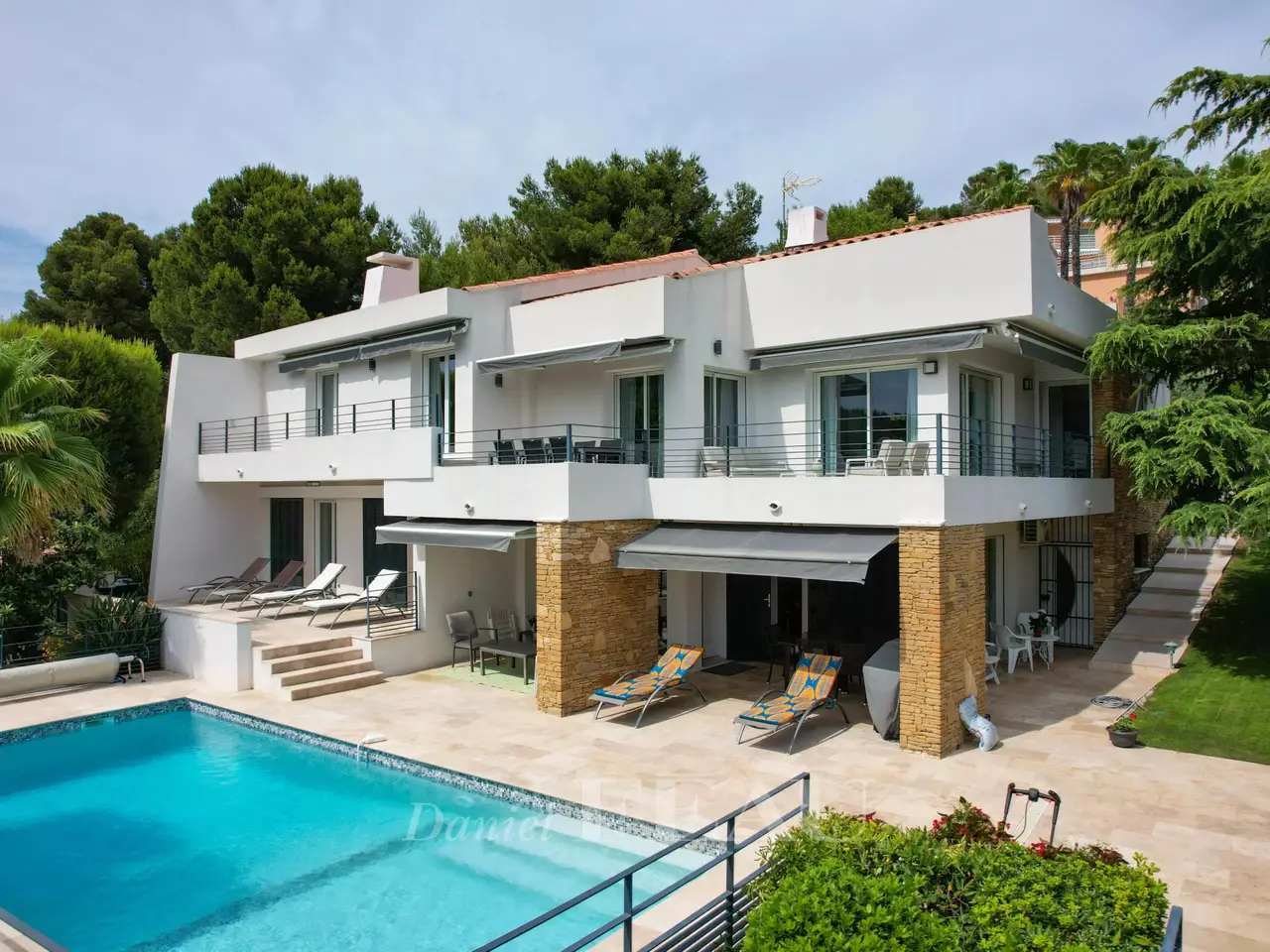 This near 210 sqm villa commanding a sea view is set in about 1200 sqm of grounds in a sought-after residential neighbourhood under 10 minutes from the beaches and near the shops. South-west facing and particularly bright, it includes a living/reception room opening onto a terrace commanding a sea view, a spacious kitchen, three bedrooms, a bathroom and a shower room. Accessed from both indoors and outside by means of a second terrace by the swimming pool, the garden level comprises a living room, a kitchen, two bedrooms and a shower room Meticulously renovated and beautifully appointed. With parking space for several cars.