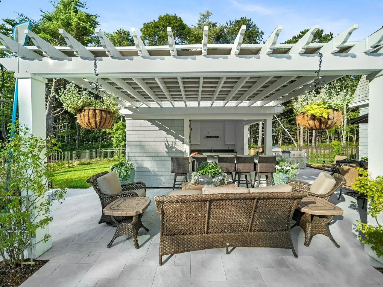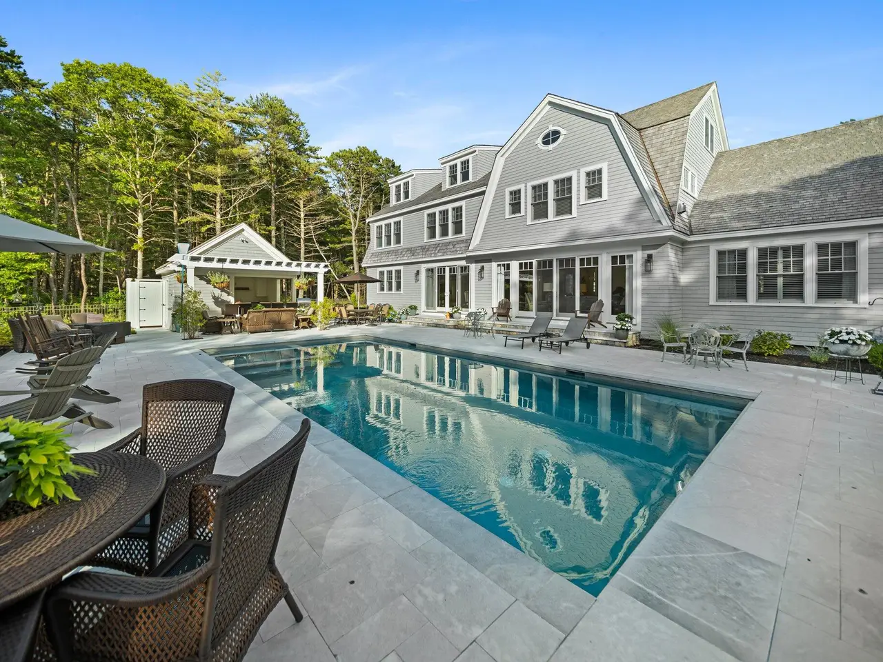 Pamper yourself and your family on this private Cotuit estate with the latest finishes in new construction. This contemporary-style Gambrel home, recalls the best of Cape Cod, and was designed for both beauty and function, featuring five-bedroom suites, including the Primary wing. Visible from multiple sliding glass doors and windows in the open floor plan is the salt-generated, heated pool with spa, & Cabana, with a kitchenette, grill area, and bathroom/shower beckoning you out to the private 2.24-acre yard. Or, if you're a beach person, take yourself to your private beach on Nantucket Sound where you can moor your boat. The floor plan flows from the custom kitchen through a dining area to the living room, with a stone surround on the gas fireplace. A wonderful surprise is the 3rd-floor family room with a comfy TV viewing station and a table for games for those stormy days, or long winter nights. A half bath and snack room make it convenient to stay the night. Two laundry rooms, one on the first floor, the other on the second, a pantry with a second fridge, and a large mudroom which leads to an in law suite above the garage. Mudroom has 2 built in kennels-a special property.