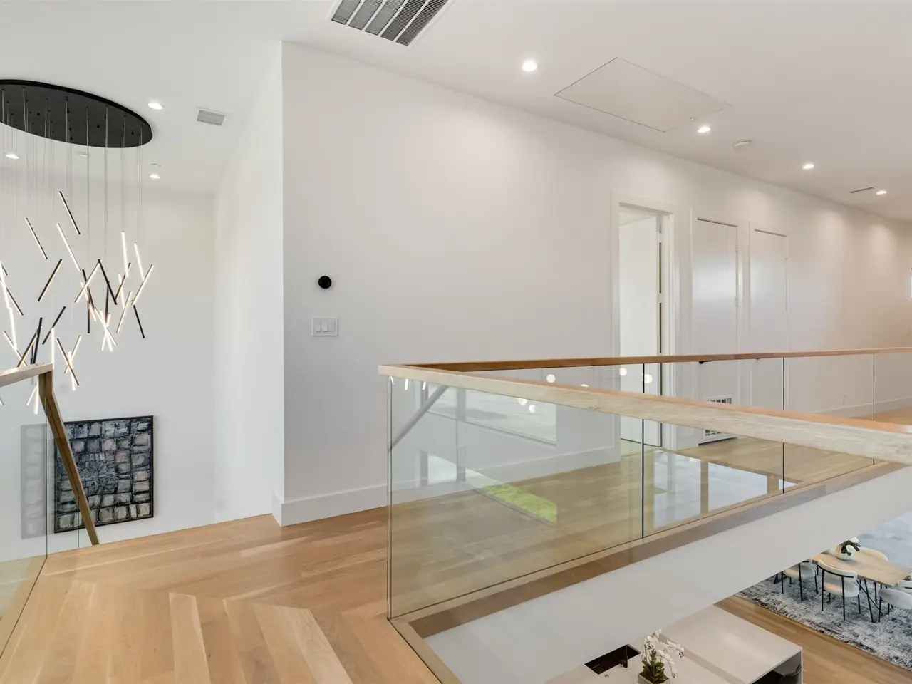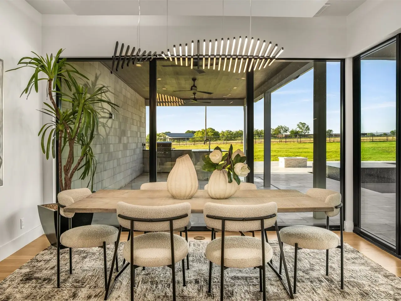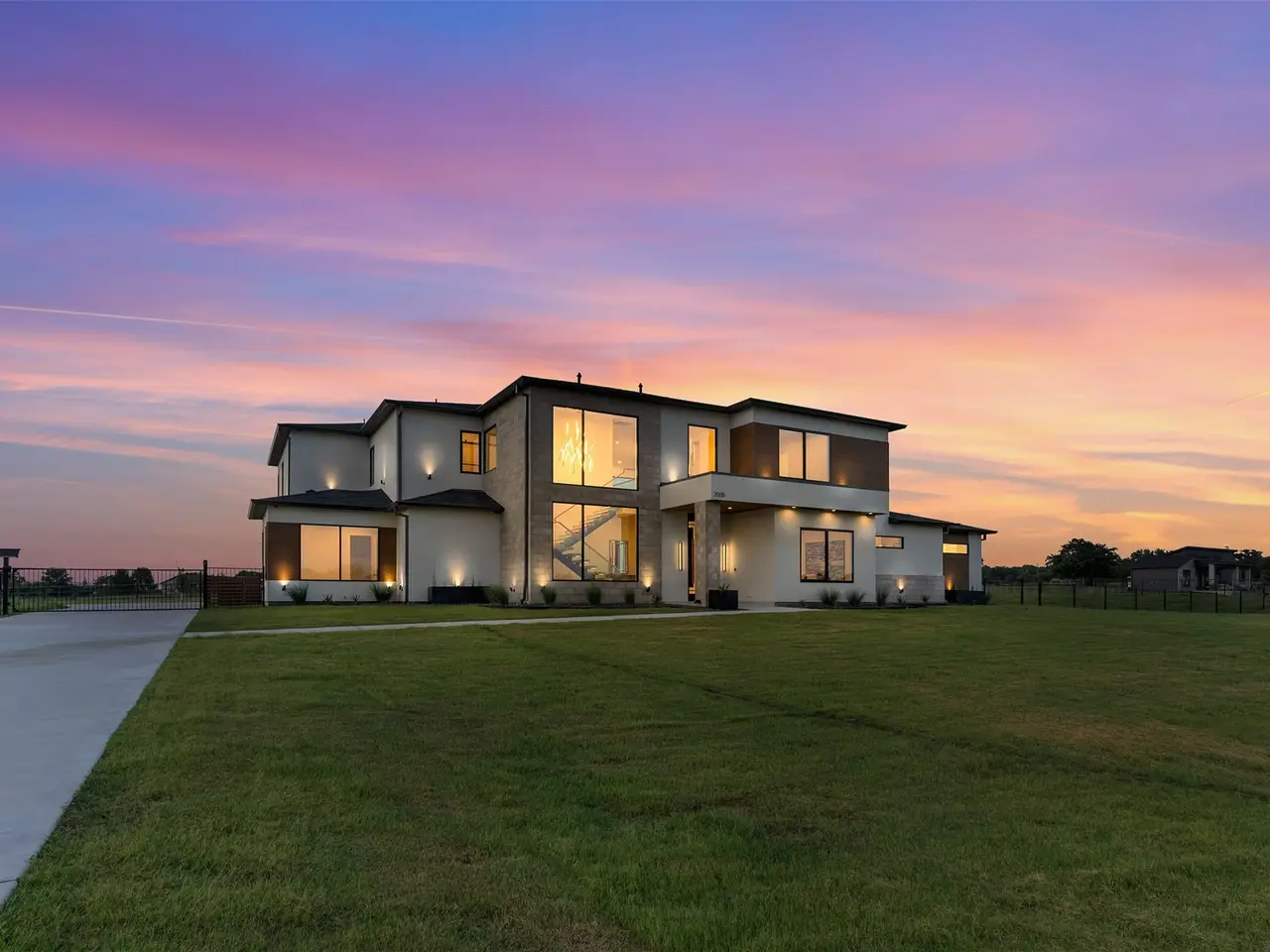 Modern Luxury on 2 Acres! Trifecta Estates - Built by Fourteen Construction Experience cutting-edge modern living on a sprawling 2-acre lot in the heart of Bartonville. This newly built showpiece by Fourteen Construction masterfully blends bold architectural design with luxurious amenities, all set within the prestigious Trifecta Estates. An impressive pivot door sets the tone for what's inside - where clean lines, a floating staircase, and flawless Level 5 smooth wall finishes create an unforgettable first impression. Natural light pours through expansive walls of glass, framing stunning views of the resort-style backyard from the open-concept living, kitchen, and dining areas. At the heart of the outdoor oasis is a large sparkling pool, flanked by two expansive covered patios, perfect for entertaining or relaxing in style. The outdoor kitchen is fully equipped and ready for your next gathering. Inside, enjoy elevated features like a linear fireplace, LED-lit master closet, and zero-maintenance exterior siding. Thoughtfully engineered for comfort and performance, the home includes spray foam insulation, two tankless water heaters, a heavy-duty foundation with piers, and full Ethernet cabling. Pre-wired for security cameras and integrated audio both inside and out. Rounding out this modern marvel is a 4-car garage, high-end designer lighting throughout, and timeless attention to detail in every room.