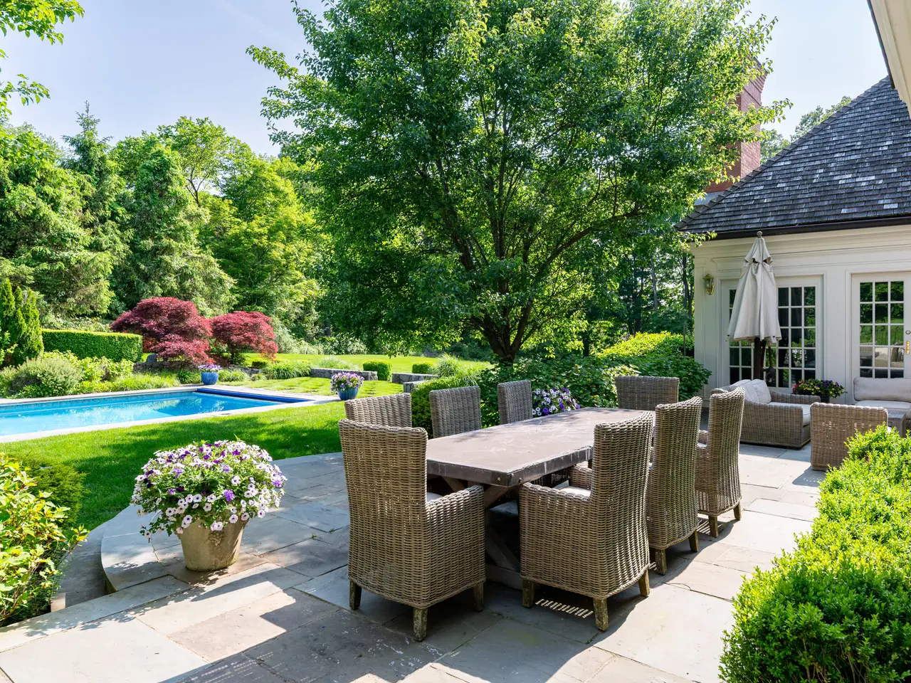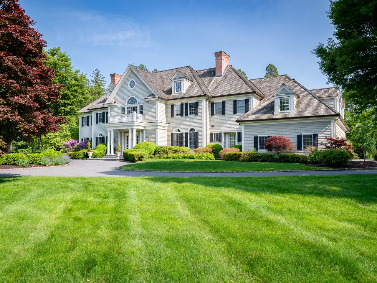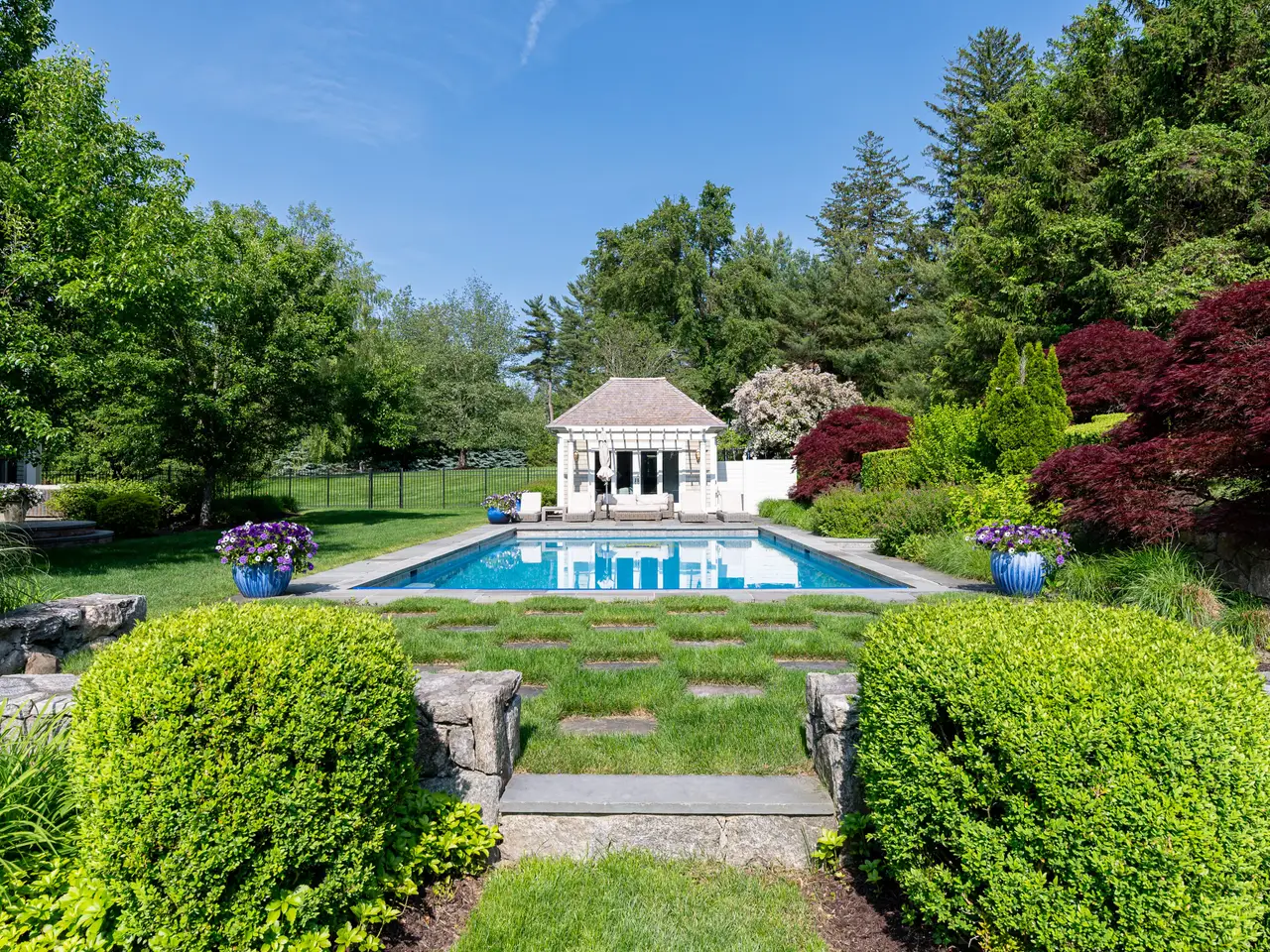 The pinnacle of Modern Colonial elegance in Pound Ridge: timeless classicism elevated to a grand scale, featuring spacious rooms, prestige amenities and luxury finishes crafted for contemporary comfort. Set on 3.7 acres on exclusive Great Hill Farms Road, its minutes from both Bedford Village and Stamford and an hour to Manhattan. Sunlight streams through the double-height entry, illuminating marble floors, custom paneling, and striking contemporary chandelier. The formal living room with wood-burning fireplace, exquisite millwork and French doors to a terrace opens to a sunroom wrapped in windows. A large dinging room also offers French doors to the private patio. The chef's kitchen dazzles with dramatic lighting, custom banquette and top-tier Wolf range and Thermador refrigerator, which is open to the family room with a beautiful stone fireplace. Upstairs, the luxurious primary suite boasts twin sets of French doors leading to a balcony, two spa-quality baths, and dual custom dressing rooms. Two additional ensuite bedrooms and two other bedrooms that share a bath complete the upper level The lower level offers everything for full-on recreation: a glass-enclosed gym, cinema room, family room, guest suite, wine cellar and full bar. Outside is a resort style escape offering spectacular landscaping, inviting pool and charming pool house and bocce court offering relaxation and recreation. This Pound Ridge paradise, with easy access to the Merritt and 684, is a rare fusion of heritage home and private luxury resort.