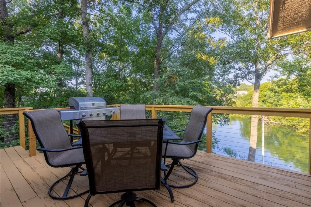 Park-Like, Secluded Lake-Front Living! 1.66 double lot with killer views and a private dock and covered boat lift. The oversized kitchen features granite counters, a double oven, gas cooktop, coffee station and massive amounts of storage. Throughout the upstairs, enjoy expansive lake views with 3 double doors accessing the deck and screened in porch. The upper living area has a propane fireplace while the lower level has a wood burning fireplace. In the primary bedroom + bath you'll find a private deck area, two walk-in closets, gorgeous marble double vanity, soaking tub, tiled shower and another walk-in closet. The laundry room has a sink with granite counters and even MORE storage. Downstairs you'll find 2 bedrooms, one full bath, and another living room/game room - the pool table conveys- and a wet bar to entertain your guests! Ice machine, sink + mini fridge in the downstairs bar convey as well. Brand new HVAC system in Jan 2024, Hot Water Tank 2019. New dishwasher in 2025. Lower level shop area + so much more!