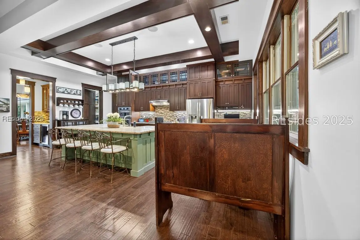 A first time offering for this one-of-a-kind, custom built home in Hampton Hall. This craftsman style masterpiece offers wonderful details and high-end finishes at every turn and is situated on one of the most private and scenic golf view homesites in the community. As you travel down the long drive, canopied by beautiful trees, you know you're in for something special. 4 BRs & 3.5BAs in the main house accompanied by a home office, a spectacular laundry room, formal & casual dining rooms, a bunk room, and large bonus room that leads to the second story covered golfer's porch. The master suite is on the main level and boasts a Lighthouse Award winning master bathroom. Through the covered breezeway to the 1100 sq/ft 3 car garage and you'll find a fabulous in-law suite complete an its own kitchen, bedroom, bath, and living space. This is a unique and special opportunity to purchase one of the finest homes in Bluffton's most popular community.