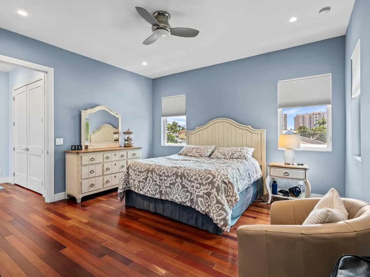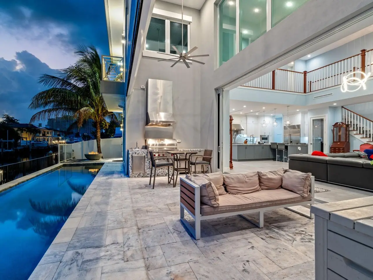 807 Dover Street, a 2021 custom built in Boca Raton's exclusive Bel Marra on 85+/- feet of waterfrontage, and direct ocean access with no fixed bridges, which offers a seamless blend of contemporary and classic design. Inside, high ceilings and premium finishes define the open, light-filled spaces. The chef's kitchen features high-end appliances with natural gas and is complemented by a dedicated wine room. The primary suite, located on the main level, overlooks the waterfront. A private elevator accesses the second floor, which includes a VIP suite and three additional guest rooms. Outside, sliding glass doors open up to the lanai with a remote phantom screen feature and summer kitchen. The property boasts a resort-style pool and spa.