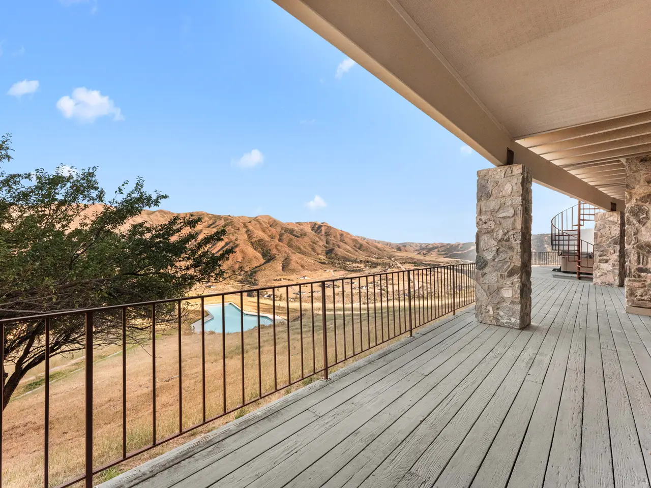 Experience over 17 acres of rural Idaho living, just 35 minutes from Boise with sweeping views of the Sawtooth Mountain Range in every direction! This charming mountain estate offers a spacious main residence and a flexible guest house/ADU. A 24’x47’ in-ground pool overlooks the endless mountain range. The interior features hardwood flooring, intricate mahogany woodwork, cathedral ceilings with exposed wood beams, and expansive architectural windows that frame the natural landscapes. Main-level master suite features direct balcony access, dual walk-in closets, and spacious en suite bathroom. On the lower level, enjoy a vast bonus room with a wet bar, a cozy library, three additional guest bedrooms and a newly renovated bathroom. The elevated guest house offers open-concept living, dining, and kitchen area, a secluded bedroom, and a full bathroom. Minutes from hiking, biking, hunting, & Lucky Peak dock access. HOA maintains roads for year round ease. Steel roof with 30 yr warranty & 500 gal propane tank.