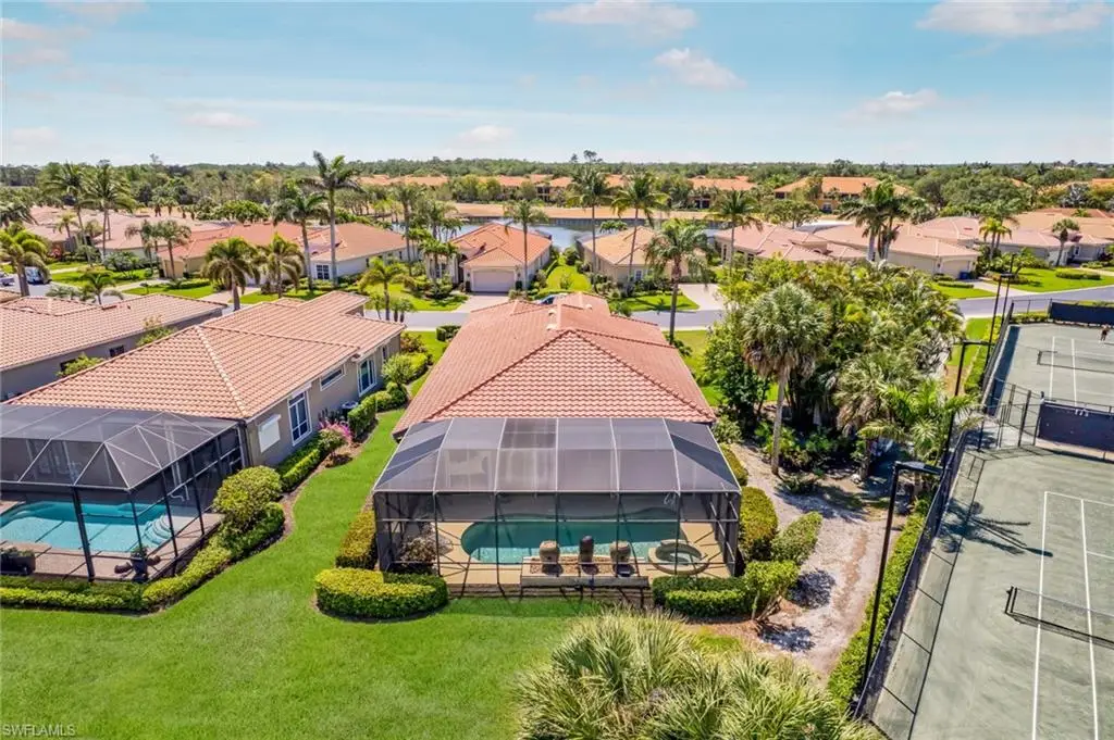 Welcome to Vasari Country Club, a premier bundled golf community where golf membership is included with homeownership and the atmosphere is as warm and welcoming as the Florida sunshine. Known for its beautifully manicured grounds and vibrant, social lifestyle, Vasari offers an exceptional array of amenities including championship golf, tennis, bocce, fitness center, card rooms, and a full calendar of social events - your seasonal playground awaits. This beautifully updated 3-bedroom plus den, 2-bath home is ideally located just steps from the clubhouse. An open-concept floor plan with abundant natural light creates an inviting space that's perfect for entertaining or relaxing with friends and family. Elegant crown molding, new quartzite countertops, and luxury appliances including Viking, Bosch, and Fulgor Milano add both style and function. The kitchen also features a wine refrigerator and dedicated ice maker. A glass-front entry door welcomes you into a home with custom built-in cabinetry in both the den and the primary suite's walk-in closet. The spacious 2-car garage includes an epoxy floor for a polished finish. Step outside to your own private retreat, where a sparkling pool and spa overlook the golf course and lake - offering the perfect backdrop for stunning sunset views and evening gatherings under the Florida sky. A new roof provides added peace of mind. Some rooms have been virtually staged; empty room photos are also included. Dive into everything this premier bundled golf neighborhood has to offer - lounge at the resort-style pool with poolside service, then unwind or connect with friends at the lively clubhouse, featuring the popular Taverna bar and restaurant. The main clubhouse also boasts outdoor terrace dining overlooking the 18th tee, along with a 20-seat bar and casual grill for relaxed evenings and social gatherings. Perfectly located near sandy Gulf beaches, downtown Naples, and RSW airport, this property offers convenient access to world-class dining, shopping, the arts, walking and biking trails, and more - everything you need to live the Southwest Florida lifestyle to the fullest!