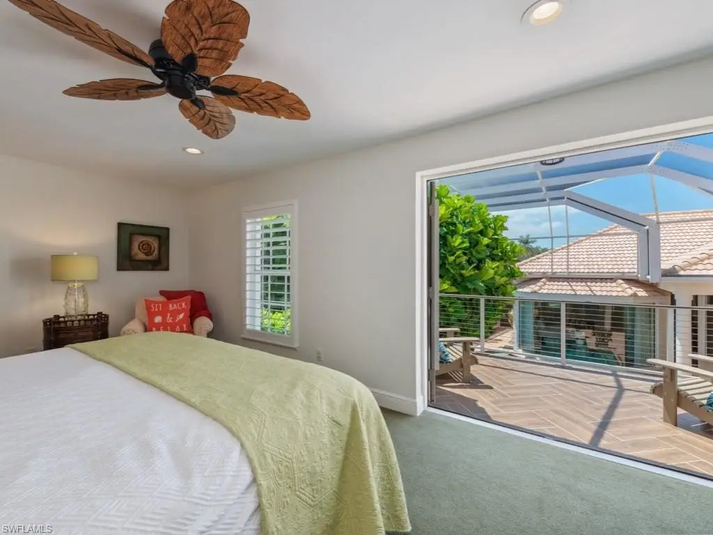 Step into a world where luxury meets tranquility in this meticulously maintained and impeccably upgraded lakefront home in Anchorage at Bonita Bay. Walk through elegant French doors, revealing an expansive, screened courtyard - a true outdoor sanctuary. You are greeted by a private pool and spa complemented by a covered seating area, a cozy fire pit, and a built-in BBQ area for al fresco dining. The star of this oasis is a mature fiddle leaf fig tree, adding a touch of natural grandeur that truly steals the show. This exceptional residence boasts 4 bedrooms plus a den, 3.5 baths, a great room, and an additional bonus room/sleeping area. The newly renovated 2021 kitchen is a chef's dream. It features a spacious walk-in pantry, a large island with a convenient prep sink, and ample cabinetry. Top-of-the-line appliances include a 2021 Jenn-Air induction stove, a 2021 Bosch dishwasher, and custom built-in Sub-Zero refrigerator and freezer, all illuminated by a charming skylight. Retreat to the generous primary suite, a haven complete with private outdoor access, picture windows capturing serene courtyard views, and a walk-in closet with custom cabinetry. The bathroom is divided by his and hers, connected by a grand walk-in shower. Adding to the home's allure is a cabana guest house. This private retreat boasts a flexible layout, allowing for a three-bedroom setup; it presents a studio apartment feel on the main floor, while the upstairs can easily be converted into two bedrooms. Equipped with a kitchenette, dining room, sitting area, full bath, patio, and a new balcony, your guests will find all the comforts necessary to embrace the relaxed Southwest Florida lifestyle. Enjoy peace of mind with 3 newer air conditioners, a 2021 roof, newer solar panels, and a reverse osmosis water system. The home also features a Bluetooth entertainment system with Control4, curating the perfect environment for entertaining. The attached two-car garage includes epoxy flooring and high-end cabinetry. Nestled on a quiet cul-de-sac, this property offers ultimate seclusion. As a resident of Bonita Bay, you'll enjoy exclusive access to a wealth of amenities including a private beach park, the popular Backwater Jack's Restaurant, and several community parks. Riverwalk Park offers a kayak, canoe, and boat launch, along with pickleball and tennis courts for active living. For golf enthusiasts, there’s an opportunity to join the Country Club, which boasts five championship golf courses, a sports/racquet center with a resort-style pool, and a state-of-the-art fitness facility, along with a luxury spa and salon. Furnished with some exclusions, this home is move-in ready, inviting you to immediately embrace the unparalleled Bonita Bay lifestyle.