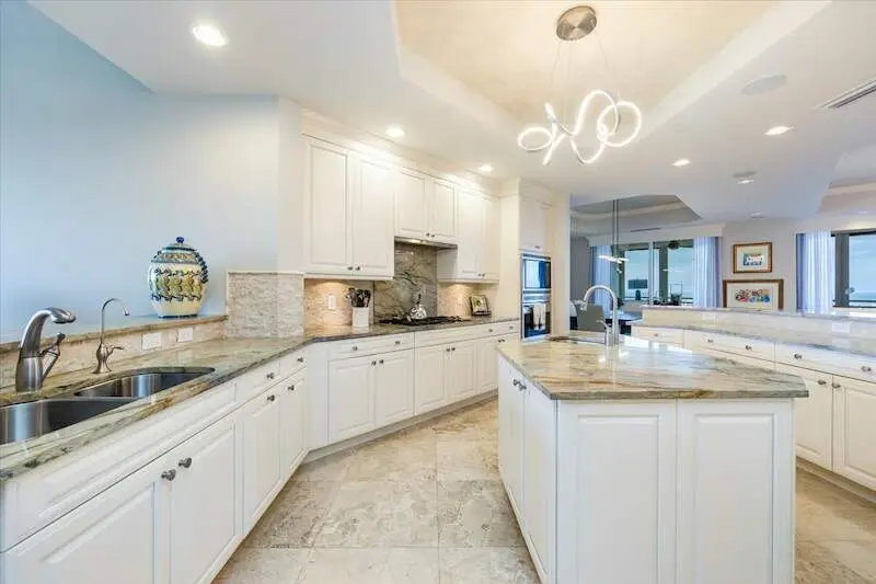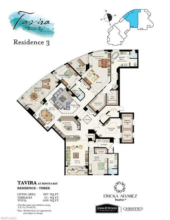 BACK ON THE MARKET AND NOW OFFERED AT THE BEST PRICE - Unit 2203 at Tavira, Bonita Bay is a stunning 22nd-floor sky home that captures the essence of luxury living in paradise. This rare opportunity combines breathtaking views, timeless elegance, and an unmatched value, making it one of the most distinguished residences available in Bonita Bay Enjoy Unforgettable sunset panoramas views from the screened lanai facing the Gulf The gourmet kitchen is equipped with a Wolf gas cooktop, electric oven, Sub-Zero refrigerator, and high-end granite countertops. The spacious layout includes separate living and family rooms, an enclosed terrace with views of Estero Bay, and dual custom closets in the master suite. Tavira offers exceptional amenities, including a full-time resident manager, social and card room, theater, fitness center, and a pool and spa. With two guest suites for visitors, this residence combines elegance and comfort in a beautiful setting.