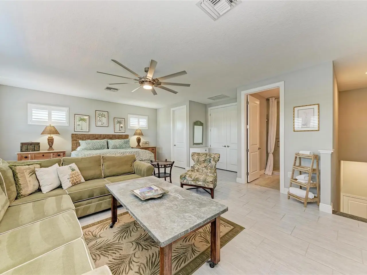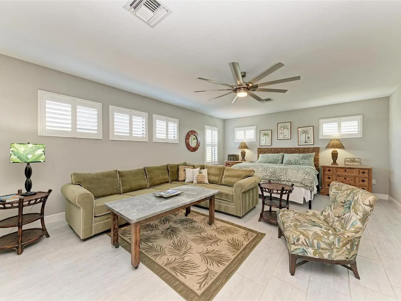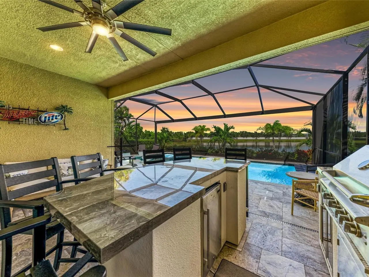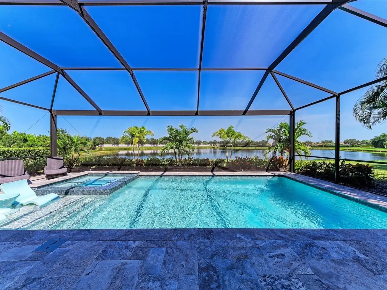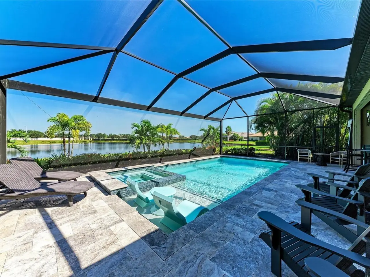 Discover this beautifully upgraded 4 bedroom, 4.5 bathroom home with tranquil water views in the gated Rosedale Golf & Country Club, designed for both luxury living and effortless entertaining. Featuring tile flooring throughout, crown molding, plantation shutters, custom draperies, and designer light fixtures, every detail has been thoughtfully curated to create a space that is sophisticated, welcoming, and move-in ready. The chef’s kitchen is a showpiece, offering granite counters and backsplash, custom cabinetry, abundant prep space, high-end KitchenAid appliances, a 5-burner gas cooktop, walk-in pantry, and a large island with breakfast bar and seating for family and friends. A butler’s pantry connects the kitchen to the formal dining room, making entertaining effortless. The kitchen opens to the great room, where sliding doors lead to the amazing outdoor living area. The backyard is an entertainer’s dream. Host gatherings or relax outdoors with a spacious entertaining area, heated saltwater pool and spa with sun shelf, travertine pavers, and lush, upgraded landscaping. The outdoor kitchen features two small beverage/wine refrigerators and a large island with seating, creating the perfect space for grilling, poolside dining, or enjoying quiet moments while taking in the beautiful water views. The owner’s suite is a luxurious retreat, offering picturesque water views, a large walk-in closet, dual sinks with granite counters, and a walk-in frameless glass shower. Two additional first-level bedrooms with ensuite bathrooms offer privacy and comfort. Upstairs, a generous loft bedroom suite with full bath and walk-in closet is ideal for overnight guests, extended stays, or a versatile media/game space. Additional upgrades include impact-resistant windows and sliding glass doors, tankless gas water heater, gutters, and designer touches throughout, ensuring both beauty and functionality. Living in Rosedale Golf & Country Club offers a resort-style lifestyle. Low HOA fees cover all landscaping and irrigation maintenance, high-speed fiber internet and cable, two manned 24/7 guard gates, plus two dog parks for residents. Social membership at the club provides access to tennis, a 22,000 sq ft clubhouse, fitness center, studio classes, full-service restaurant, Jr. Olympic-size heated pool, and year-round social events. For the avid golfer, Rosedale offers various levels of optional golf membership. Ideally located near I-75, Lakewood Ranch, UTC Mall, top-rated schools, shopping, dining, parks, medical facilities, and world-famous beaches, this home perfectly blends luxury, comfort, and an entertainer’s dream lifestyle.