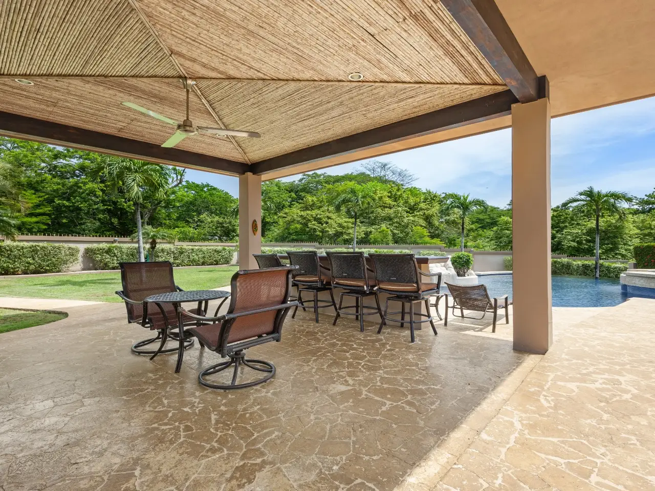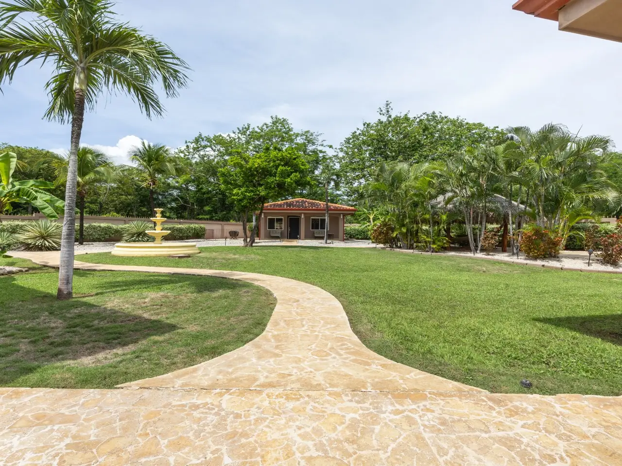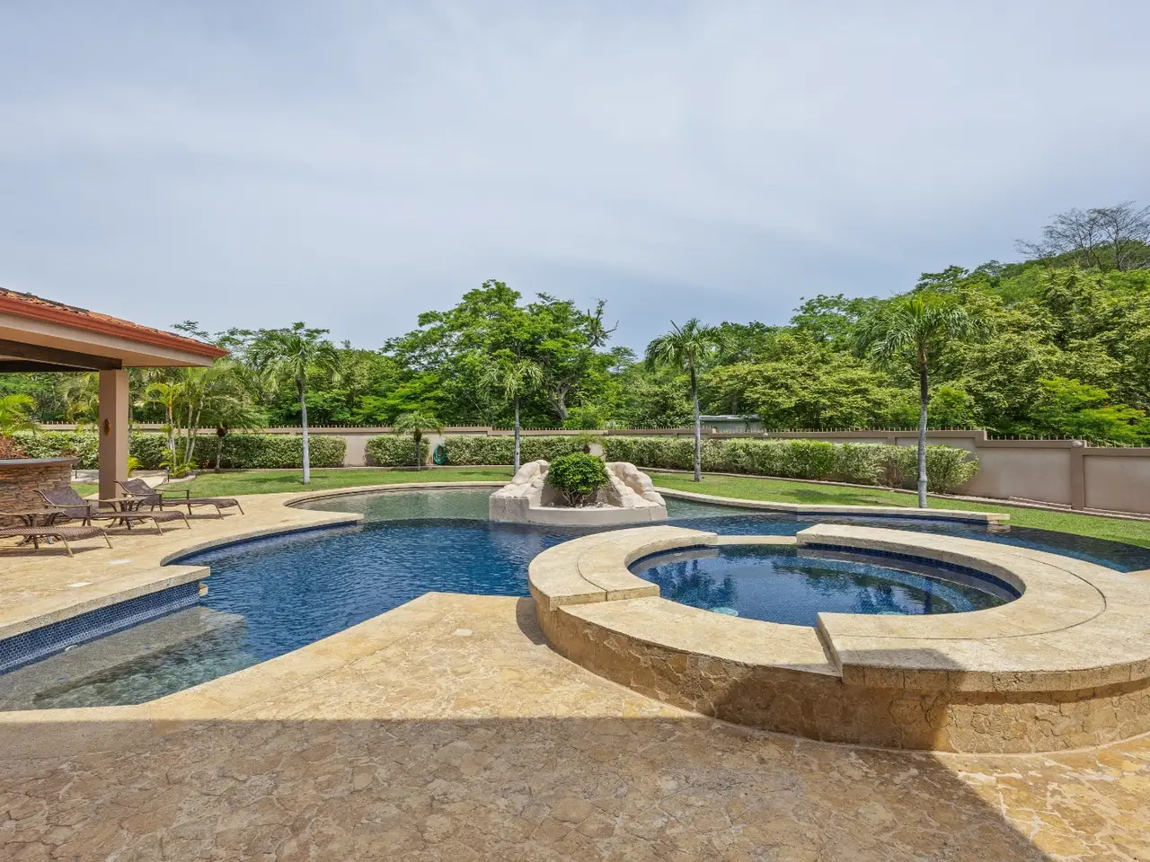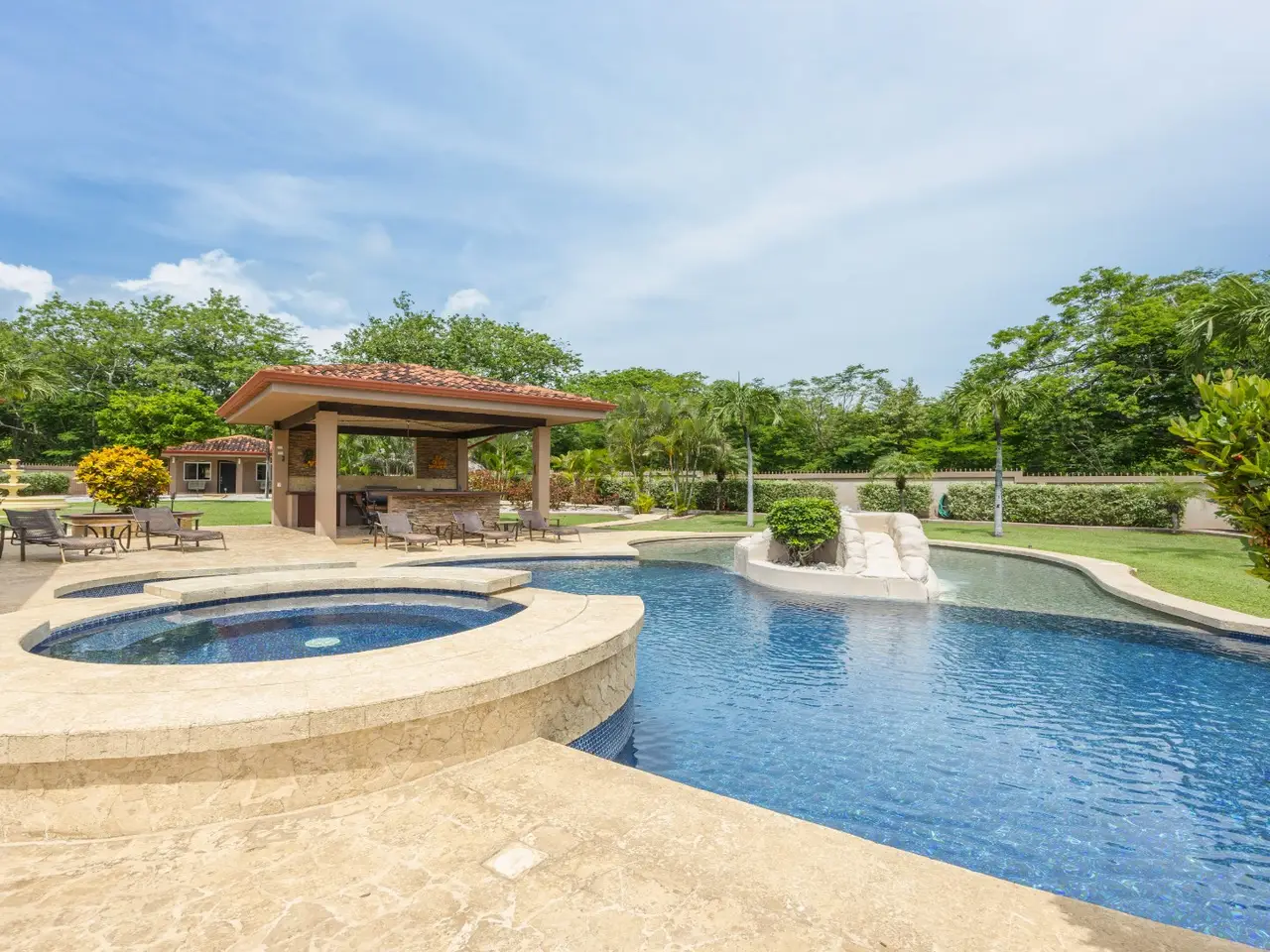 Exquisite Estate in Catalina Cove – Walk to the Beach, Live the Dream Welcome to Casa La Salle, a breathtaking private estate located in the gated community of Catalina Cove, just a short walk to the golden sands of Brasilito Beach and minutes from Playa Conchal. Spanning over 7,000 sq ft in the main residence and complemented by a 600 sq ft guest house, this 5-bedroom, 5.5-bathroom tropical retreat is set on a lush 5,451 m² (1.35-acre) fully fenced lot with impeccable landscaping, privacy, and space to entertain on a grand scale. From the moment you enter the estate through the long palm-lined driveway, you're greeted by elegant Mediterranean-inspired architecture, a resort-style pool with a cascading stone waterfall, a large jacuzzi, sun deck, outdoor kitchen, and tranquil fountain courtyard—all surrounded by mature palms and tropical gardens. Designed for relaxed luxury and effortless entertaining, the main living area features soaring vaulted ceilings, ample seating for large groups, and a seamless indoor-outdoor flow. The expansive chef’s kitchen is the heart of the home, complete with granite countertops, stainless steel appliances, custom hardwood cabinetry and a large center island perfect for gathering. Adjacent to the kitchen, a dedicated bar and lounge area opens to an oversized covered terrace and resort-style BBQ rancho—ideal for outdoor dining, poolside cocktails, or hosting family and friends in style. The main residence includes four spacious bedrooms, each with large windows and generous built-in closets. Two luxurious primary suites open directly onto the pool terrace and offer private covered sitting areas, spa-inspired bathrooms, and serene office nooks—providing the ultimate sanctuary for rest, productivity, and retreat. The 2 guest bedrooms offer king beds with en suite bathrooms. The independent guest house offers a full bedroom, bath, kitchen, and living space—ideal for visitors, caretakers, or rental income potential. Property Highlights: • 4 king beds & 1 bed | 5.5 baths across two homes with spacious social areas • Resort-style pool + jacuzzi with waterfall feature • Outdoor kitchen and BBQ area ideal for entertaining or hosting events • Multiple covered outdoor terraces for lounging, dining, and entertaining • Manicured landscaping, tropical palms, and decorative fountains • Secure, walled property with automatic gate and ample parking • Walk to the beach, shops, and restaurants • Located minutes from Playa Brasilito, Playa Conchal, Playa Flamingo, Tamarindo, Playa Grande, and the new Marina Flamingo • Close to top-rated international schools (La Paz and CRIA), shopping, and surf beaches • High-speed fiber optic internet • 2 car garage, and 2 storage rooms • Fully furnished and turnkey ready Whether you're looking for a luxurious full-time residence, a multi-generational family retreat, or an income-generating property in a prime beachside location, this Catalina Cove estate offers it all. Schedule your private showing today and experience the best of coastal luxury living in Guanacaste, Costa Rica.