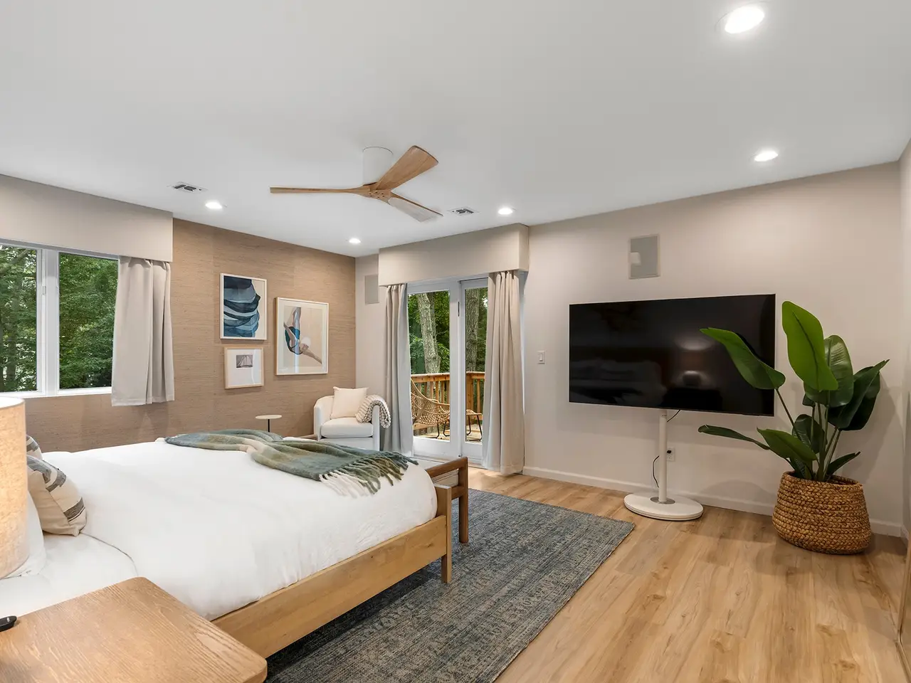 RR# RP250704 Secluded yet close to the Village, this split-level contemporary features four bedrooms and four baths. Living room with fireplace, sunroom, dining room, kitchen, extensive decking. The 20' x 40' pool is set amid the very private, wooded 2.8-acre property. .