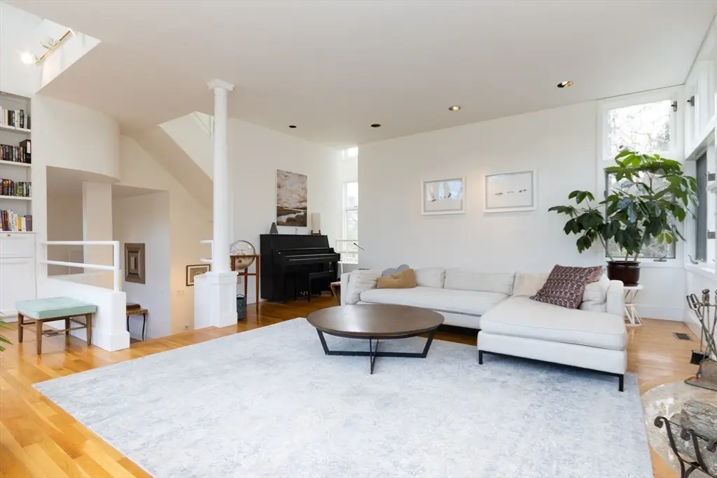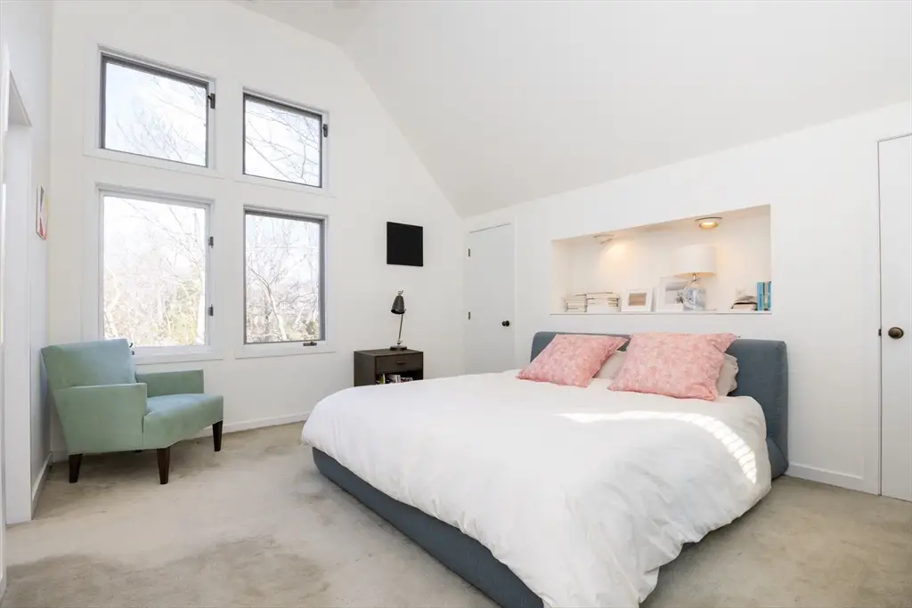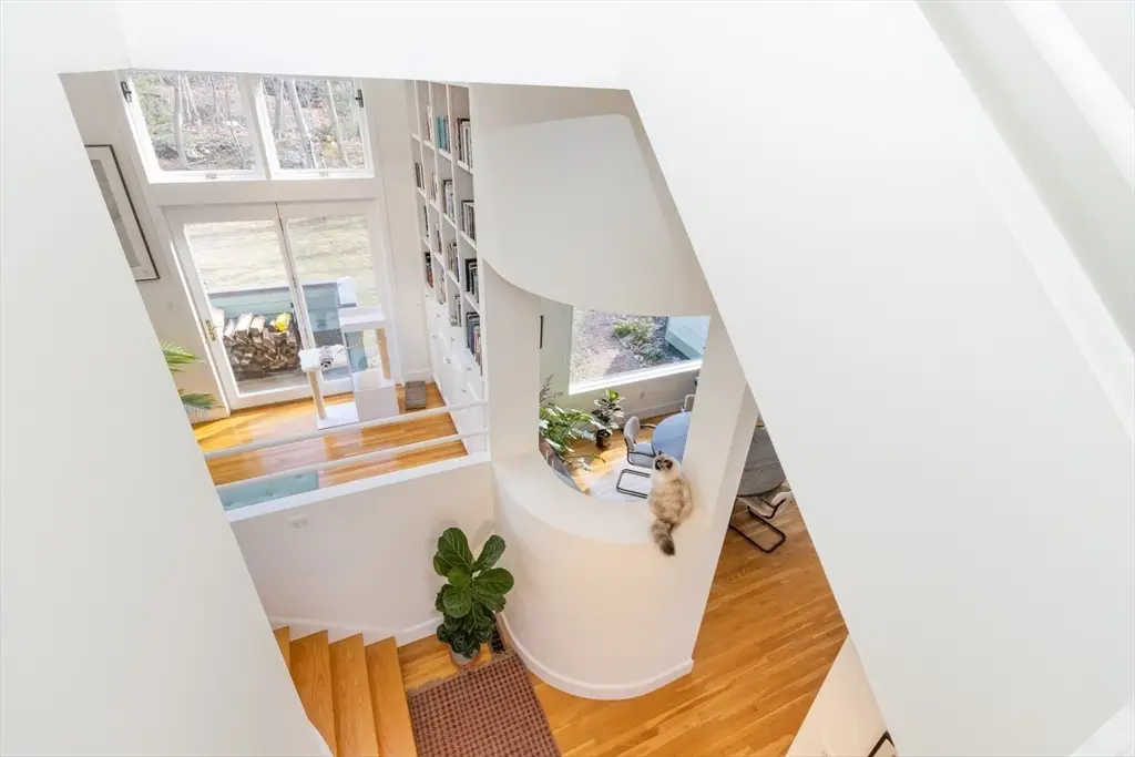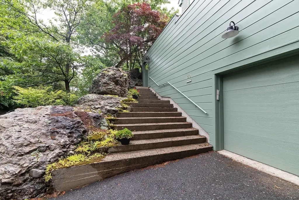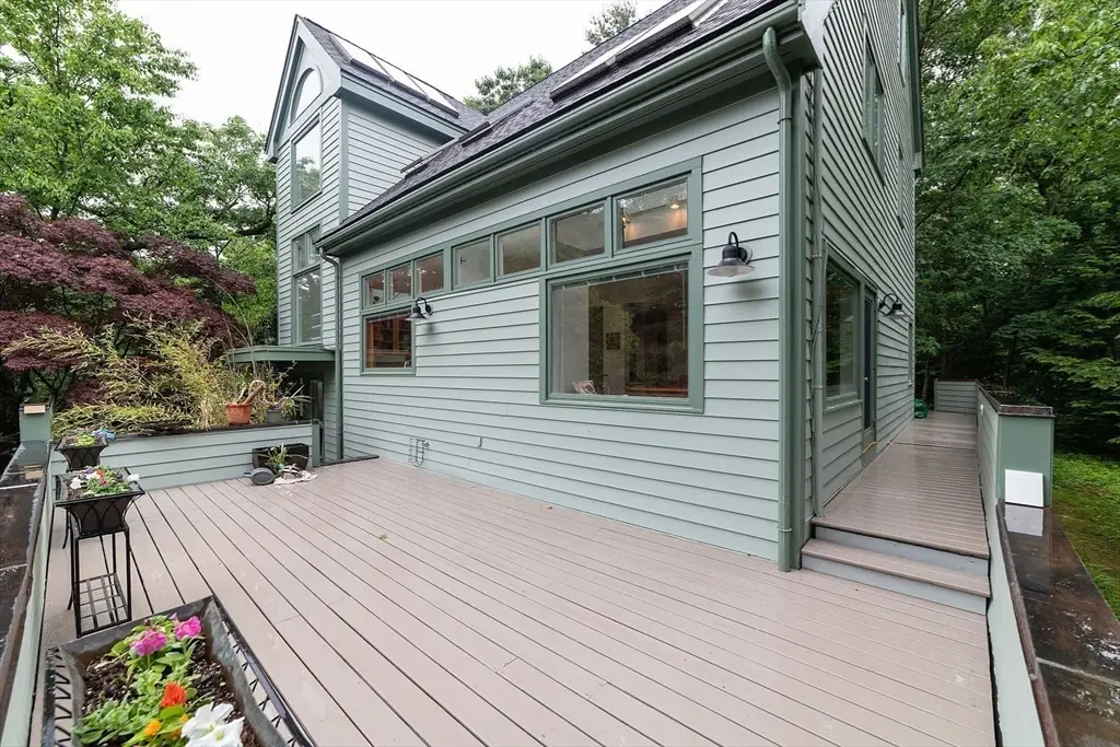 Impressive, custom built contemporary home on an expansive half acre+ wooded lot on tree lined street in Chestnut Hill. Designed by Harvard architect Mollie Moran includes sweeping 10 ft. cathedral ceilings & window walls overlooking lush park like multi level landscape. Elegant living room with marble wood burning fireplace accented with a wall of built-ins & a stunning entertainment sized dining room. Spacious, eat-in kitchen with built in window seat looks out onto private front deck. Adjoins a comfortable family room with wood burning stove & exits through triple patio door to another private deck. Second level includes two bedrooms, a bath & multiple closets with laundry. Also a king size en-suite primary bedroom & an additional office or media room that could easily be used as a bedroom. The third floor suite is perfect for teen or au pair. This is a one of a kind property! 2018 roof, high efficiency HVAC system & more. This is a must see.