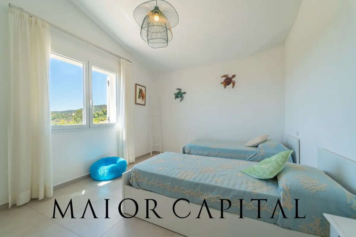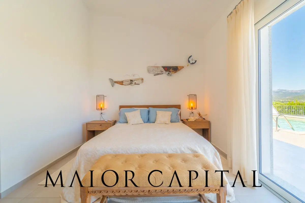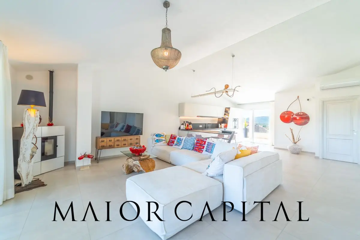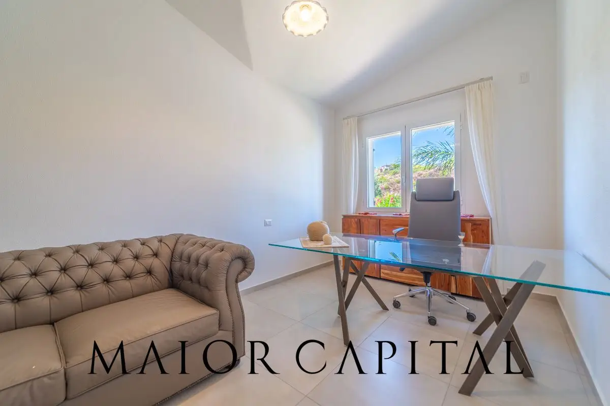 In Budoni, in an exclusive residential setting composed only of villas, we offer for sale a prestigious independent villa, immersed in tranquility and privacy. Located just 5 minutes from the main beaches and within short distance of all essential services, the property stands out for its perfect balance between architectural elegance and harmonious integration with the surrounding natural landscape.Mediterranean Garden and Sea View PoolThe exterior is an exclusive setting where every detail is designed to offer comfort, privacy, and beauty. The villa is surrounded by a lush Mediterranean garden, carefully landscaped with native and ornamental plants, and enhanced by a majestic centuries-old wild olive tree perfectly integrated into the outdoor paving. The private pool dominates the landscape, offering an open sea view and evoking pleasant emotions.Living Area: Brightness, Design, and Continuity with the OutdoorsA covered veranda welcomes guests and leads to the living area, where light tones and clean lines prevail, enhanced by natural light streaming through large windows. The visual effect is one of open, harmonious, and welcoming space. The atmosphere is enriched by vibrant decorative elements: brightly colored cushions, natural wood furnishings, and marine-themed artworks that add personality and a Mediterranean touch to the entire space.The living area is designed for maximum living comfort, with thoughtfully selected furnishings and a seamless connection between the living room and the kitchen. The latter, modern and minimalist, opens onto a second veranda, further increasing the brightness and creating a perfect synergy between indoor and outdoor spaces.Sleeping Area: Privacy, Functionality, and Direct Access to the PoolThe villa's sleeping area is designed to offer privacy, comfort, and excellent everyday livability. The spacious and bright master bedroom includes an en suite bathroom and boasts direct access to the solarium and pool, allowing for a continuous connection with the outdoors. Next to it, a second double bedroom, also with a private bathroom, ensures maximum comfort for guests or family members.A third room, currently used as a study, can easily be converted into an additional bedroom, making the layout highly flexible. Completing the floor is an extra bathroom with a large shower, a laundry corner, and direct access to the garden—perfect for daily use or returning from the pool or the beach.Elegantly Designed Lower FloorAn internal staircase leads to the basement level, characterized by a warm and authentic atmosphere. Here, we find a living area decorated with artisan elements, paintings, and marine-themed accents, all in perfect Mediterranean style. This level also includes a double bedroom and a bathroom with a spacious wall-mounted shower, finished with high-quality materials in neutral and relaxing tones.Budoni and Surroundings: Between Dream Beaches and Exclusive DestinationsThe center of Budoni, with its lively square, restaurants, boutiques, and all major services, is just a 5-minute drive away. Within less than 15 minutes are some of the most beloved destinations of the eastern coast, including San Teodoro, Porto Taverna, and Porto Ottiolu, known for their fine sandy beaches and crystal-clear waters.The city of Olbia, with its port and international airport connected to major European capitals, is easily reachable in about 30 minutes. Finally, within just one hour by car, one can reach Costa Smeralda™, the iconic destination of luxury tourism, with exclusive locations such as Porto Cervo and Baja Sardinia—symbols of the most refined Mediterranean lifestyle.Layout:Ground Floor* Covered veranda* Spacious living area* Open-plan kitchen overlooking a second veranda* Double bedroom with en suite bathroom* Twin bedroom with en suite bathroom* Study* Guest bath
