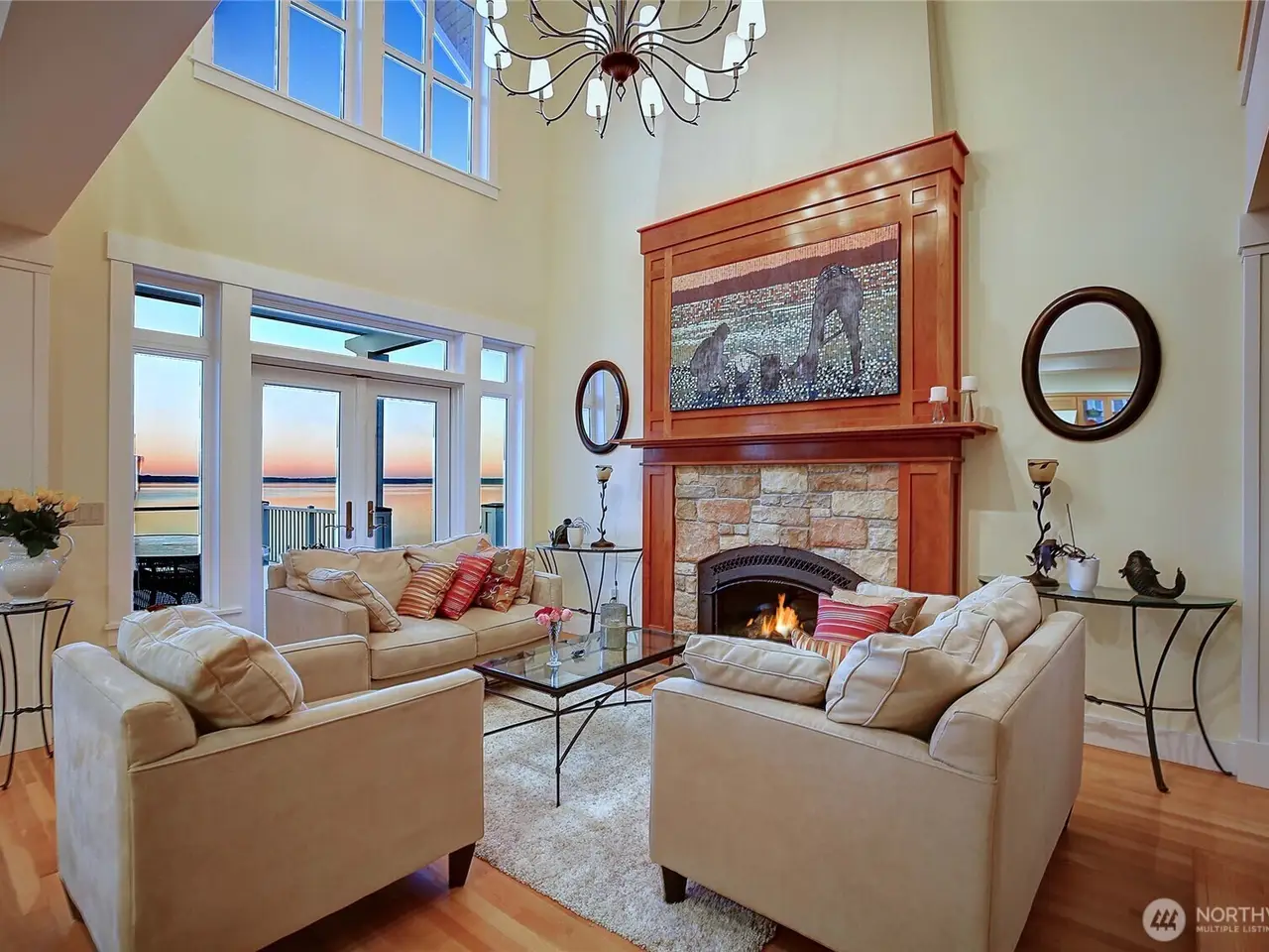 A rare find, this custom-designed home is strategically placed for maximum views and easy beach access. Upscale finishes and top quality throughout, complemented by impeccable maintenance, make this the perfect getaway. The main living area is open and spacious, beautiful kitchen with many quaint entertaining spaces. Plenty of room for all, the fully finished basement has its own living space and full kitchen. Expansive Western views include sunsets, boat traffic, wildlife activity, and a covered deck to enjoy it all. A newer concrete bulkhead offers room to entertain as well as easy access to the beach. Three-car garage with extra living or storage space above, mature and well-maintained landscaping with a gated entry. Captivating sunsets!