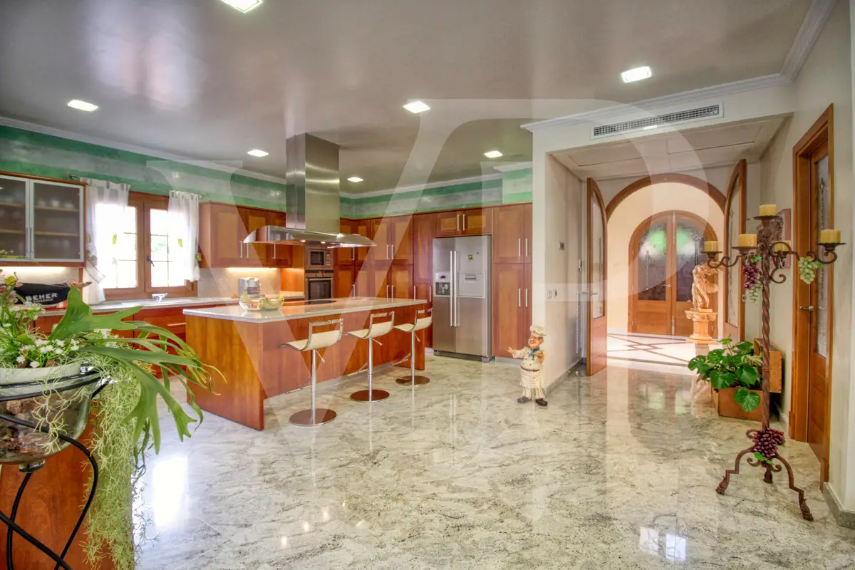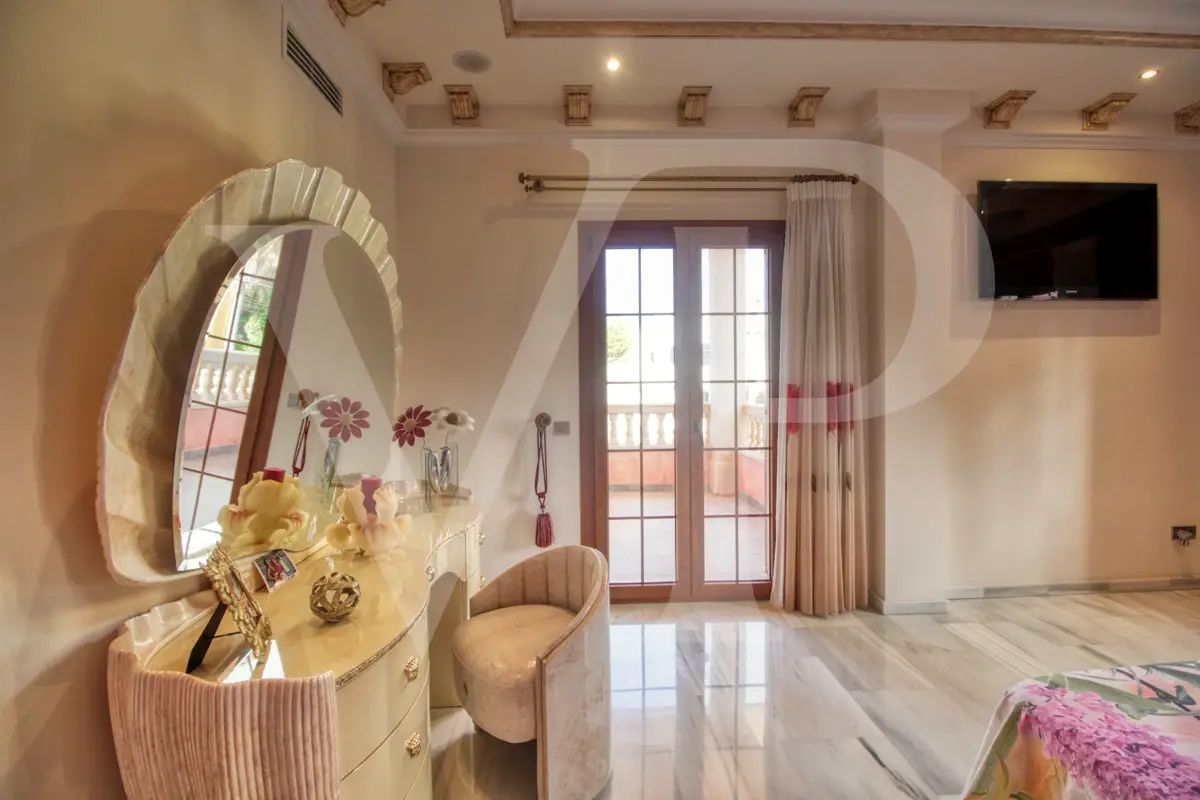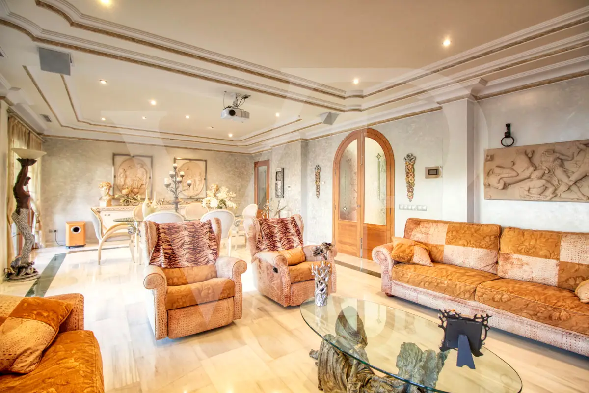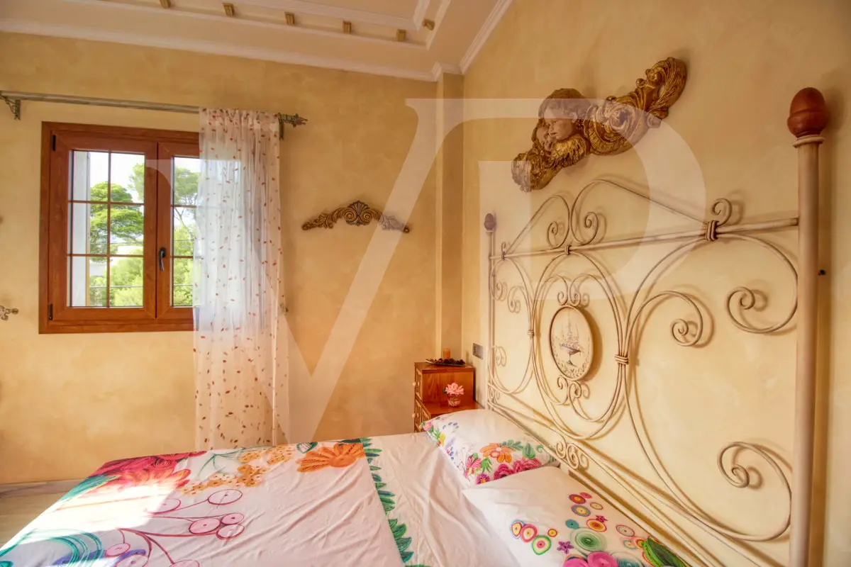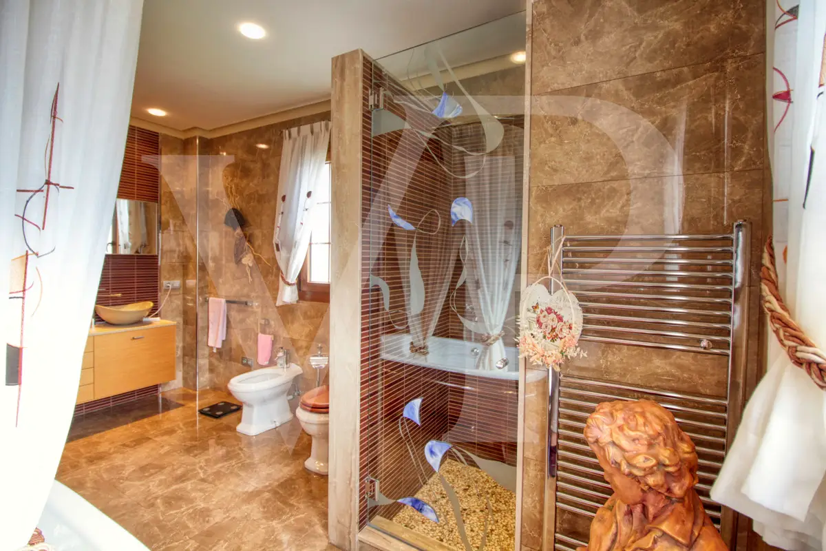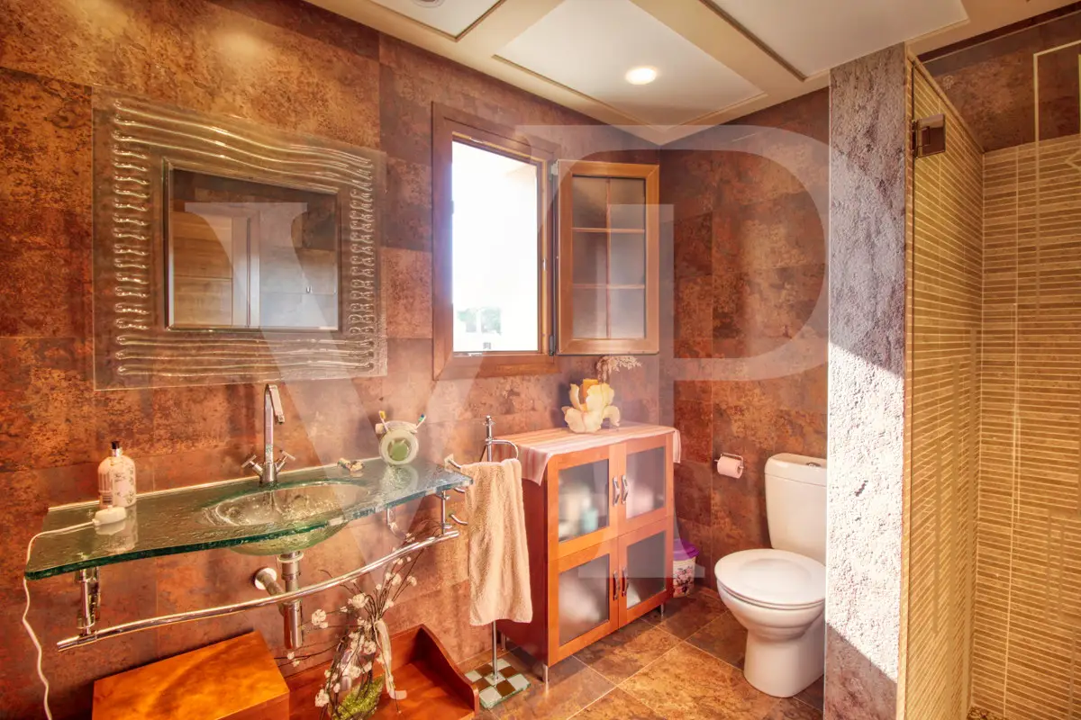 Spectacular villa with pool for sale in the Son Bauló urbanization in Can Picafort, 300 meters from the sea. The exterior of the property, in the style of a Mallorcan villa, has a fantastic heated saltwater pool of 26 square meters with roll-up structural cover, a covered barbecue and a large veranda of 100 square meters with outdoor lounge and dining room, many spaces and facilities for living to enjoy outdoors all year round. Garden area, a chicken coop and a large vegetable garden of 90 square meters, with the possibility of expanding the garden. Distributed over two floors, solarium tower and basement. The main entrance on the ground floor is accessed through the entrance hall, which connects the impressive living room and guest dining room, with a unique and personalized elegant decoration, equipped with beautiful leather sofas, high luxury furniture and exclusivity. Modern brand new kitchen, with solid oak furniture and wooden island, open to the dining room and east, with exit to the barbecue on the covered terrace as well as outdoor lounge and outdoor dining area. This floor has a double bedroom with dressing room and a beautiful bathroom, also has a laundry room. The beautiful spiral staircase leads to the first floor with 172 square meters. We arrive in the luxurious hall where one never tires of looking from all its angles and we find the master bedroom, from where we pass through the large dressing room of almost 24 square meters that connects the bedroom with designer furniture, as if in a constant dream and the spectacular bathroom with marble floors and walls, large shower and bathtub for true relaxation. A double bedroom and a bathroom like on the ground floor, as well as two further large bedrooms with large closets, a study and a living room. Distributed around the beautiful interior balcony. On the upper floor there is a beautiful tower with exclusive windows that provide the house with light throughout the day, custom-made with fused glass. There is also access to the 35 square meter terrace from which you can see the sea and the surrounding area. The basement of almost 270 square meters has a large garage for eight vehicles, hobby room, storage room, complete bathroom with shower and a fantastic kitchen with iron fireplace and oven, as well as dining area, living room, pantry, with access to a terrace and access also from the circular staircase . The property has a domotic installation with a system that automates the entire property, allowing you to control energy management, security, communication and well-being from inside, outside the house and from any country in the world using technology or mobile phone. The integration takes place via wired communication networks indoors and outdoors. It has numerous home automation installation elements such as PVC blinds on the veranda, security cameras, lighting, air conditioning, a music system with a network of speakers distributed throughout the house and the ability to control room by room. Cinema projector with motorized screen. Interior finishes in ash wood, white marble floors, stucco walls, installation of solar panels to support and save energy to use solar energy for hot water, underfloor heating and heating of the swimming pool. Air conditioning hot/cold via ducts. Very well preserved, thanks to the high quality of materials and good maintenance, this small palace is sold fully furnished and equipped with sublime taste. All the decoration has been carefully personalized by the owners, a great professional in this field. In addition, it offers many possibilities thanks to the large plot and the cellar.