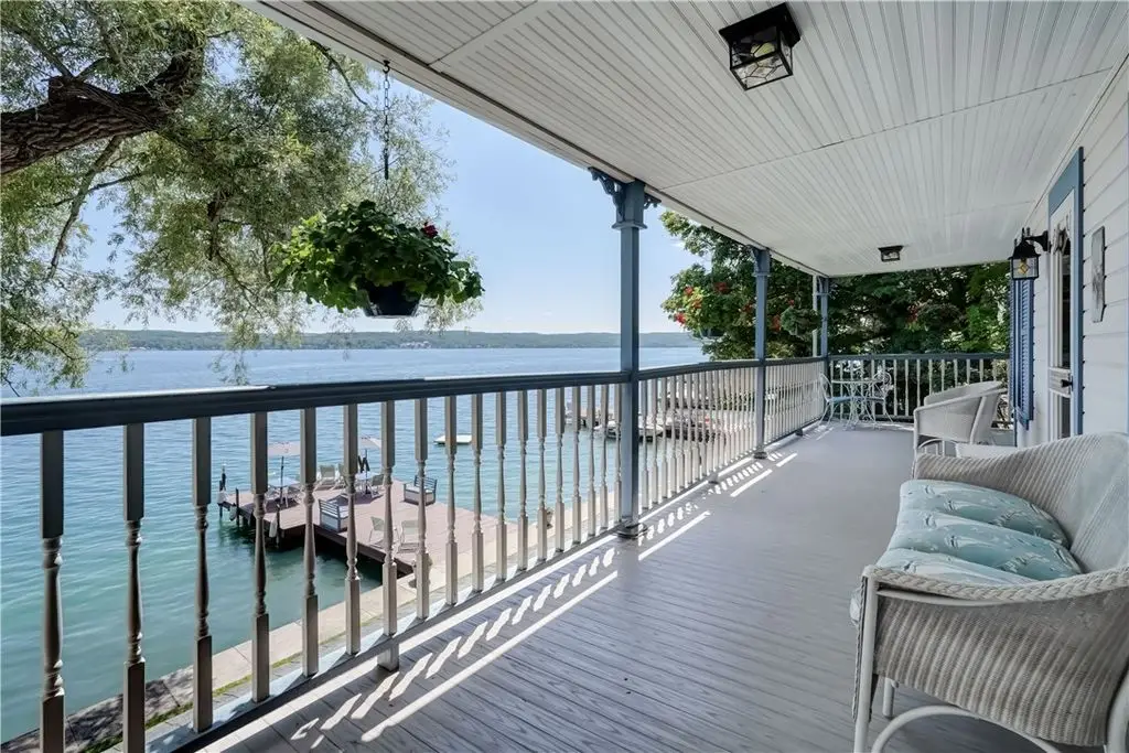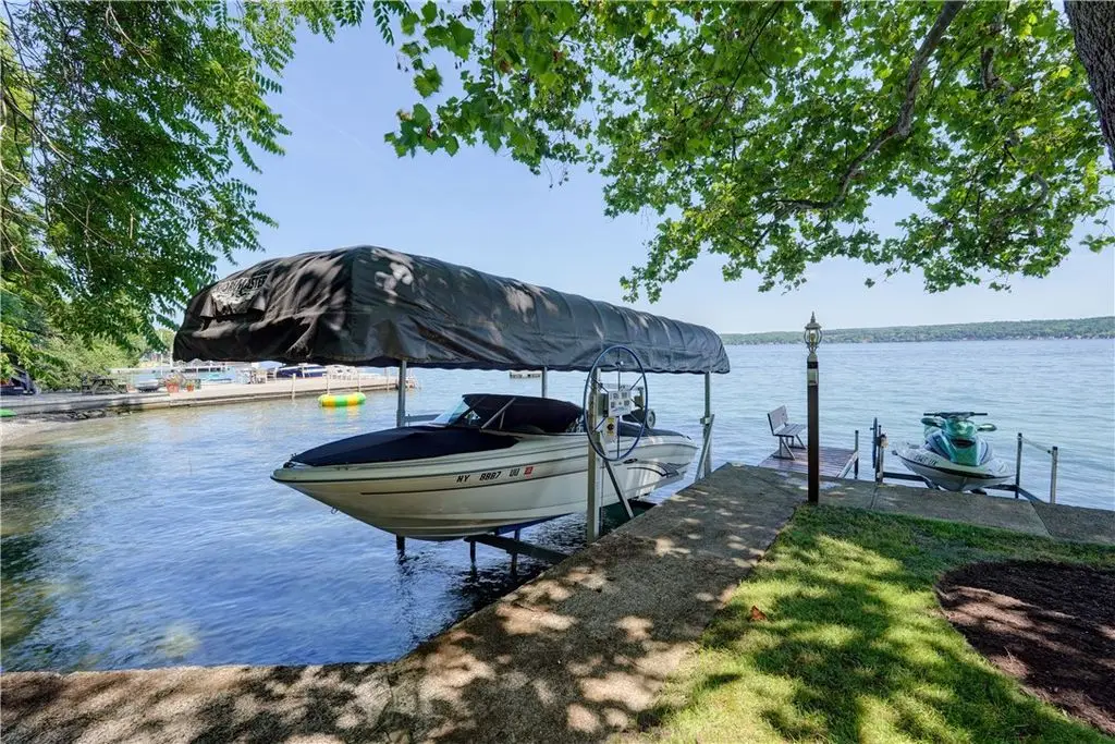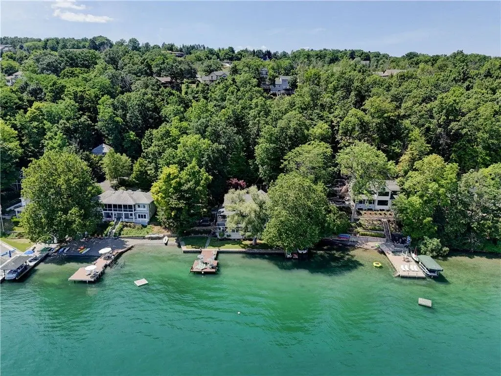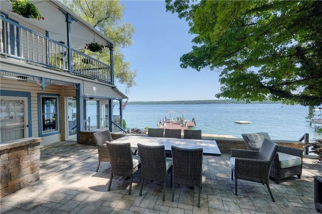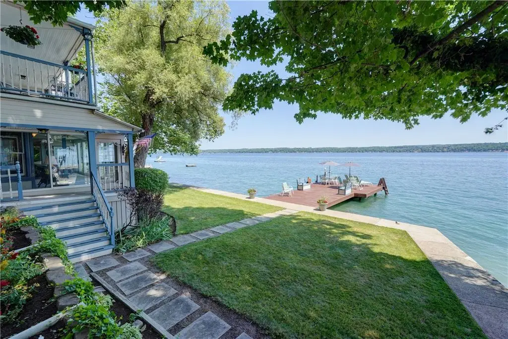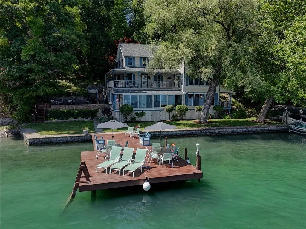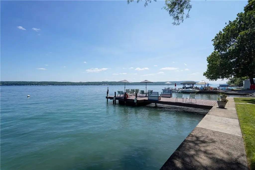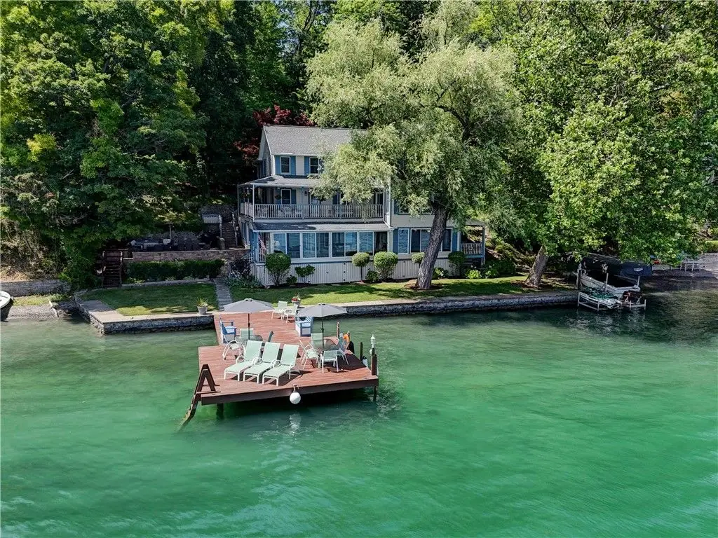 DON'T MISS THIS RARE OPPORTUNITY ON CANANDAIGUA LAKE!! This amazing offering features 140 feet of flat lake frontage with amazing waterfront views. This secluded 8 bedroom home off West Lake Rd. is located on private Davidsons Landing. This 4900 sq ft home has it all - with three full floors of living space. The first floor Great Room includes a wall of built-in bookshelves, a gas fireplace, and access to a large sunny enclosed porch. Beautiful woodwork encompasses two large eating areas, and a bright light-filled kitchen that has a large breakfast bar that has been updated with new SS appliances. On the second floor there is an oversized primary with a wall of windows framing exquisite lake views. A large walk-in closet, bathroom with shower, Jacuzzi tub, and a double vanity completes this spacious room. There is also a door that allows direct access to the open porch. The same floor has an additional bedroom, a full bath, as well as a convenient laundry room and adjacent utility room with loads of storage. The third floor has six bedrooms and two full baths with easy access to the outside. The exterior features an expansive stone patio off the kitchen for entertaining - as well as an open covered porch, large permanent dock, and boat hoist. This convenient location is only 4 miles from all the town of Canandaigua has to offer, including restaurants, shopping, marinas, and Wegmans! The property is serviced by public utilities for gas, water, sewer and high speed internet. Additional updates include; new driveway (2024) with large parking area, third floor carpeting (2020), two air conditioning units (2019), roof (2015), flooring (2018). Only permits on file with the town will be provided. Annual HOA approximately 2-3K per year. Please do not drive down the road without an appointment. Delayed showings begin July 26th at noon, and delayed negotiations beginning August 5th at 3p.m. Please allow 24 hours to respond to offers.