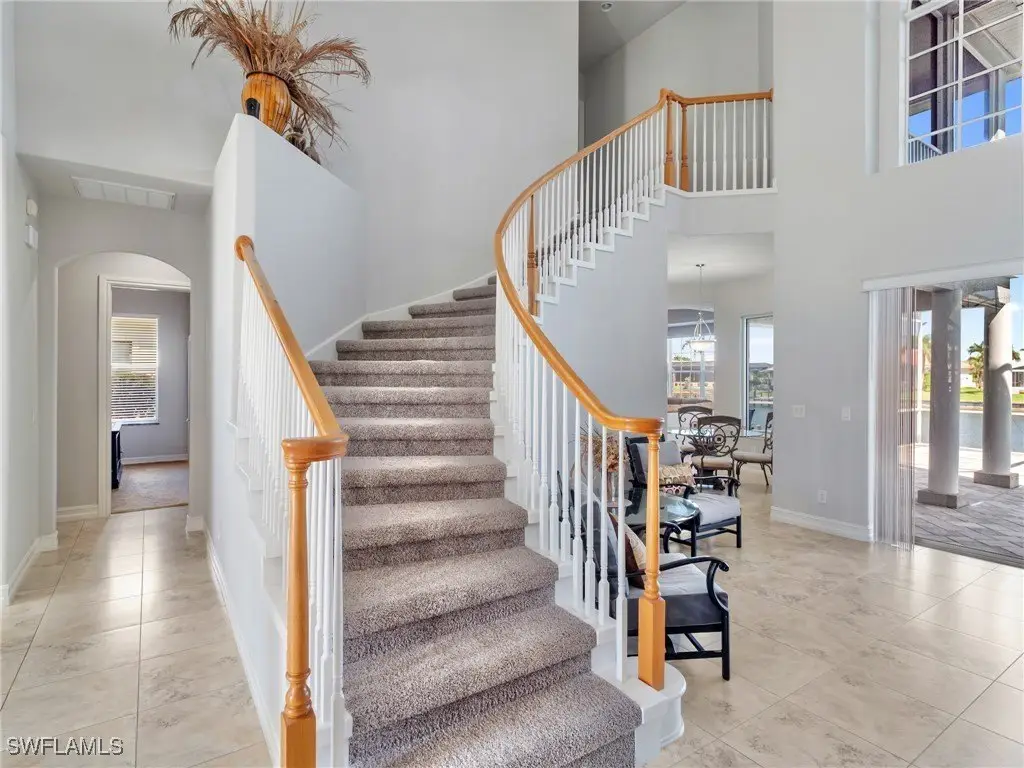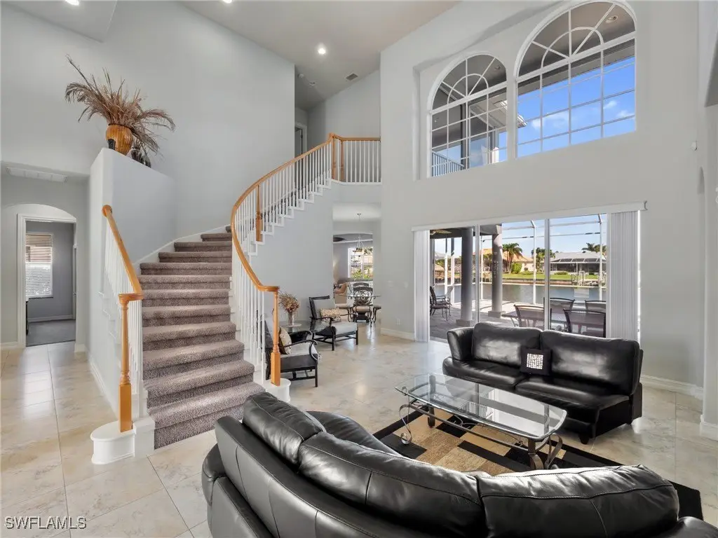 Minutes to Open Water! Beaches Close By! This unique, custom built healthy home features 5 bedrooms plus an office and is a rare gem offering Gulf access via a 210 ft wide canal. It includes a 116 ft concrete seawall and a private dock, is a true haven for boaters and water lovers. Imagine waking up to serene water views and enjoying breakfast by the waterfront. Relax in your private jacuzzi, go kayaking or fishing right from your backyard or take a peaceful boat ride to stunning beaches where you might spot dolphins and manatees! This home offers endless outdoor fun and is conveniently located near A rated schools. Located in one of the most desirable and private neighborhoods in SW Cape Coral, Florida, this safe and friendly community is perfect for walking, biking and enjoying a lifestyle like no other in the world! Designed for elevated waterfront living with peace of mind, this well maintained, solidly built home has never flooded, even during storms or hurricanes. It is designed for both beauty and resilience, with hurricane impact windows on the second floor and shutters on the first. Inside, the home welcomes you with a grand entryway with 17 ft ceilings, ample living space, including a formal living room with 24 ft ceilings and dining room 13 ft ceilings. It offers 5 bedrooms, a large office (or gym) 13 ft tray ceilings, 3.5 bathrooms, a beautiful kitchen with granite countertops and newer appliances, a generous breakfast coffee bar, a water view breakfast nook, a spacious pantry and an area designed for a future elevator, laundry room with cabinets and sink and a 2.5 car garage with 12 ft ceilings. A beautiful staircase connects two loft areas, one on the main level and another upstairs, offering flexible spaces for lounging. The upstairs loft leads to the private, water view primary suite (16x16 ft), which features 10 ft tray ceilings and a screened balcony overlooking the canal. The suite includes his and her walk in closets and a spacious master bath with a large double sink vanity, a third separate vanity with a single sink, a central soaking tub, a large shower with built in seating and a linen closet. Oversized custom pool with a 6 jetted spa and a newer, expansive tall screened lanai, perfect for enjoying serene waterfront views in comfort and style. Inside this lovely home you will have abundant light, storage and generous ceiling heights throughout. Additional spacious driveway that can accommodate up to 7 cars. This waterfront home is a perfect blend of durability, expansive living spaces and waterfront appeal. Just minutes from Cape Harbor, Rumrunners, shops, Tarpon Point Marina, waterfront restaurants, supermarkets, ice cream shops, coffee shops, the post office, pharmacy, medical offices and more. All located in one of the most desirable areas of SW Cape Coral! This is your chance, take it! Schedule your private tour today and experience everything this home has to offer.