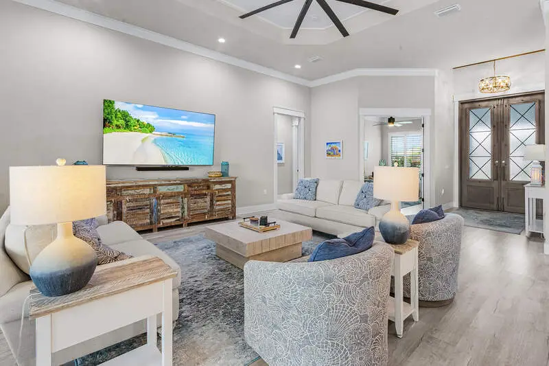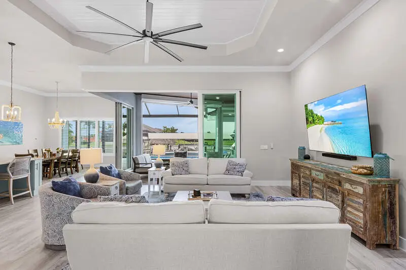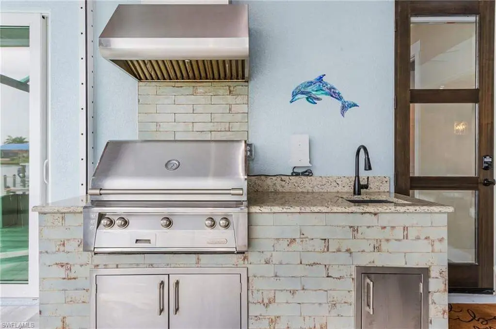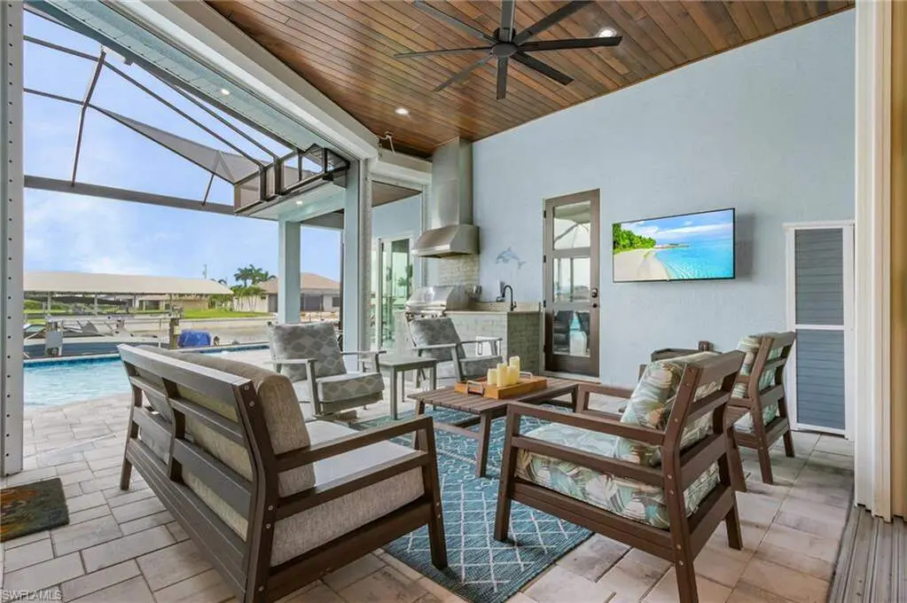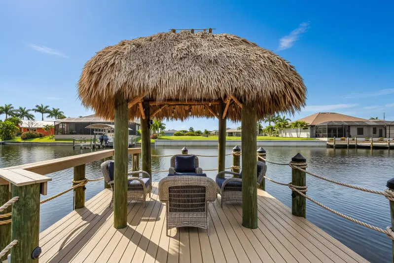 Welcome to a truly exceptional waterfront masterpiece! This custom-built home offers the pinnacle of luxury living with Gulf access and just 25 minutes to open water. Enjoy breathtaking intersecting canal views, and imagine watching boats or spotting manatees right from your backyard. Designed for elegance and entertaining, step inside through the magnificent 10-foot iron entry doors into a great-room concept with soaring 14-foot ceilings and two stunning 90-degree sliding doors that seamlessly blend indoor and outdoor living. With over 2,800 square feet, 4 bedrooms plus a den, and 3 full bathrooms, this home is the perfect blend of design and function. The gourmet kitchen features high-end appliances and a butler's pantry for added convenience. A whole-house reverse osmosis system, impact windows and doors, and a metal roof provide luxury and peace of mind. An Automatic Whole House generator with a 500-gallon tank ensures comfort and reliability year-round. Step outside to your private paradise: an impressive sparkling swimming pool with a built-in spa, an outdoor kitchen, and a custom bar perfect for entertaining, surrounded by an expansive screened lanai designed for year-round enjoyment. For the boating enthusiast, the property offers an 85-foot captain's walk, a 30-foot canopy-covered dock with a 14,000-pound boat lift, plus a 10x10 Tiki Hut for relaxing by the water. The fenced backyard ensures privacy while you enjoy the true Southwest Florida lifestyle. The three-car garage is fully decked out for car enthusiasts, featuring custom oversized garage doors, air conditioning, and overhead storage. This home has so many incredible features and upgrades that we can't possibly fit them all into one description. You simply must see it in person to appreciate everything it has to offer. Located in the highly desirable and sought-after area of Northwest Cape Coral, this home is close to all of life's daily essentials and just minutes from shopping, dining, and entertainment. Schedule your private tour today!