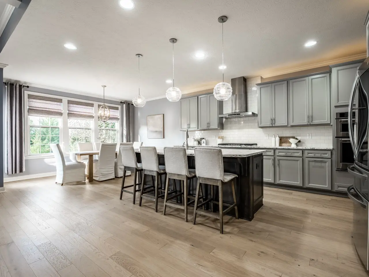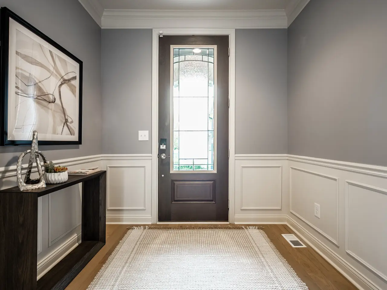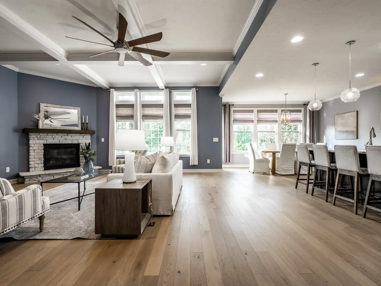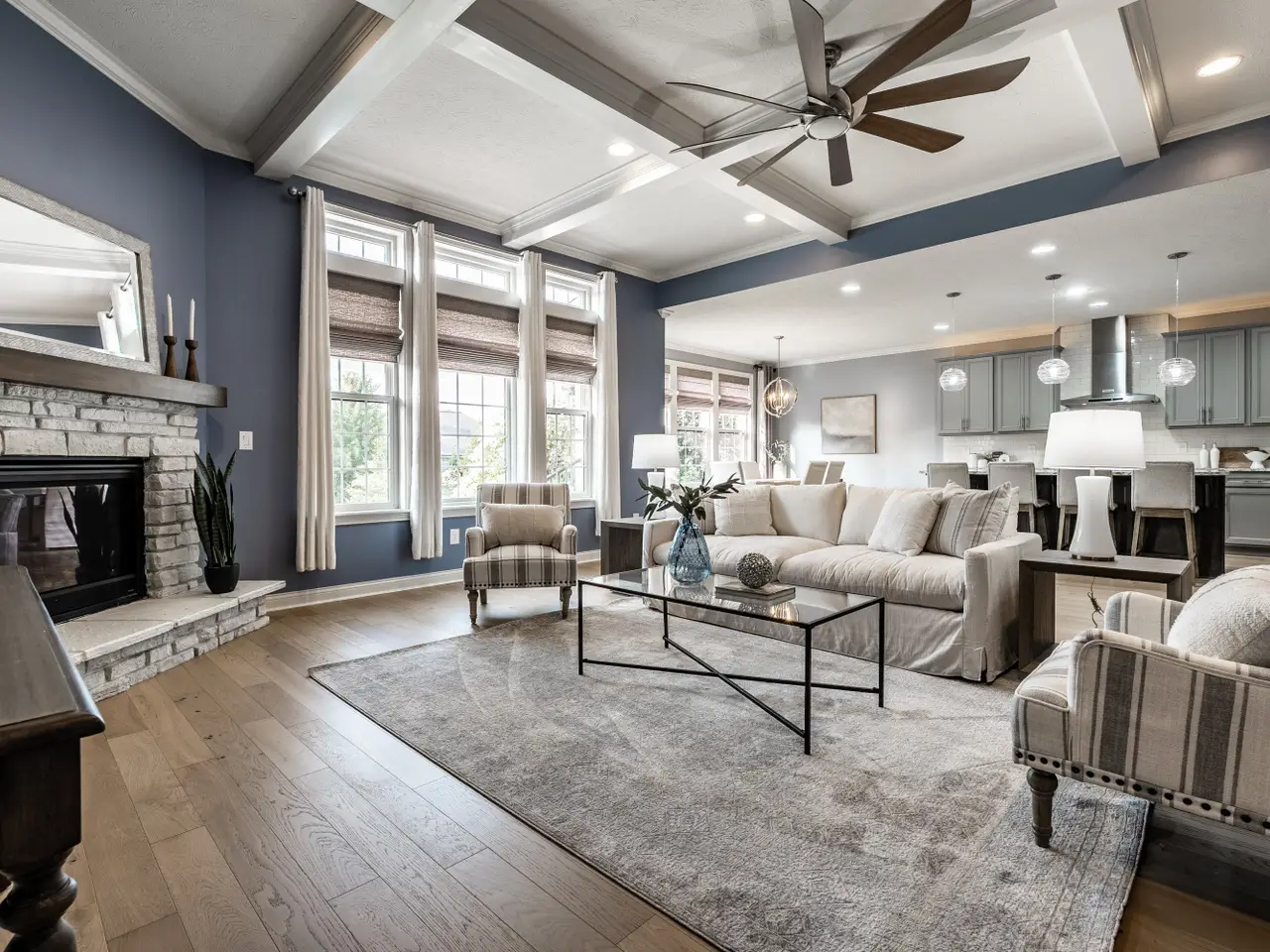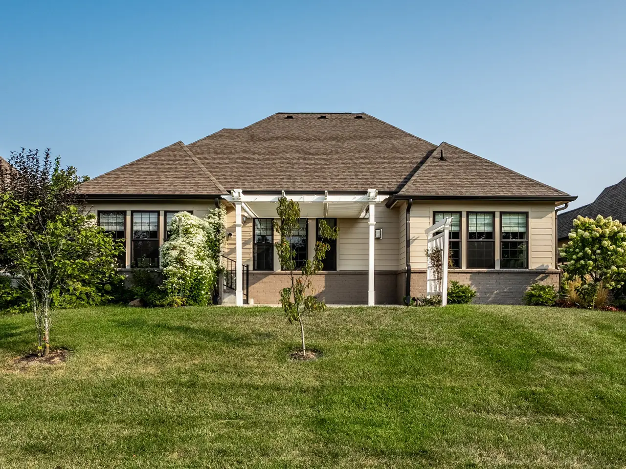 Welcome home to this exquisite 3bd/3.5ba ranch home w/ finished basement. The French country-inspired facade, hearty stone siding & impeccable landscaping create a stunning first impression, complemented by an extra-wide two-car garage. Step inside to a spacious foyer & welcoming main floor featuring engineeered hrdwd flooring & natural light throughout. Dedicated home office w/ crown molding & ceiling fan offers a perfect work-from-home space. Secondary bdrm on main inclds a closet, full bath & beautifully tiled shower. Elegant formal dining rm showcases a warm custom wood tray ceiling, wainscoted walls & decorative chandelier. The great rm boasts coffered ceilings w/ recessed lighting & ceiling fan, cozy stone gas log fireplace w/ wood mantle. Breathtaking kitchen, complete w/ gleaming quartz counters, large center island, tile backsplash, SS apps & gas cooktop w/ chimney range hood. Butler's pantry/coffee bar offers extra cabs + an oversized walk-in pantry. Primary ensuite features a tray ceiling, recessed lighting, expansive walk-in closet w/ dark wood shelving, integrated drawers & hanging rods for clothes. Spa-like primary bathroom inclds a dbl vanity, ample cabs, tile floors, walk-in tiled shower & separate walk-in upright whirlpool tub. Laundry room w/ a washer & dryer, ample cabs, tile floors, utility sink & folding counter. Mudroom features built-in cubbies, hanging hooks & storage closet. Garage is finished, extra-wide two-car w/ epoxy flooring. Expansive finished basement provides extra living space w/ carpeted floors, electric fireplace & recessed lights, full bathrm w/ tub/shower, vanity & tile flooring. Third bdrm inclds carpeted flooring, a closet, rough-in for ceiling fan & egress window. Huge unfinished area for addtnl storage. Home is equipped w/ a Generac generation system for added peace of mind. Enjoy a great location w/ neighborhood walking trails, close proximity to schools, shopping, dining & all that the City of Carmel has to offer!